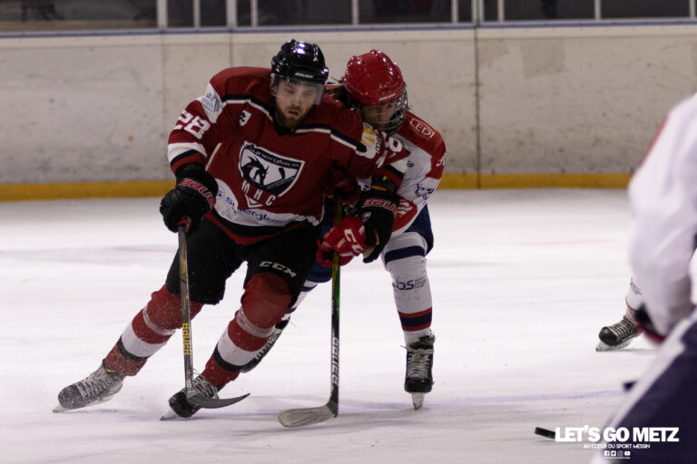 593 Evoluant au 4ème échelon du hockey sur glace français, le Metz Hockey Club a de grandes ambitions. Les messins recevaient Lyon, leader de D3 ce samedi à la Ice Arena, à côté de Saint-Symphorien. Œil sur cette équipe qui commence à faire parler d’elle à l’échelle locale. Le hockey sur glace français se décompose en 4 échelons à l’échelle nationale : Ligue Magnus, le championnat professionnel françaisD1 (Division 1)D2 (Division 2)D3 (Division 3) Vous l’aurez compris, Metz évolue au dernier échelon national français. Et pour cause ! Le Metz Hockey Club a été fondé en 2018 et est venu pallier la dissolution du « Hockey Club Metz Moselle Lorraine ». Christophe Fondadouze est le président du club.A titre de comparaison, le voisin Amnéville évolue en D2, un échelon au-dessus. Mais pas de concurrence malsaine entre les deux fiefs ! Metz et Amnéville veulent au contraire faire de leur proximité une force à l’échelle du hockey français. En effet, il est rare de trouver deux clubs distants de 20km en France. Une identité sous le signe du Graoully Vous l’aurez aisément compris, le Metz Hockey Club joue à fond la carte du Graoully. S’il a disparu du blason du FC Metz, il figure en évidence sur celui du MHC. Nous pouvons également remarquer une croix de Lorraine, discrète mais efficace, en haut à gauche de ce maillot grenat. (Cf l’image ci-dessus)Le parallèle avec l’identité historique du FC Metz est évident. Les hockeyeurs de Metz se surnomment eux-mêmes les « Graoullys, dragons tout droit sortis de la glace ». Un moyen assez simple d’entrer dans l’imaginaire collectif des messins. Cette stratégie de communication se traduit également par un marchandising tourné vers le grenat. Voici une partie des produits dérivés du Metz Hockey Club. Sportivement, ça vaut quoi le Metz Hockey Club ? Après avoir joué les yeux dans les yeux avec Lyon le leader de D3, Metz s’est incliné 6-5 au terme d’un match renversant à la Ice Arena. Les Graoullys figurent dans le top 3 de leur Poule de D3 avec un match d’avance, au coude à coude avec des adversaires comme Dijon ou Strasbourg. Le MHC pourrait ainsi disputer les playoffs. Une progression constante pour ce club qui tutoyait le fond du classement à ses débuts en D3. Classement de la Poule C de D3 au matin du dimanche 24 octobre 2021. (Source : Fédération Française de Hockey sur Glace) Les progrès sont tels que les Grenats peuvent espérer disputer les playoffs d’accession en D2 en fin de saison ! Pour cela, il faut figurer parmi les 6 premiers de sa poule. Mais pour éviter un adversaire de gros calibre, il est préférable de terminer le plus haut possible en saison régulière.Les 6 premiers des quatre poules de D3 se retrouvent donc à l’issue de cette saison régulière. 24 équipes se battent alors pour deux billets en D2, sous forme de confrontation directe aller-retour comparable à la Ligue des Champion en football. Autant vous dire que l’erreur n’est pas permise en postseason. Metz Hockey Club, tout proche de faire tomber le leader Lyon (5-6) Un gros test se présentait aux Grenats ce samedi à la Ice Arena. Le leader Lyon, invaincu. Metz devait livrer trois tiers-temps de 20 minutes parfaits pour espérer l’emporter. Les choses commençaient mal pour le MHC qui concédait rapidement l’ouverture du score, avant d’égaliser dans la foulée. Bis repetita plus tard dans le 1er tiers-temps, et même réaction des Grenats. Les deux équipes se séparaient sur un score de 2-2 à la fin du premier acte.Les Graoullys allaient alors réaliser un second tiers-temps exceptionnel, marquant deux buts coup sur coup et prendre une avance de 4-2. Une avance qui a malheureusement fondu lors du 3ème tiers. Lyon remettait les pendules à l’heure et marquait 4 buts d’affilée pour porter le score à 6-4.Les messins prenaient alors un gros coup derrière la tête mais continuaient à se battre avec leurs armes, malgré la supériorité de l’adversaire sur le papier. Le MHC revenait à 6-5 à 3’25 de la fin du match.Le palet de l’égalisation était même dans les crosses messines dans les derniers instants de la rencontre, mais ce n’est pas passé pour cette fois-ci. Malgré la défaite, les Grenats ont répondu présent dans ce gros test de D3. Metz Hockey Club (5-6) Lyon, les buteurs Metz :Maccioni (3’57), Le Guen (16’13), Eriksson (31’13), Stablo (39’09), Benchabane (56’35)Lyon :Kubovcik (3’21), Kulha (13’31), Kubovcik (40’36), Mouret (45’07), Portier (47’05), Kulha (54’21) La galerie de la rencontre Maillot frappé du Graoully, le Metz Hockey Club arpente les patinoires de D3. Crédit photo : Julien Buret/LGM