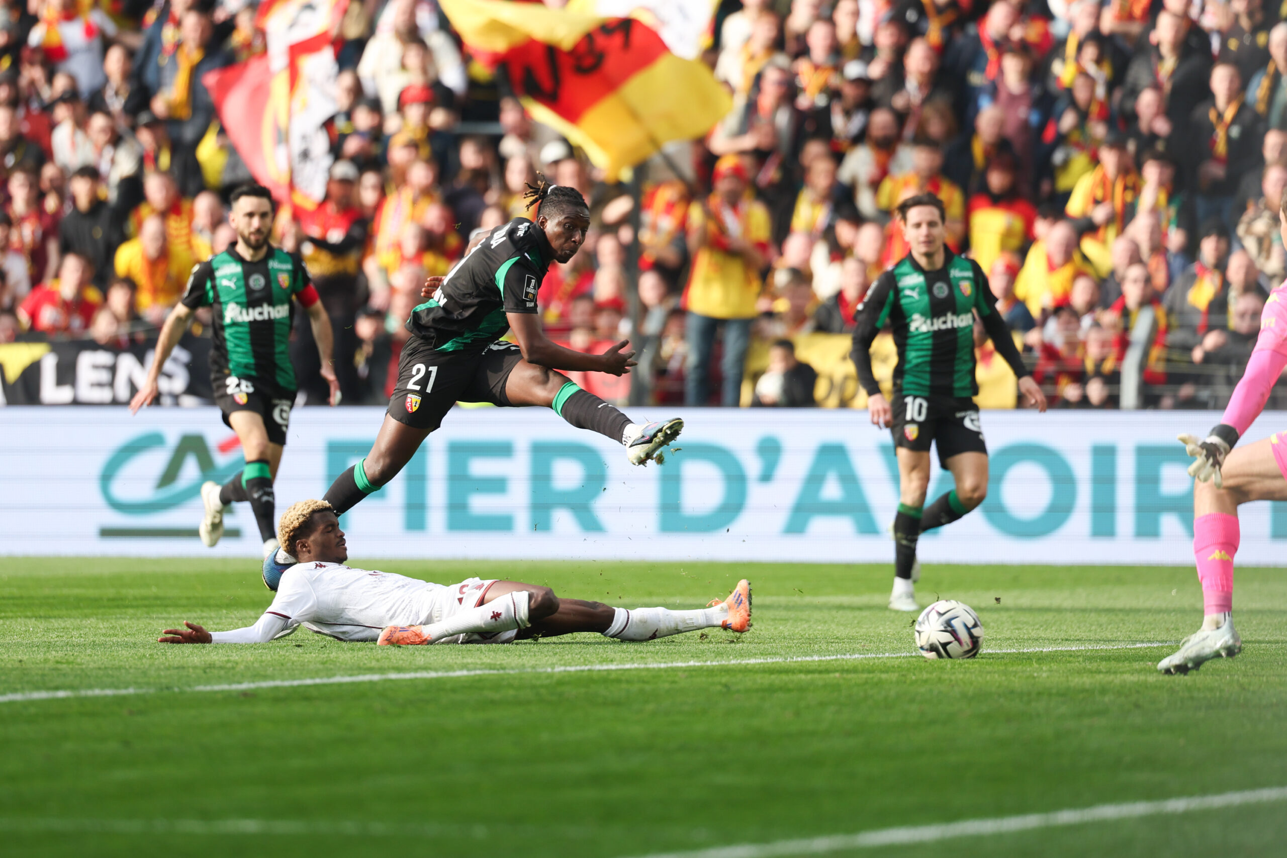 283 Dans un stade Bollaert-Delelis à guichets fermés pour la 81e fois de suite ce dimanche 8 mars 2026, le FC Metz a laissé le RC Lens dérouler tranquillement jusqu’à ce que les joueurs de Pierre Sage ne trouvent la faille… puis se mettent à l’abri, sans forcer (0-3). Pendant un temps, on a bien cru qu’ils allaient refaire le coup ce dimanche. Ce coup de ce soir de septembre 2023 où les Messins repartaient miraculeusement du Bassin minier avec les trois points, une victoire 0-1 acquise avec deux uniques tirs, quand les Lensois en avaient tentés trente et un. Les Sang et Or avaient pourtant tout fait pour se rendre la tâche facile dans cette semaine à trois matchs : la composition alignée ce dimanche était la même que celle qui est allée s’imposer, au bout d’un match marathon, à Lyon en Coupe de France. Avec la volonté, sans doute, de plier l’affaire au plus vite. Or, c’est peu dire si ils ont dû faire preuve de patience. À chaque tentative, les Nordistes tombaient sur une patte messine qui traînait par là où un Jonathan Fischer prompt à faire des arrêts décisifs. Les occasions lensoises avaient beau se multiplier, la faille ne s’ouvrait pas et d’aucuns pouvaient se rappeler à leur mémoire le traquenard de ce soir de septembre… Matthieu Udol a bien failli marquer contre son club formateur, mais il a buté à deux reprises sur Jonathan Fischer. Photo : Johnny Fidelin/Icon Sport Quart d’heure d’enfer Jusqu’à cette fatale 44e minute. Quand Florian Thauvin se défaisait de Sadibou Sané et Bouna Sarr, avant de servir Adrien Thomasson dans la profondeur. Le centre puissant qui s’ensuivait trouvait la malheureuse cuisse d’Alpha Touré qui contrait… et remettait le ballon dans le jeu lensois, laissant à Saud Abdelhamid tout le loisir de fusiller le pauvre Jonathan Fischer au bout du compte (44′, 1-0). Le bruyant public de Bollaert pouvait exulter et– surtout – respirer. La mi-temps n’y changeait rien, la machine était déjà lancée. Dix-neuf secondes seulement après le retour des vestiaires, Florian Thauvin concluait avec classe une action où les Messins n’ont pu que constater les dégâts, impuissant face à la maestria d’une équipe de ce standing, regardant simplement les passes arriver et repartir sans pouvoir répondre (46′, 2-0). « Ce soir, on n’a pas répondu athlétiquement dans le duel », constate amèrement Benoît Tavenot, qui est apparu la mine fatiguée en conférence de presse. Florian Thauvin et Bouna Sarr au duel. Photo : Johnny Fidelin/Icon Sport Le troisième but de Amadou Haidara, fruit d’un une-deux bien senti avec l’ex (et regretté) Grenat Matthieu Udol quelques minutes plus tard (52′, 3-0), relevait déjà presque de l’anecdote pour les quelques dizaines de supporters messins ayant fait le déplacement jusque dans le Pas-de-Calais, le nez dans leurs téléphones ou le regard ailleurs. Après ce quart d’heure en enfer, les Messins tentaient bien de réagir par l’intermédiaire d’Alpha Touré ou du jeune Nathan Mbala, qu’on aimerait désormais voir plus souvent fouler la pelouse sous le maillot du FC Metz. Bien trop peu toutefois, dans l’ensemble, pour inquiéter le gardien lensois Robin Risser. « Fraîcheur mentale » « Moi, je ne retrouve pas l’énergie qu’avait mis l’équipe sur mes premiers matchs avec elle. Je ne la retrouve pas », persifle le technicien corse. « Aujourd’hui, ce qu’on fait, c’est très largement insuffisant. J’en suis le premier responsable », assume-t-il, toujours à la recherche d’une victoire après sept matchs passés sur le banc messin. Mais Benoît Tavenot, on le sent, ne sait plus vraiment quoi faire non plus avec un groupe qui manque cruellement de « fraîcheur mentale ». « Aujourd’hui, j’ai des joueurs qui sont bouillis, assure-t-il. C’est la réalité. » « Est-ce que c’est constitutionnel [de leur état] ou est-ce que c’est notre état athlétique ? Aujourd’hui, je n’ai pas la réponse. Est-ce qu’il faut que je calme les entraînements pour avoir plus de joueurs le week-end? Ou au contraire, faut-il que je les augmente pour avoir plus de joueurs le week-end ? Ce sont des choses à régler », s’interroge le coach messin, sans pouvoir apporter ne serait-ce qu’un début de réponse. Face au temps qui presse, c’est dans l’indifférence presque générale qu’évolue désormais un effectif déjà enterré par « tout le monde », dixit Jessy Deminguet, soit « toute la Ligue 1 et tous les journalistes » et sans doute une bonne partie des supporters messins. Dans les travées de Bollaert, on ne s’y trompait pas : une fois l’affaire bien emballée, les différents groupes ultras se sont laissés aller à faire la chenille dans le stade… Que dire, alors, quand le tableau est à ce point noirci ? « Qu’il reste neuf matchs, neuf finales, qu’on va tout donner », essaie Jessy Deminguet. « Treize matchs sans victoire, ça fait beaucoup, ça fait mal à la tête. Mais comme je l’ai dit juste avant, je vais continuer à y croire tant qu’on peut le faire. » au stade Bollaert-Delelis de Lens (Pas-de-Calais), Mehdi Abirez. RC Lens 3 – 0 FC Metz Lens : Risser – Celik (Haidara, 45′), Ganiou, Sarr – Abdulhamid, Thomasson (c), Sangaré (Bulatovic, 73′), Udol – Thauvin (Sotoca, 63′), Edouard (Fofana, 63′), Sima (Bermont, 83′). Metz : Fischer – Ballo-Touré (Mboula, 72′), Sané, Gbamin, Colin – Munongo (Mbala, 54′), Touré – Sarr (Tsitaishvili, 72′), Traoré (Deminguet, 45′), Kvilitaia (Hein, 54′) – Diallo (c). Buts : Abdulhamid (43′), Thauvin (46′), Haidara (52′), Avertissements : Gbamin (14′), Touré (45′), Mboula (90′). Arbitre : Mathieu Vernice. Affluence : 37 381 personnes, guichets fermés.