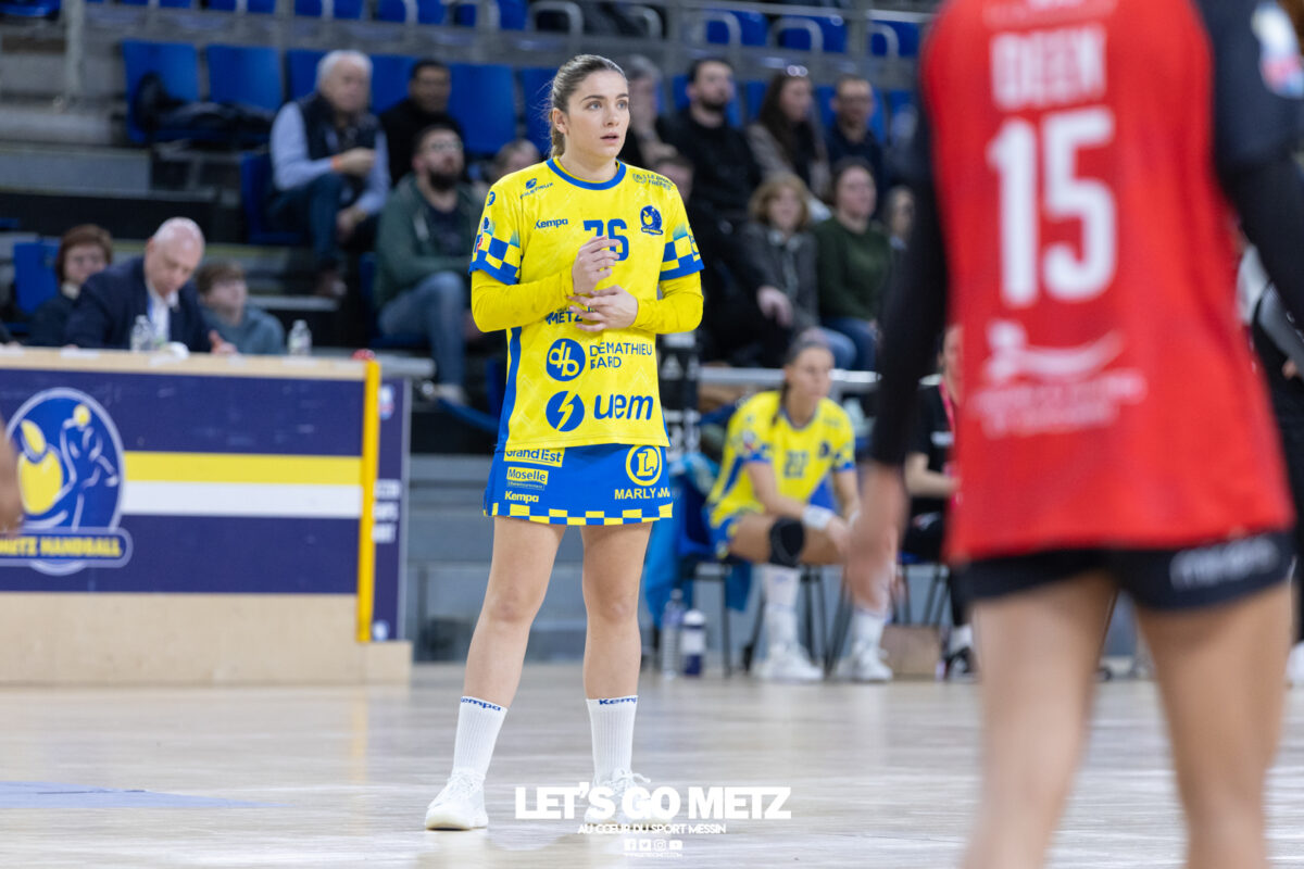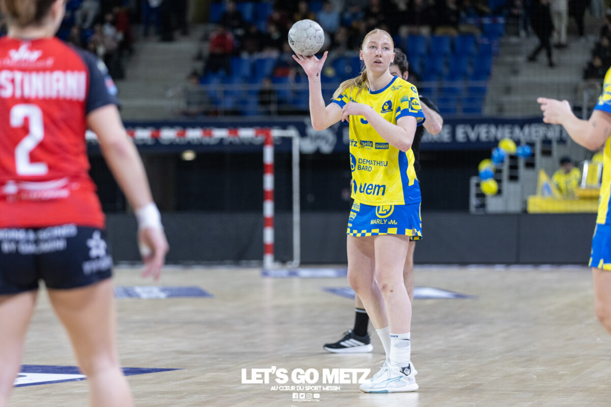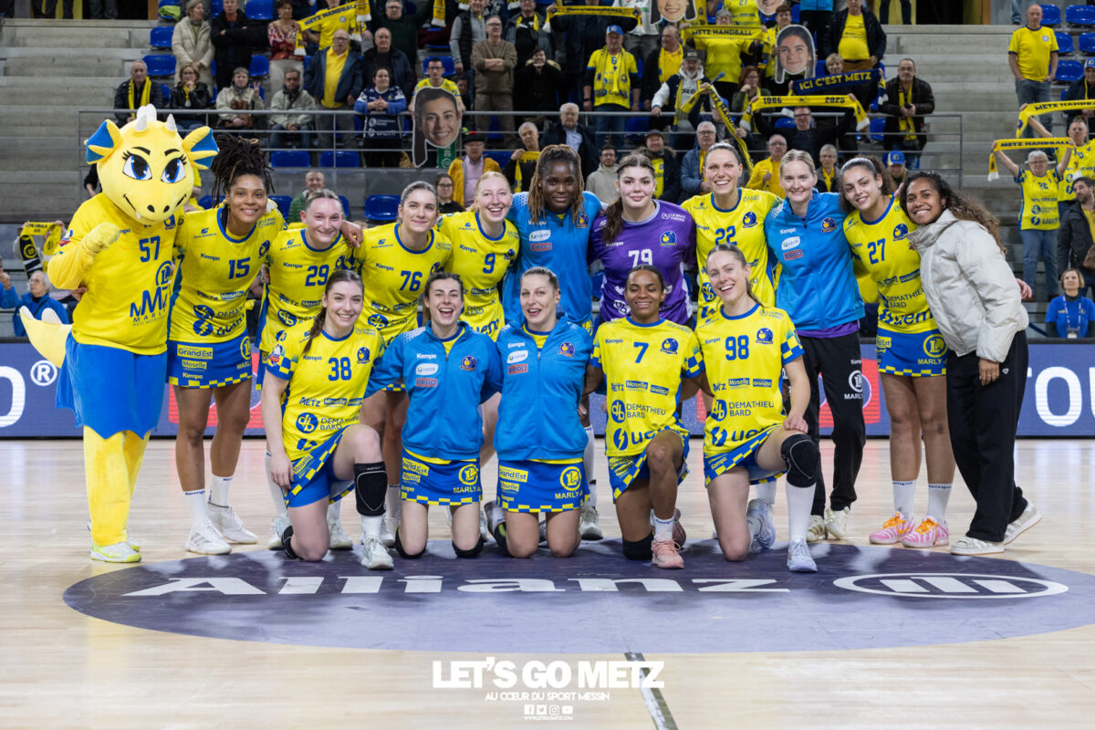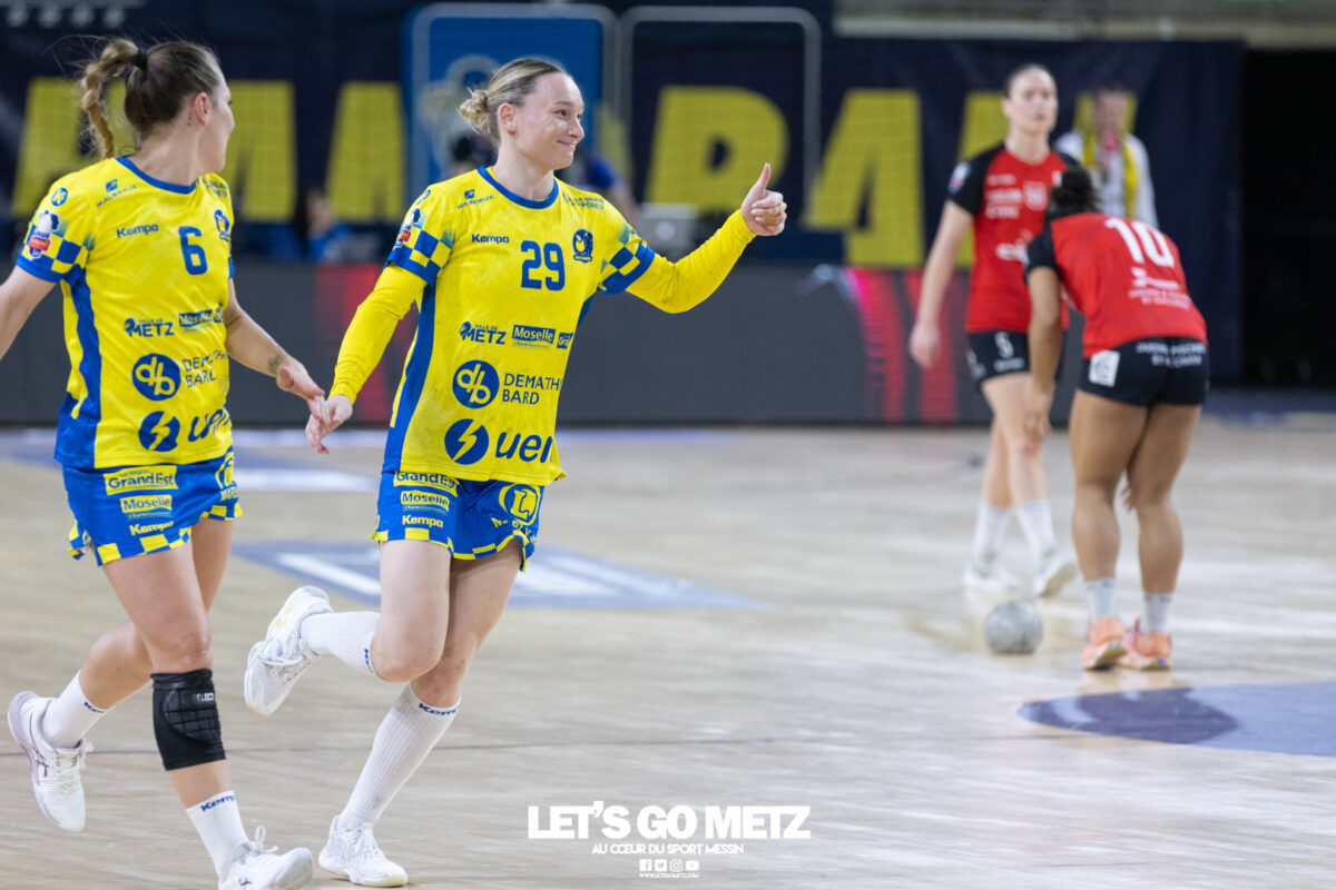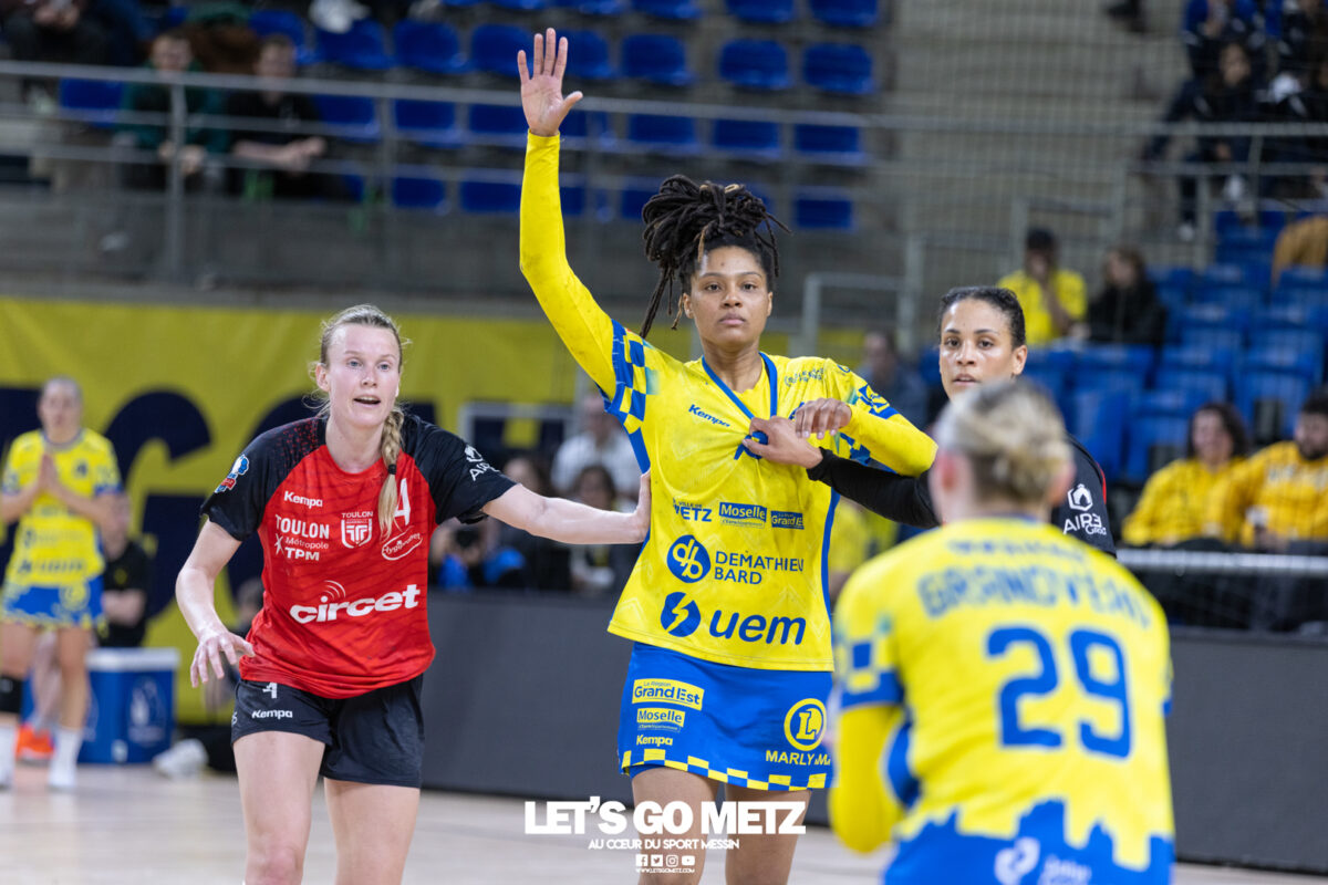 43 Metz Handball maintient la pression sur Brest en gagnant face à Toulon ce mercredi (34-26) malgré un niveau de jeu irrégulier. Ces matchs de Ligue Butagaz Energie placés entre deux rencontres de Ligue des champions sont toujours difficiles à analyser. D’autant plus lorsque le match qui suit peut offrir une qualification directe pour un quart de finale européen. Cette opposition entre Metz Handball et Toulon n’a pas dérogé à la règle. Joué entre la victoire acquise samedi dernier face à Gloria Bistrita et le déplacement programmé à Dortmund ce dimanche (14 h), ce duel de clubs aux ambitions opposées, s’est terminé sur la victoire du favori messin (34-26). L’essentiel est là pour les Dragonnes. Toutefois, comme c’est désormais le cas depuis le début de cette année civile, les amoureux du beau handball peuvent être frustrés. Le jeu des Jaune et Bleu manque de fluidité et d’efficacité depuis janvier. Metz Handball a mis du temps pour prendre l’ascendant sur Toulon On aurait pu penser que la réception de Toulon permettrait aux partenaires de Chloé Valentini de retrouver une base défensive solide lui laissant la possibilité de dérouler leur jeu sur grand espace. Et par la même occasion creuser progressivement un écart assez significatif afin de pouvoir rapidement faire tourner le collectif. Il n’en était rien tant le premier acte était serré. Si Metz Handball prenait trois buts d’avance au terme de son premier tiers (7-4, 11e) après des réalisations de Sarah Bouktit, Lylou Borg et Chloé Valentini, cet écart s’amenuisait rapidement. Les Varoises parvenaient même à égaliser par Louise Cavanié (11-11, 18e). S’ensuivait un chassé-croisé entre les deux formations jusqu’à quelques encablures de la pause. Le temps mort posé par Emmanuel Mayonnade après ce rapproché toulonnais ne changeait fondamentalement pas le fond de jeu de son équipe, fébrile des deux côtés du terrain. Comme samedi face aux Roumaines, le technicien girondin n’hésitait pas à faire rentrer Sabrina Novotna à la place d’une Johanna Bundsen peu en réussite (1 arrêt en 21 minutes). L’entrée de la gardienne tchèque permettait aux Messines de retrouver leur pécule de trois unités à la pause (20-17, 30e). Le collectif messin finit par prendre le pas sur de valeureuses Toulonnaises Toulon tentait bien de se maintenir à hauteur sous l’impulsion de sa capitaine Mari Finstad Bergum dès la reprise (9 buts au final) mais le physique messin avait finalement raison des Sudistes. Petra Vamos, Lena Grandveau, Chloé Valentini et Sarah Bouktit, d’une roucoulette qui faisait se lever les Arènes, donnaient cette fois un avantage définitif aux Dragonnes (29-21, 44e). Lylou Borg, qui prenait le relais de Sarah Bouktit au jet de sept mètres en seconde période, en profitait pour inscrire cinq buts quand Anne-Emmanuelle Augustine profitait du temps de jeu qui lui était donné pour inscrire deux réalisations dont la dernière des Jaune et Bleu. Une victoire (34-26) qui permettait à Metz Handball de rester au contact de Brest, victorieux de son côté de Dijon (31-25) et d’aborder dans les meilleures disposition un déplacement à Dortmund ce dimanche qui conditionnera grandement son avenir européen. La galerie du match Statistiques de la rencontre Metz Handball Bundsen (1 parade sur 12 tirs), Novotna (5/19). Valentini (5 buts en 6 tentatives, capitaine), Goval, Axnér (3/7), Augustine (2/2), Smits, Ngombele, Bouktit (5/9), Granier (3/4), Grandveau (6/10), Vámos (4/7), Borg (5/6), Errard (1/1). Toulon Métropole Var Handball Zimmerman (3 parades sur 23 tirs), Samzun (7/21). Giustiniani (2 buts en 2 tentatives), Chabaud (1/2), Finstad Bergum (Capitaine 9/14), Stankiewicz (2/5), Gassiolle (1/2), Thévenet, Cavanié (4/4), Deen-Yessouf (5/9), Cayez, Rival (1/1), Pastour (1/2) Crédit photo : Matthieu Henkinet / Let’s Go Metz