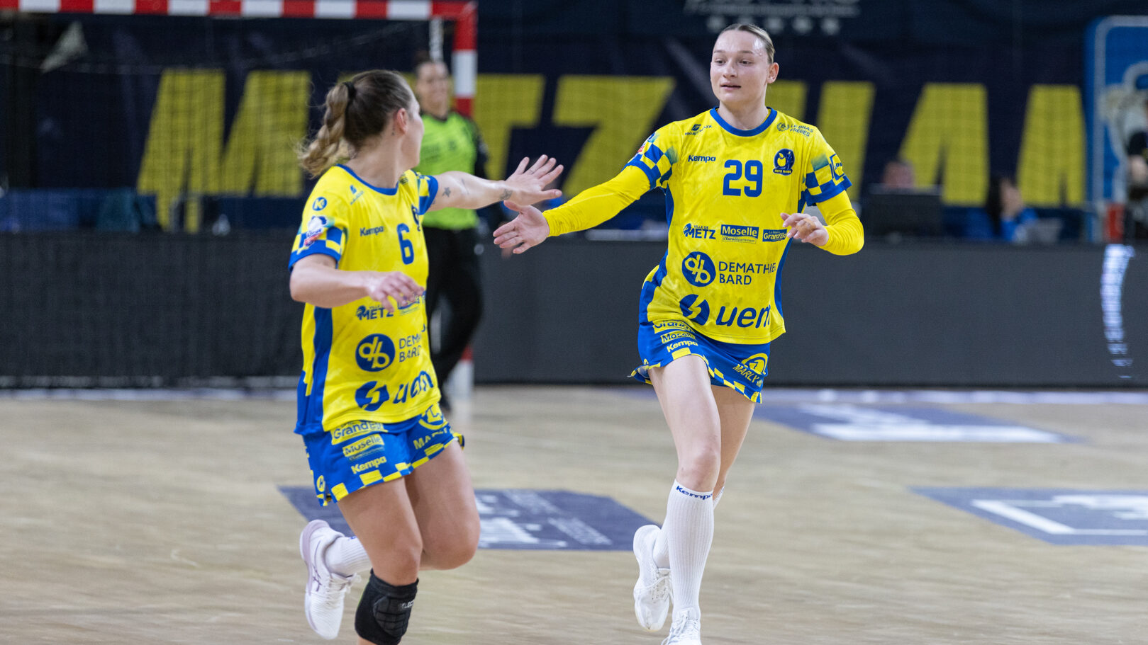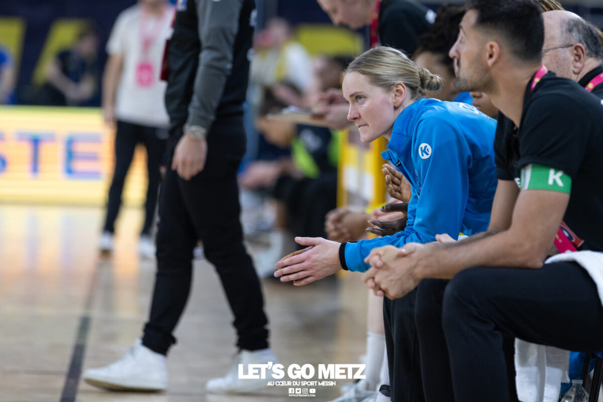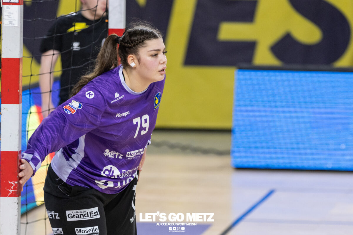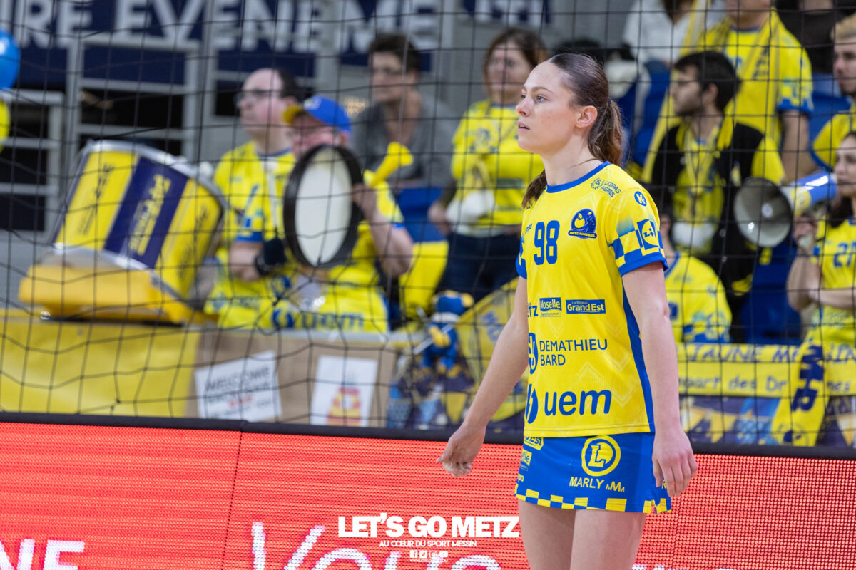 43 Metz Handball maintient la pression sur Brest en gagnant face à Toulon ce mercredi (34-26) malgré un niveau de jeu irrégulier. Ces matchs de Ligue Butagaz Energie placés entre deux rencontres de Ligue des champions sont toujours difficiles à analyser. D’autant plus lorsque le match qui suit peut offrir une qualification directe pour un quart de finale européen. Cette opposition entre Metz Handball et Toulon n’a pas dérogé à la règle. Joué entre la victoire acquise samedi dernier face à Gloria Bistrita et le déplacement programmé à Dortmund ce dimanche (14 h), ce duel de clubs aux ambitions opposées, s’est terminé sur la victoire du favori messin (34-26). L’essentiel est là pour les Dragonnes. Toutefois, comme c’est désormais le cas depuis le début de cette année civile, les amoureux du beau handball peuvent être frustrés. Le jeu des Jaune et Bleu manque de fluidité et d’efficacité depuis janvier. Metz Handball a mis du temps pour prendre l’ascendant sur Toulon On aurait pu penser que la réception de Toulon permettrait aux partenaires de Chloé Valentini de retrouver une base défensive solide lui laissant la possibilité de dérouler leur jeu sur grand espace. Et par la même occasion creuser progressivement un écart assez significatif afin de pouvoir rapidement faire tourner le collectif. Il n’en était rien tant le premier acte était serré. Si Metz Handball prenait trois buts d’avance au terme de son premier tiers (7-4, 11e) après des réalisations de Sarah Bouktit, Lylou Borg et Chloé Valentini, cet écart s’amenuisait rapidement. Les Varoises parvenaient même à égaliser par Louise Cavanié (11-11, 18e). S’ensuivait un chassé-croisé entre les deux formations jusqu’à quelques encablures de la pause. Le temps mort posé par Emmanuel Mayonnade après ce rapproché toulonnais ne changeait fondamentalement pas le fond de jeu de son équipe, fébrile des deux côtés du terrain. Comme samedi face aux Roumaines, le technicien girondin n’hésitait pas à faire rentrer Sabrina Novotna à la place d’une Johanna Bundsen peu en réussite (1 arrêt en 21 minutes). L’entrée de la gardienne tchèque permettait aux Messines de retrouver leur pécule de trois unités à la pause (20-17, 30e). Le collectif messin finit par prendre le pas sur de valeureuses Toulonnaises Toulon tentait bien de se maintenir à hauteur sous l’impulsion de sa capitaine Mari Finstad Bergum dès la reprise (9 buts au final) mais le physique messin avait finalement raison des Sudistes. Petra Vamos, Lena Grandveau, Chloé Valentini et Sarah Bouktit, d’une roucoulette qui faisait se lever les Arènes, donnaient cette fois un avantage définitif aux Dragonnes (29-21, 44e). Lylou Borg, qui prenait le relais de Sarah Bouktit au jet de sept mètres en seconde période, en profitait pour inscrire cinq buts quand Anne-Emmanuelle Augustine profitait du temps de jeu qui lui était donné pour inscrire deux réalisations dont la dernière des Jaune et Bleu. Une victoire (34-26) qui permettait à Metz Handball de rester au contact de Brest, victorieux de son côté de Dijon (31-25) et d’aborder dans les meilleures disposition un déplacement à Dortmund ce dimanche qui conditionnera grandement son avenir européen. La galerie du match Statistiques de la rencontre Metz Handball Bundsen (1 parade sur 12 tirs), Novotna (5/19). Valentini (5 buts en 6 tentatives, capitaine), Goval, Axnér (3/7), Augustine (2/2), Smits, Ngombele, Bouktit (5/9), Granier (3/4), Grandveau (6/10), Vámos (4/7), Borg (5/6), Errard (1/1). Toulon Métropole Var Handball Zimmerman (3 parades sur 23 tirs), Samzun (7/21). Giustiniani (2 buts en 2 tentatives), Chabaud (1/2), Finstad Bergum (Capitaine 9/14), Stankiewicz (2/5), Gassiolle (1/2), Thévenet, Cavanié (4/4), Deen-Yessouf (5/9), Cayez, Rival (1/1), Pastour (1/2) Crédit photo : Matthieu Henkinet / Let’s Go Metz