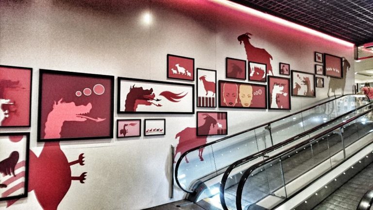 489 Qu’a-t-il bien pu se passer dans l’esprit des élus messins lorsqu’ils ont accepté cette décoration pour le moins douteuse dans le centre Saint-Jacques? A l’instar de l’aéroport de Denver et ses célèbres aménagements décoratifs sataniques, ses peintures murales prophétiques et maçonniques qui font le malheur des conspirationnistes du monde entier, le centre Saint-Jacques à Metz arbore lui une bien curieuse fresque. Nichée à la sortie du parking sous-terrain le long des escalators côté Novotel, cette étrange peinture teintée de blanc, de rouge et… de grenat nous montre des représentations très originales du Graoully, notre cher dragon local, accompagné de quelques chèvres. Non, vous ne rêvez pas… On connaît tous plus ou moins la symbolique de Baphomet et du bouc de Mendès, l’ange déchu. Les spécialistes de l’occultisme vous expliqueront que derrière les traits familiers de la chèvre se cache un symbole de fécondité, mais également l’image de l’antéchrist. Pour les supporters messins malheureusement, il n’est nullement question d’étoiles à cinq branches ou de satanisme, mais bien du souvenir d’une vieille provocation des voisins de la banlieue sud, et de leur fameux fanion grenat réutilisé à maintes reprises par de peu scrupuleux médias pour nous glisser une quenelle quand l’envie les démange. Alors d’après-vous, l’artiste était-il nancéien ou bien sommes-nous fasse à un complot illuminati au plein cœur de la ville de Metz? Le mystère reste entier… FM