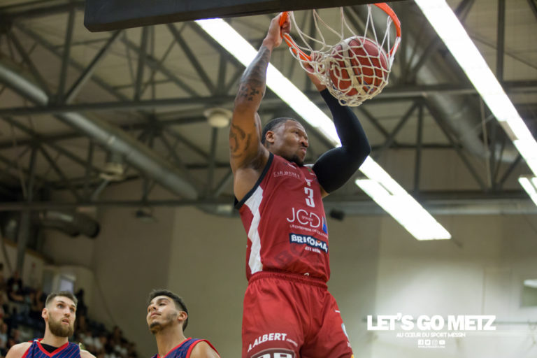 434 Auston Calhoun est un profil atypique dans l’effectif des Metz Canonniers. Arrivé en Lorraine en 2020, l’intérieur est un véritable baroudeur. Le joueur américain, qui se plaît sous la tunique grenat, s’est confié à Let’s Go Metz dans le cadre d’un entretien. Candidats à la montée, les Metz Canonniers sont sur courant alternatif ces dernières semaines. La faute notamment à un calendrier très dense. Auston Calhoun ne perd pas de vues les faiblesses de son équipe, qui reste tout de même compétitive, en témoigne la victoire face à Beaujolais : « Nous avons une bonne équipe, même si parfois nous manquons de consistance en attaque et en défense. On n’arrive pas toujours à garder notre identité. J’adore les mecs du vestiaire, il n’y a pas de joueur égoïste dans l’équipe. Nous devons simplement travailler sur notre identité. Les équipes qui nous ont battus ont une identité bien définie. »Auston Calhoun découvre un rôle différent cette saison. Généralement titulaire dans ses anciennes équipes, l’Américain sort du banc avec Metz, ce qui ne l’empêche pas de rester un scoreur efficient : « Débuter n’est pas nécessairement important. Le plus important c’est de réussir à avoir un apport pour l’équipe. Sortir du banc c’est différent bien sûr, il faut mieux choisir ses shoots et cela demande une grande concentration. » L’Américain peut compter sur l’appui de joueurs expérimentés – à l’instar de Florent Pietrus, Gary Florimont et Loïc Akono – pour continuer à progresser. « C’est bien d’avoir ce genre de joueurs dans l’équipe. J’ai notamment pu jouer contre Loïc il y a quelques saisons, quand j’étais à Angers. Ils comprennent beaucoup de choses sur le terrain, de par leur expérience. Quand je fais une erreur, ils communiquent avec moi. J’apprends beaucoup d’eux. » La France, pays d’adoption d’Auston Calhoun Auston Calhoun a baroudé entre la NCAA dans son pays, la Bulgarie, la Suisse, la Bosnie… Et même le Japon où il a joué en 3×3 ! Mais l’ailier fort a une véritable affection pour la France. Après des passages à Angers et Dax en Nationale 1, il semble avoir trouvé une nouvelle maison à Metz. Le jeune papa se plaît en Lorraine, au point de nous déclarer sa flamme pour l’ancienne capitale de l’Austrasie.« J’aime le rythme du jeu en France. Au-delà du basket, ma famille et moi nous nous plaisons dans ce pays qui est juste fantastique. Ma fille adore la France, elle essaye d’apprendre le français, elle adore la nourriture aussi (Sourire). Ce serait vraiment bien que je puisse continuer à Metz dans le futur. J’aime être ici, ma famille aime être ici. Tout se passe bien depuis que je suis à Metz. J’adore la ville, elle est vraiment belle. C’est une ville à taille humaine. »Avec 10,2 points de moyenne, Auston Calhoun est le 3ème meilleur scoreur des Metz Canonniers cette saison, derrière Alexandre Karolak (13,5pts) et Gary Florimont (12,6pts). Mais nul doute que l’objectif principal de l’Américain sera de retrouver la Nationale 1 avec les Grenats. Propos recueillis par Arthur Carmier et Gauthier Carboni le 19 mars, traduits de l’anglais par nos soins.Crédit photo : Matthieu Henkinet/LGM