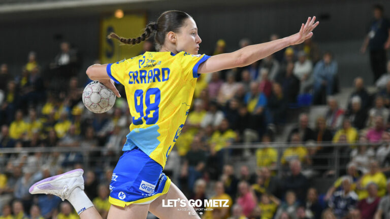 2,8K L’ailière Manon Errard vient de s’engager pour trois saisons avec Metz Handball. Elle figurera dans l’effectif des Dragonnes au moins jusqu’en 2028. Il y avait peu de doutes sur la poursuite de l’aventure entre Metz Handball et Manon Errard au moment d’évoquer le recrutement de Metz Handball pour les saisons à venir. Encore fallait il concrétiser la chose. Propulsée du centre de formation à l’effectif des Dragonnes cette saison afin d’exprimer au mieux son potentiel, la jeune ailière semble faire le job aux yeux du staff messin puisqu’elle vient de s’engager pour trois saisons supplémentaires, dans le cadre de son premier contrat professionnel, autrement dit jusqu’en 2028. Si quelques étapes ont été sautées pour intégrer Manon Errard au groupe professionnel de Metz Handball, elles semblent désormais être respectées une à une pour lui permettre de développer convenablement son jeu. Entrée sur le terrain dès le premier match de Ligue Butagaz Energie de la saison, face à Toulon, elle avait tout d’abord concédé une erreur de jeunesse en posant son pied dans la zone lors de sa première prise d’appui pour un tir, avant de se racheter efficacement avec deux buts inscrits dans une victoire 33 à 22. Depuis, la jeune femme, née à Nouméa en 2005, saisit les occasions quand elle se présentent, avec sérieux. A son premier but en professionnel en septembre s’est ajouté sa première réalisation en Champions League, le 10 novembre en déplacement à Ljubljana. Incontestablement une joueuse d’avenir, elle dispose désormais du confort d’un contrat long terme, vraie marque de confiance de la part de Metz Handball. Pendant ces trois années, je vais travailler dur pour élever mon niveau jour après jour. Je ne pouvais pas rêver mieux que signer trois ans dans un club tel que Metz, qui, en plus, est le plus proche de chez moi, de ma famille. Partager le poste avec Lucie a aussi motivé mon choix, je vais encore beaucoup apprendre à ses côtés. C’est forcément une fierté de sortir du Centre de Formation et de prolonger directement avec les pros. Manon Errard sur le site de Metz Handball Après avoir débuté à l’Yvois Carignan Handball, Manon Errard a fait ses marques en Moselle jusqu’à endosser de vraies responsabilités au sein de l’équipe de Nationale 1 Féminine du centre de formation, guidée par Nina Kanto. Après avoir attiré l’attention d’Emmanuel Mayonnade et de son staff, elle a été intégrée à l’effectif professionnel de Metz Handball pour la saison 2024/2025. En chemin l’été passé, elle décrochait une exceptionnelle médaille d’or mondiale avec l’équipe de France U20. Elle est désormais engagée avec Metz Handball jusqu’à l’issue de la saison 2027/2028 et est à la date de la parution de ces lignes la joueuse avec le contrat le plus long du club. Elle partagera au moins jusqu’à 2027 le poste d’ailière droite avec Lucie Granier. Crédit photo : Mikael Frank / Let’s Go Metz