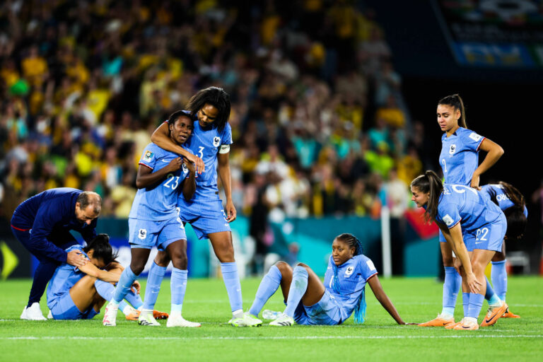 472 Ce samedi, pour les quarts de finale de la Coupe du Monde, l’Équipe de France féminine a été renversée par l’Australie. Les Matildas sont venues à bout des Françaises en s’imposant aux tirs au but. L’aventure s’achève pour Hervé Renard et ses protégées. Après avoir éliminé le Maroc (4-0) en huitième de finale, les Bleues s’attaquaient aux Australiennes. Une rencontre très attendue pour les deux nations qui avaient l’occasion de marquer l’histoire. Pour les Françaises, l’objectif était d’obtenir un billet pour la deuxième demi-finale de Coupe du Monde de son histoire. Du côté des Australiennes, une victoire permettait de disputer leur première demi-finale dans un mondial. Incertaines, Maëlle Lakrar et Selma Bacha étaient finalement titularisées par Hervé Renard. Une première mi-temps à contretemps Dès l’entame de match, les Françaises conservaient le ballon en attendant patiemment une brèche dans la défense adverse. La première occasion de ce match était pour Kadidiatou Diani. Cette dernière profitait d’une erreur défensive pour armer une frappe qui passait à côté des cages d’Arnold, la portière australienne. À la demi-heure de jeu, Maëlle Lakrar était, à son tour, toute proche d’ouvrir le score après un cafouillage en défense. Néanmoins, le jeu des Tricolores restait insuffisant. Il fallait plus de rythme pour inquiéter les Matildas et les déchets techniques étaient trop nombreux. En fin de première période, Pauline Peyraud-Magnin effectuait une terrible sortie, laissant son but vide. Heureusement, Elisa De Almeida se jetait dans les cages pour empêcher le ballon de passer la ligne (40′). Les Bleues terminaient très mal cette première mi-temps. Le jeu haché ne permettait pas aux joueuses d’Hervé Renard de construire leurs offensives. (Photo by Kev Nagle/Icon Sport) La France en grande souffrance Au retour des vestiaires, les Françaises subissaient à nouveau les offensives australiennes. Les Bleues perdaient le fil et ne parvenaient pas à imposer leur jeu. À la 54ème minute, Sam Kerr, la star de l’équipe australienne, entrait en jeu sous les ovations du public. Les minutes passaient et la France perdait totalement la maîtrise de la rencontre. Les offensives adverses se multipliaient, à l’image de ces belles frappes de Fowler et Kerr (59′-60′). L’Équipe de France, ne trouvant pas de solution, commençait à s’agacer. Ce match ressemblait fortement au match de préparation perdu par les Bleues (0-1). En fin de rencontre, les Tricolores montraient un visage plus offensif. Malheureusement, ces efforts ne payaient pas et le score restait vierge au terme des 90 minutes. (Photo by Kev Nagle/Icon Sport) Pas de dénouement en prolongation L’Équipe de France féminine et l’Australie devaient alors se départager en prolongation. Pour le plus grand bonheur des supporters français, Kennedy inscrivait un but contre son camp, donnant l’avantage aux Bleues. Malheureusement, une faute de Wendie Renard était sifflée dans la foulée, annulant le but (99′). Les Françaises montraient un meilleur visage et faisaient douter les Matildas. Les offensives se multipliaient, à l’exemple de la superbe frappe de Vicki Becho, bien arrêtée par la gardienne adverse (105′). Malgré les nombreuses tentatives, les Françaises ne parvenaient pas à tromper la gardienne adverse, à l’image de Selma Bacha, proche de libérer les Bleues sur une belle frappe (118′). En fin de rencontre, la gardienne de l’Équipe de France, Solène Durand, entrait en jeu pour la séance de penalty. Selon Hervé Renard, elle est la spécialiste des tirs au but. Le sort de ce match allait donc être scellé sur une séance de pénaltys. (Photo by Kev Nagle/Icon Sport) Malheureusement, cette séance était à l’image de la rencontre. Après de nombreux tirs, l’Australie venait à bout de l’Équipe de France féminine. Selma Bacha, Ève Périsset, Kenza Dali et Vicki Becho ne trompaient pas la gardienne adverse. Les quelques arrêts de Solène Durand ne suffisaient pas à qualifier la France en demi-finale. Ainsi, les Tricolores étaient éliminées de la Coupe du Monde féminine 2023. (Photo by Kev Nagle/Icon Sport) Australie 0 (7) – 0 (6) France Composition de l’Équipe d’Australie : Arnold – Carpenter, Hunt, Kennedy, Catley – Raso (Vine, 104′), Gorry, Cooney-Cross (Yallop, 116′), Foord – van Egmond (Kerr, 55′), Fowler Composition de l’Équipe de France : Peyraud-Magnin (Durand, 120+1′) – De Almeida (Périsset, 120+1′), Lakrar, Renard, Karchaoui – Dali, Geyoro, Toletti (Becho, 64′), Bacha – Diani, Le Sommer.