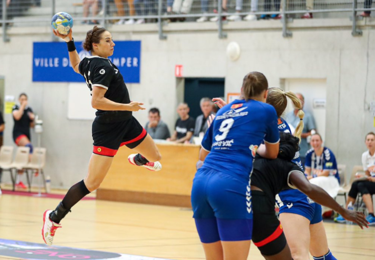 380 Deux semaines avant son premier match de championnat, Metz Handball a déposé ses valises sur les terres bretonnes pour poursuivre sa préparation estivale. Invaincues depuis la reprise, les joueuses de Emmanuel Mayonnade ont pu tester leurs forces vives face à ce qui se fait de mieux en Europe. Un Final 4 amical porteur d’enseignements… Metz Handball vs ZRK Buducnost Podgorica (30-24) : Une copie séduisante et prometteuse rendue avec sérieux. Ces deux équipes se connaissent par cœur. En 17 ans, elles se sont rencontrées 13 fois dont 6 fois en 3 ans, à tel point que ces rencontres pouvaient se nommer le « Buducnost classico ». Habituées aux joutes européennes automnales pour se disputer les places du Tour principal, Metz et Buducnost se sont retrouvées à Quimper pour préparer une saison qui s’annonce longue et ardue. Rapidement, les joueuses ont montré au public breton qu’on pouvait de nouveau compter sur elles en Ligue des Champions. Intenses, rugueuses, hargneuses, à la limite du danger, les Monténégrines ont tenté de réduire toutes les tentatives messines à néant. Mais le collectif messin a changé de dimension. Ici, c’est un top 4 européen qui s’est dressé devant la montagne bleue des Balkans. Longtemps accrochées, parfois dépassées avant un temps mort très bénéfique, à 17 minutes du terme, (19-19 jusqu’à la 43′ minute), les Dragonnes se sont armées de patience pour rentrer dans le jeu de Podgorica avec roublardise. Resserrant une défense qui se reposait sur sa gardienne en début de seconde période, les Lorraines ont provoqué une certaine déroute dans le camp adverse, entraînant des fautes techniques qui leur permettaient de récupérer des ballons et trouver la cible en contournant les replis défensifs. A partir de la 43ème minute et lancés par Grâce Zaadi, le métronome de l’ombre, ces temps d’action ont eu un impact certain sur l’aspect psychologique. Les Messines ont mieux maîtrisé les duels avec la gardienne, à l’image d’une Olga Perederiy en très grande inspiration pour son tout premier match. Concluant habilement ses appels de balle, la nouvelle pivot a été l’une des pièces maîtresses. Une belle opération prometteuse pour un Metz Handball qui devait composer sans Xenia Smits face à un collectif renforcé à l’intersaison. Metz Handball vs Gyori Audi ETO KC (28-34) : Encore un peu trop juste… Le lendemain, plus au nord de la Bretagne, les Messines remettaient le bleu de chauffe pour affronter le champion d’Europe en titre. Un Challenge de taille pour des Dragonnes remontées à bloc après leur très beau combat de la veille. Mais voilà, Gyor arrivait avec une victoire nette et sans bavure contre le Brest Bretagne Handball dans sa besace. Il fallait donc être combatives dans tous les secteurs de jeu pour bien figurer et s’affirmer un peu plus. Dans les 1ères minutes de jeu, tout allait bien. Les joueuses de Emmanuel Mayonnade proposaient un jeu dynamique vers l’avant avec l’impact nécessaire pour repousser les nouvelles coéquipières de Béatrice Edwige dans leurs retranchements. Les Jaune et Bleu entraînaient même le collectif hongrois dans leur jeu pour obtenir des jets de 7m ou des passages en force. Un jeu placé bien construit et les Messines mènent rapidement les débats (6-3 à la 10ème minute). Hélas, soutenues par leur gardienne Eva Kiss en verve, les joueuses de Gyor accélèrent la cadence et ne laissent plus aucune solution aux championnes de France. Elles ne trouvent le chemin du filet qu’à 2 reprises entre la 10ème et la 16ème minute et laissent s’échapper des Hongroises cruellement efficaces face à Laura Glauser, qui tentera de maintenir un petit écart de 2 buts jusqu’à la mi-temps (13-15). Au retour des vestiaires, Ivana Kapitanovic prend la place de Laura Glauser et met le tempo en arrêtant la 1ère tentative hongroise. Elle permet à Laura Flippes de ramener Metz à 1 but d’écart. Mais ce début de seconde mi-temps devient très vite chaotique pour les Françaises qui encaissent un 2-0 (15-19, 34ème), poussant Emmanuel Mayonnade à poser son temps-mort, 4 minutes après la reprise. Salvateur puisque la jeunesse lorraine vient relancer la dynamique quand les cadres n’arrivent plus à ajuster leurs actions dans la profondeur. A 20 minutes de la fin, Orlane Kanor et Julie le Blevec redonnent de l’espoir à un collectif qui tâtonne depuis le début de la rencontre (18-19). Mais l’équipe hongroise se démarque de nouveau avec Estelle Nze Minko et Stine Oftedal qui se partagent merveilleusement le poste de demi-centre, à tour de rôle. Le Money-time finit par être cruel pour les coéquipières de Grâce Zaadi. Elles n’arrivent plus à construire, se heurtent à une défense agressive et perdent trop de ballons dans les 15 dernières minutes. Mauvaises actions rapidement punies par un collectif coutumier de la vitesse et de la montée de balle rapide. Bien délaissée, Ivana ne parviendra pas à être efficace sur sa ligne, en toute fin de match. Ces deux jours mettent en évidence des chantiers à façonner comme la charnière centrale, point faible face à des équipes européennes bien rodées. Mais ils démontrent également un collectif toujours étonnant, capable de gérer ses temps faibles, en masquant collectivement certaines lacunes. L’équipe poursuit sa construction avec un dernier match test contre Dortmund, le 24 août prochain. Joueuses Messines mises en évidence : Grâce Zaadi, Orlane Kanor, Julie Le Blevec, Olga Perederiy. Pour voir les précédents résultats de la préparation messine Source photos : B. Delhomme/Ligue Butagaz Énergie