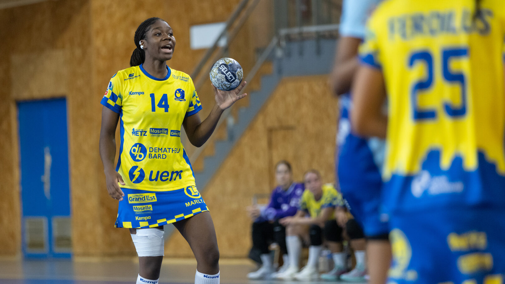3,2K L’équipe de Nationale 1 Féminine (N1F) de Metz Handball se déplaçait à Noisy-le-Grand dans le cadre de la cinquième journée de compétition. L’affiche de ce samedi pouvait être résumée simplement en ces quelques mots : « premier grand test de la saison ». En effet, les jeunes Dragonnes de Metz Handball se déplaçaient à Noisy-le-Grand dans un choc entre cinquièmes et leaders de la poule. Si les Mosellanes déplorent une défaite à leur compteur, un faux pas lors de la première journée, les franciliennes ont su, pour leur part, réaliser un début de saison sans faute ou presque. En effet, lors de leur dernière sortie face à Chambéry, les coéquipières d’Astride N’Gouan n’ont pu récolter qu’un match nul. Dès l’entame, la rencontre s’avérait tendue. Yvana Atangana ouvrait le score mais Karichma Ekoh lui répondait. Un échange d’amabilité permettait aux deux équipes de prendre tour à tour la mène au tableau d’affichage, pourtant c’est Metz qui parvenait à réaliser le break en profitant d’une parade de Tatjana Cinku et d’une réalisation sur jet de sept mètres d’Elea Ferdilus (03-05, 9ème). Dans la foulée Ruth Mbala manquait une occasion de resserrer le score et les jeunes Dragonnes en profitaient pour marquer trois buts consécutifs via Yvana Atangana, Elea Ferdilus et Clemence Castets, provoquant un temps mort des locales (03-08, 11ème). Cette pause dans le jeu ne portait pas ses fruits immédiatement mais les Noiséennes trouvaient un second souffle après le quart d’heure de jeu. Alors que les Jaune et Bleu se montraient un peu plus à la peine dans le jeu après une suspension d’Elea Ferdilus, Ruth Mbala, Karichma Ekoh et Astride N’Gouan ramenaient l’écart à deux buts (08-10, 18ème). Il n’en fallait pas plus pour redonner du mordant aux jeunes Dragonnes. L’écart se creusait à nouveau jusqu’à atteindre les 8 unités juste avant la mi-temps grâce à un tir de Maily Etilopy (11-19, mi-temps). Bien que gênées par une double infériorité numérique au retour des vestiaires, les locales démarraient le second acte avec des intentions offensives. Cependant, du côté des protégées de Nina Kanto, le doute ne s’installait jamais. Les cadres continuaient de se montrer efficaces à la finition, Yvana Atangana en tête (14 buts au total) tandis que Tatjana Cinku élevait son niveau de jeu pour réaliser son meilleur total de parades de la saison (16). L’avance se stabilisait entre 6 et 8 buts pour les Mosellannes et l’ultime sursaut Noiséen dans le money time ne changeait rien à la victoire messine. Score final de ce Noisy-le-Grand / Metz Handball en Nationale 1 Féminine : 27 – 32 Cette défaite imposée à une équipe de haut de tableau sur son propre terrain devrait rebattre les cartes au classement de Nationale 1 Féminine. Toutes les équipes, sauf Chambéry, ont désormais subi au moins une défaite et personne ne s’est concrètement emparé d’une place sur le podium. L’ASPTT Strasbourg a concédé un match nul face à Serris tandis que Stasbourg ATH perdait face à Chambéry, donnant encore plus de densité au haut de tableau. Pour leur prochain match, le 1er novembre, les jeunes Dragonnes de Metz Handball se déplaceront à nouveau dans le cadre d’un choc face à l’ASPTT Strasbourg. Pour les retrouver à domicile il faudra attendre le 8 novembre et la réception de Besançon. Les stats de la rencontre Metz Handball Navarro, Cinku (16 parades)Ababsa, Atangana (14 buts sur 20 tirs, capitaine), Castets (4/5), Etilopy (7/8), Giliberto, Ferdilus (6/7), Gooroosamy, Goval (1/1), Gros, Holler, Kaakil Talaba, Thevenot (0/1). Noisy-le-Grand Do Lopetegui (3 parades), Dosso (3 parades)Cossou (5 buts sur 9 tirs), Delalande, Dorson, Ekoh (11/15), Fofana (3/6), Keita, Mace (4/5), Mbala (3/9), Mosabau, N’Gouan (1/3), Varela da Moura (0/2, capitaine), Yatera. Crédit photo : Matthieu Henkinet / Let’s Go Metz (archive)