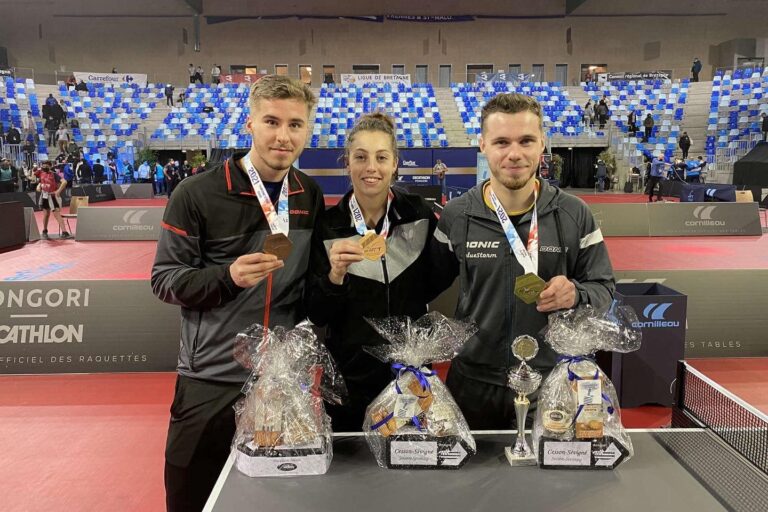476 Plusieurs pongistes de Metz TT et de son Centre d’Entraînement étaient engagés ce week-end aux Championnats de France de tennis de table. Esteban Dorr a remporté le titre en Double Messieurs, son coéquipier Florian Bourrassaud a lui décroché le bronze. Pauline Chasselin a également glané une médaille de bronze, en Doubles Dames. Esteban Dorr n’a jamais aussi bien porté son nom. Deux ans après son titre en Double Mixte avec Pauline Chasselin, le messin est une nouvelle fois sacré champion de France. Cette fois-ci, c’est en Double Messieurs qu’il remporte le plus beau des métaux, avec son partenaire Alexis Lebrun.Pourtant menés 2-0 en finale, Dorr et Lebrun ont renversé la paire Robinot / Rembert et se sont imposés en 5 sets ! Florian Bourrassaud complète le podium du Double Messieurs. Associé à Vincent Picard, le jeune messin a remporté une belle médaille de bronze, comme en Double Mixte il y a deux ans. De quoi faire le plein de confiance pour les joueurs de l’équipe de PRO B de Metz TT.De son côté, Pauline Chasselin, sociétaire du Centre d’Entraînement de Metz TT, s’est également offert une belle médaille de bronze. En compagnie d’Anais Salpin sa coéquipière de Grand Quevilly, la lunévilloise est montée sur le podium du Double Dames. Championnats de France : les résultats des joueurs de Metz TT et de son Centre d’Entraînement Esteban Dorr (Metz TT). Champion de France en Double Messieurs, 1/8 de finaliste en Simple, 1/8 de finaliste en Double Mixte.Florian Bourrassaud (Metz TT). Bronze en Double Messieurs, 1/8 de finaliste en Double Mixte, 1/16 de finaliste en Simple.Pauline Chasselin (Grand Quevilly). Bronze en Double Dames, 1/4 de finaliste en Simple, 1/8 de finaliste en Double Mixte.Dorian Nicolle (Metz TT). 1/8 de finaliste en Double Messieurs, 1/32 de finaliste en Simple, 1/32 de finaliste en Double Mixte.Damien Llorca (Metz TT). 1/32 de finaliste en Simple, 1/32 de finaliste en Double Messieurs, 1/32 de finaliste en Double Mixte.Clément Chobeau (Charleville-Mézières). 1/8 de finaliste en Double Messieurs, 1/16 de finaliste en Double Mixte, 1/32 de finaliste en Simple.Claire Picard (Schiltigheim). 1/16 de finaliste en Simple, 1/16 de finaliste en Double Dames, 1/16 de finaliste en Double Mixte. Les résultats complets des Championnats de France 2021 de tennis de table. Crédit photo : Julien Buret et Matthieu Henkinet (LGM, archives), DR (image à la une)