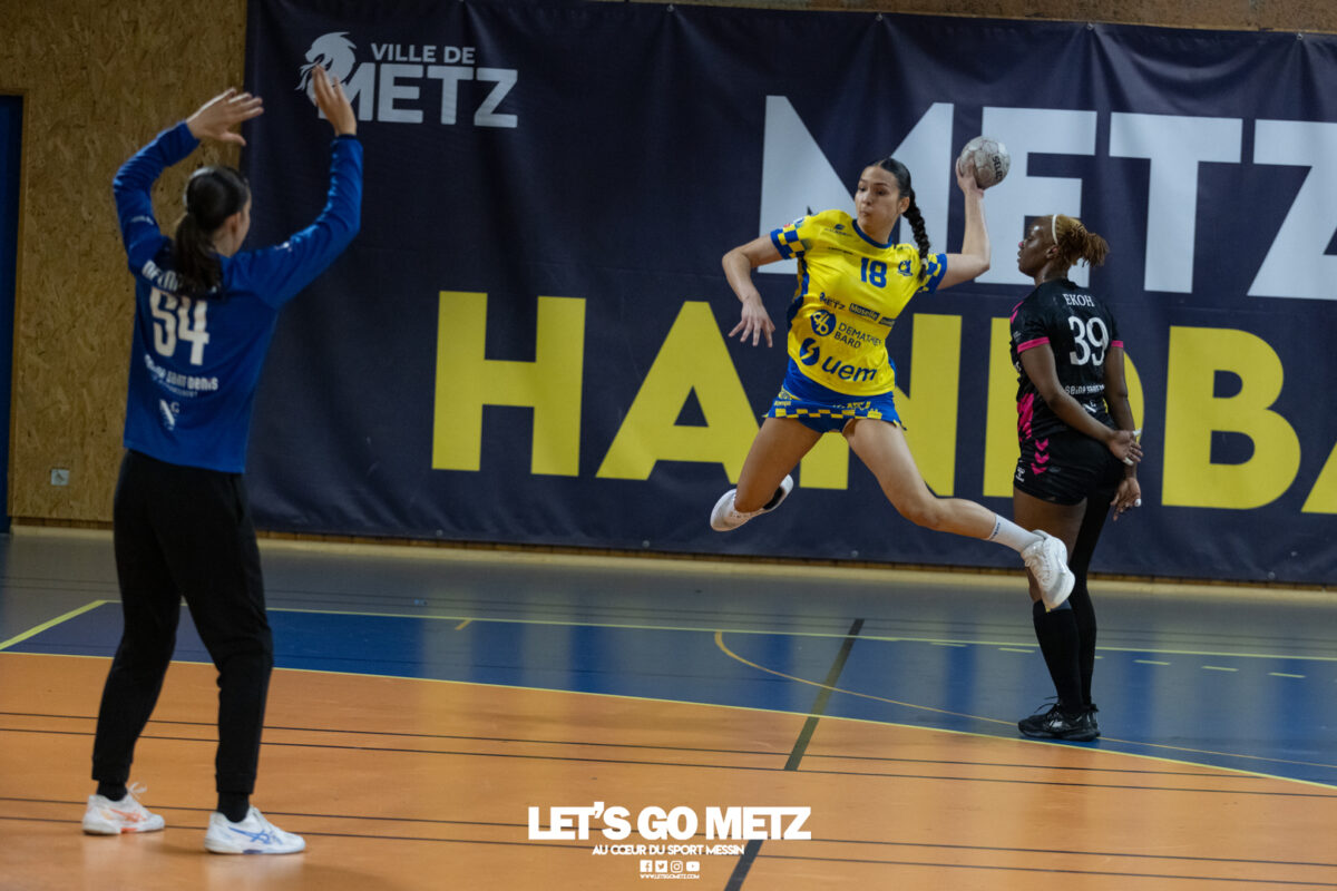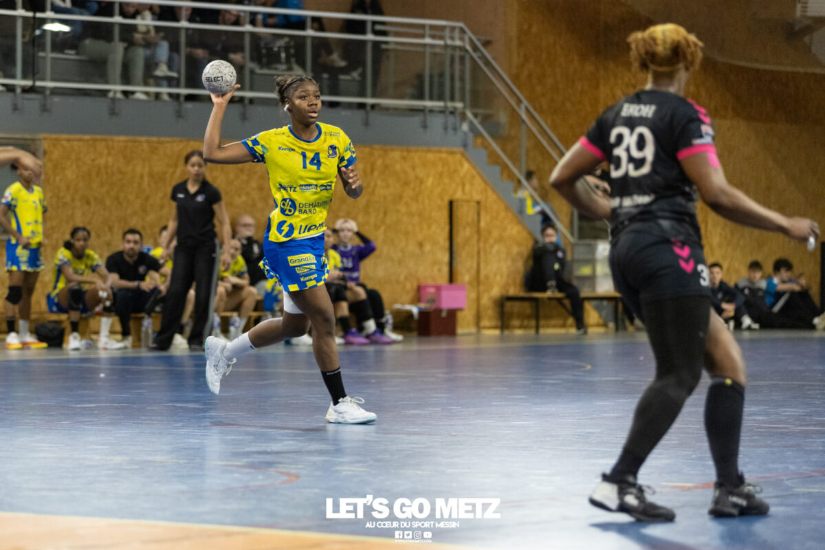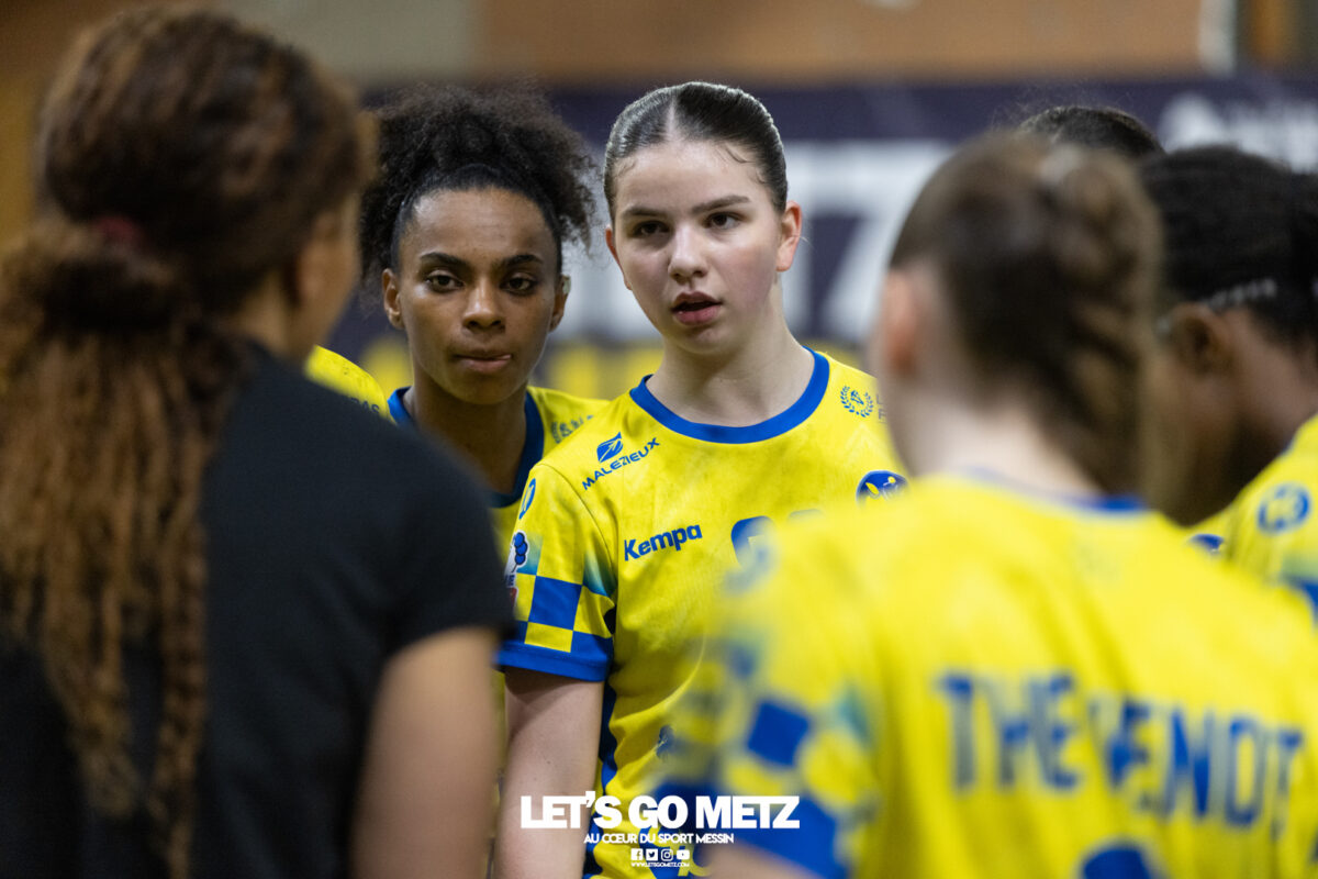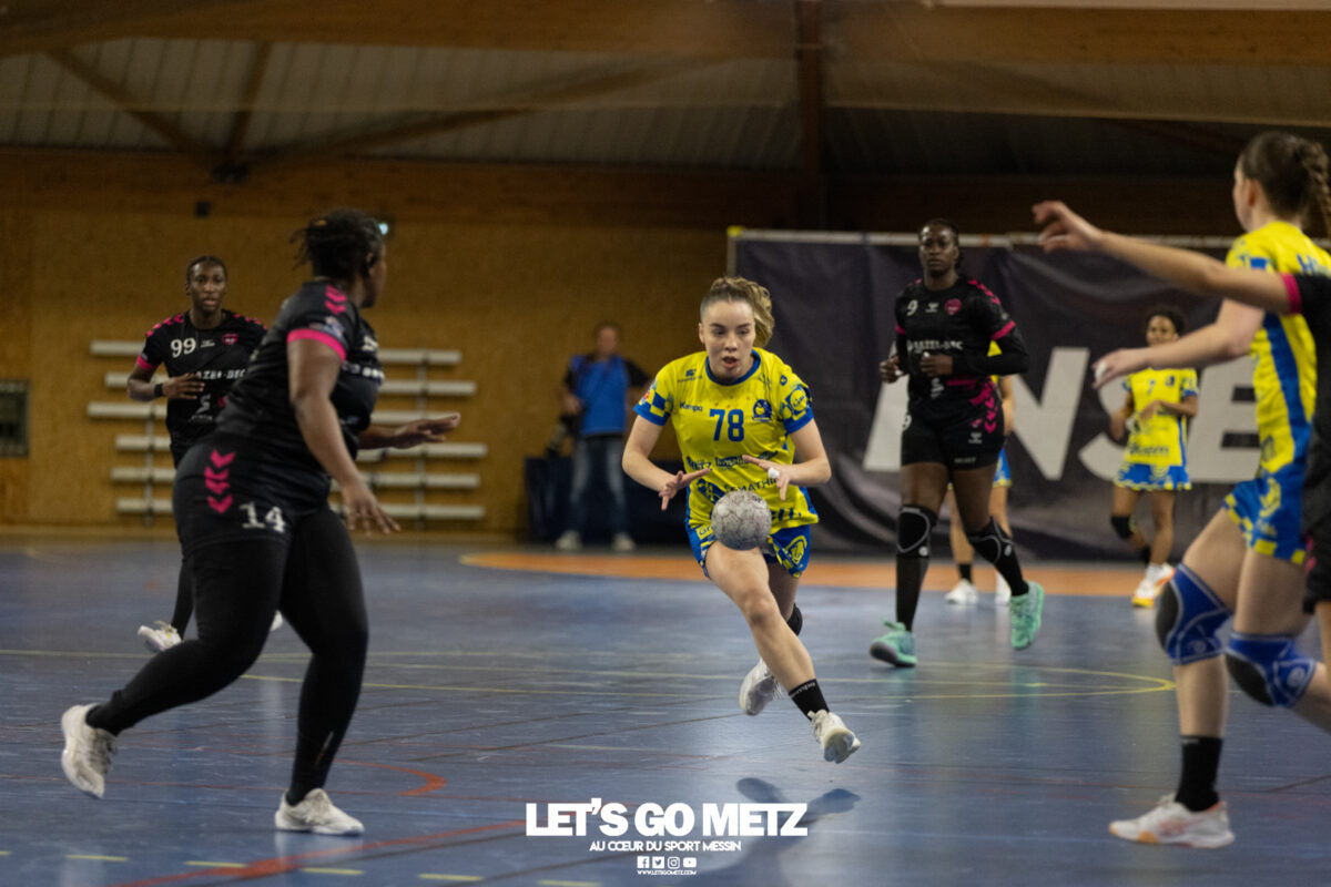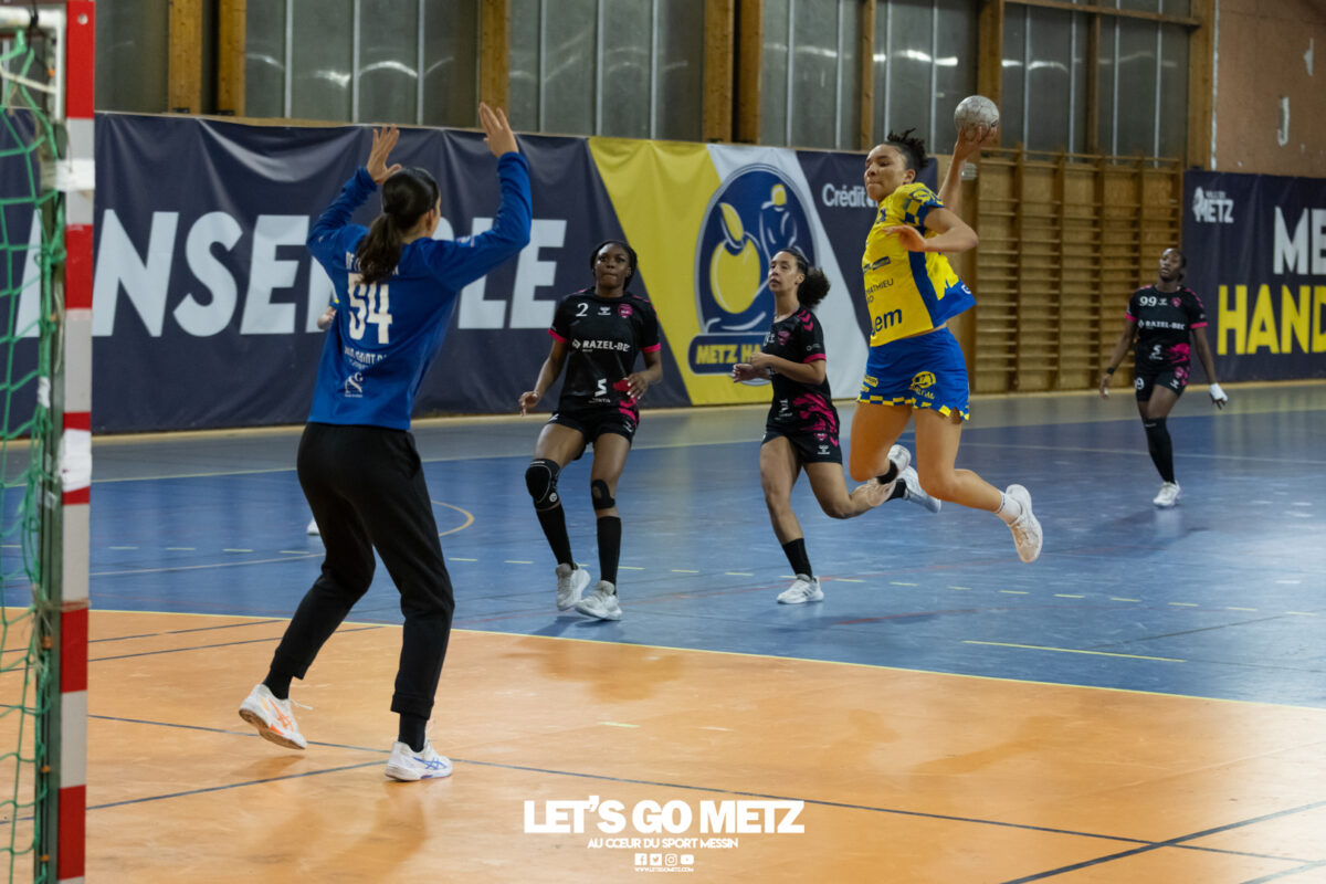5,5K L’équipe de Nationale 1 Féminine (N1F) de Metz Handball recevait Noisy-le-Grand dans le cadre de la 16ème journée de compétition. Après une victoire contre Serris la semaine passée, c’est un défi de taille qui attendait l’équipe de Nationale 1 Féminine (N1F) de Metz Handball ce samedi dans le cadre de la réception de Noisy-le-Grand. Les jeunes Dragonnes, premières du classement accueillaient leurs dauphines, candidates à la montée en D2F, pour décider du sort de la compétition. Au match aller, les messines s’étaient imposées en terres franciliennes sur le score de 32 à 27 et le début de match retour donnait le sentiment d’un scénario similaire. Elea Ferdilus et Maily Etilopy trouvaient le chemin des buts tandis que Tatjana Cinku s’assurait de stopper les tentatives adverses (02-00, 3ème). Un mauvais coup reçu par Clémence Castets venait cependant casser quelque peu la dynamique. Les joueuses de Noisy-le-Grand en profitaient pour prendre le contrôle du match en profitant notamment des parades de Romane De Lopetegui (03-04, 12ème). La suite de la mi-temps voyait Metz Handball tenter de reprendre le dessus, avec peu de succès, considérant la difficulté rencontrée par les habituelles incontournables à performer à leur meilleur niveau par méforme ou tout simplement muselées. Dans cette dynamique, des profils généralement plus discrets comme Marie-Eve Holler et Anaïs Ababsa en profitaient pour se montrer à leur avantage mais cela ne suffisait pas à conclure la mi-temps avec un avantage, bien au contraire (10-12, mi-temps). De l’inconstance à plusieurs niveaux Pour espérer l’emporter, les jeunes Dragonnes devaient faire mieux lors du second acte, mais avec dans le camp adverse plusieurs anciennes professionnelles comme Astride Ngouan, Karichma Ekoh ou Adja Keita, la tâche s’avérait ardue. Une autre difficulté majeure reposait sur l’arbitrage globalement peu clair et peu régulier à l’encontre des deux équipes au fil de la soirée, occasionnant des échanges tendus à répétition.Après avoir vu l’écart grandir en leur défaveur, les protégées de Nina Kanto puisaient cependant dans leurs réserves pour revenir à un but via deux réalisations de Clémence Castets (14-15, 41ème). Cela ne faisait pas trembler les franciliennes pour autant, qui remettaient un coup de collier pour assurer à nouveau une avance de quatre buts et garantir une fin de rencontre tendue (15-19, 48ème). Les messines entamaient toutefois les dix dernières minutes avec un vrai sens de la rébellion. Une parade de Tajana Cinku se transformait en but d’Anaïs Ababsa avant que Fiona Gooroosamy ajoute un jet de sept mètres, que Ludyvine Kaakil Talaba inscrive son nom sur la feuille de match et que Marie-Eve Holler valide l’égalisation sous une belle ovation du public (20-20, 56ème). Mais cela ne suffisait pas. Jamais en position de prendre l’avantage après cela, les jeunes Dragonnes devaient s’en remettre à jouer le match nul mais un dernier cafouillage laissait les célébrations à Noisy-le-Grand, nan sans une petite dose de confusion en chemin. Score final de ce Metz Handball – Noisy-le-Grand en N1F : 21 – 22 Cette fin de série de victoires et la perte de la première place de la poule aux mains de Noisy-le-Grand ne marquent pas la fin de la saison. Les joueuses en jaune et bleu pourront se relancer lors du prochain match de N1F qui aura lieu à domicile alors que l’équipe de l’ASPTT Strasbourg se déplacera au gymnase du Technopole le 28 mars à 19h00. La galerie du match Les stats de la rencontre Metz HandballNavarro (2 parades), Cinku (11 parades)Ababsa (5 but sur 6 tir), Atangana (2/7, capitaine), Castets (3/6), Etilopy (1/5), Ferdilus (2/5), Giliberto, Gooroosamy (2/4), Goval (2/5), Holler (3/4), Kaakil Talaba (1/1), Nguon, Thevenot. Noisy-le-GrandDe Lopetegui (12 parades), Trifu (2 parades)Cossou (2 buts sur 5 tirs), Dorson (1/1), Ekoh (5/9), Keita (6/11), Mace (2/3), Mbala (1/2), Mosabau (1/1), Mpioso (1/3), N’Gouan (1/1), Yatera (2/3), Zediri (0/2). Crédit photo : Matthieu Henkinet / Let’s Go Metz