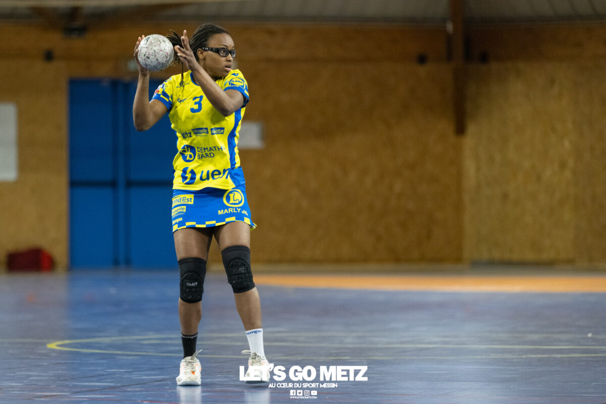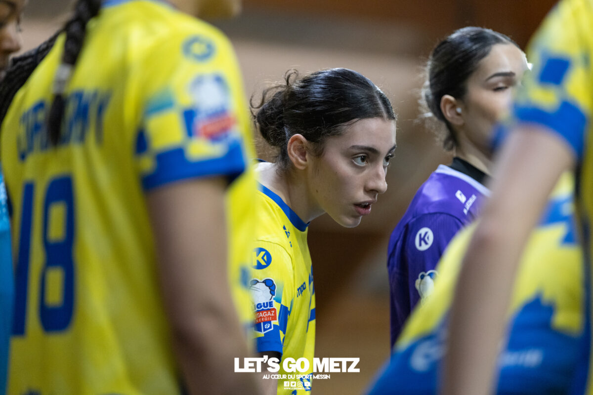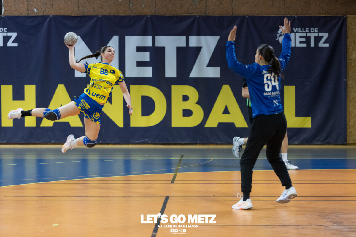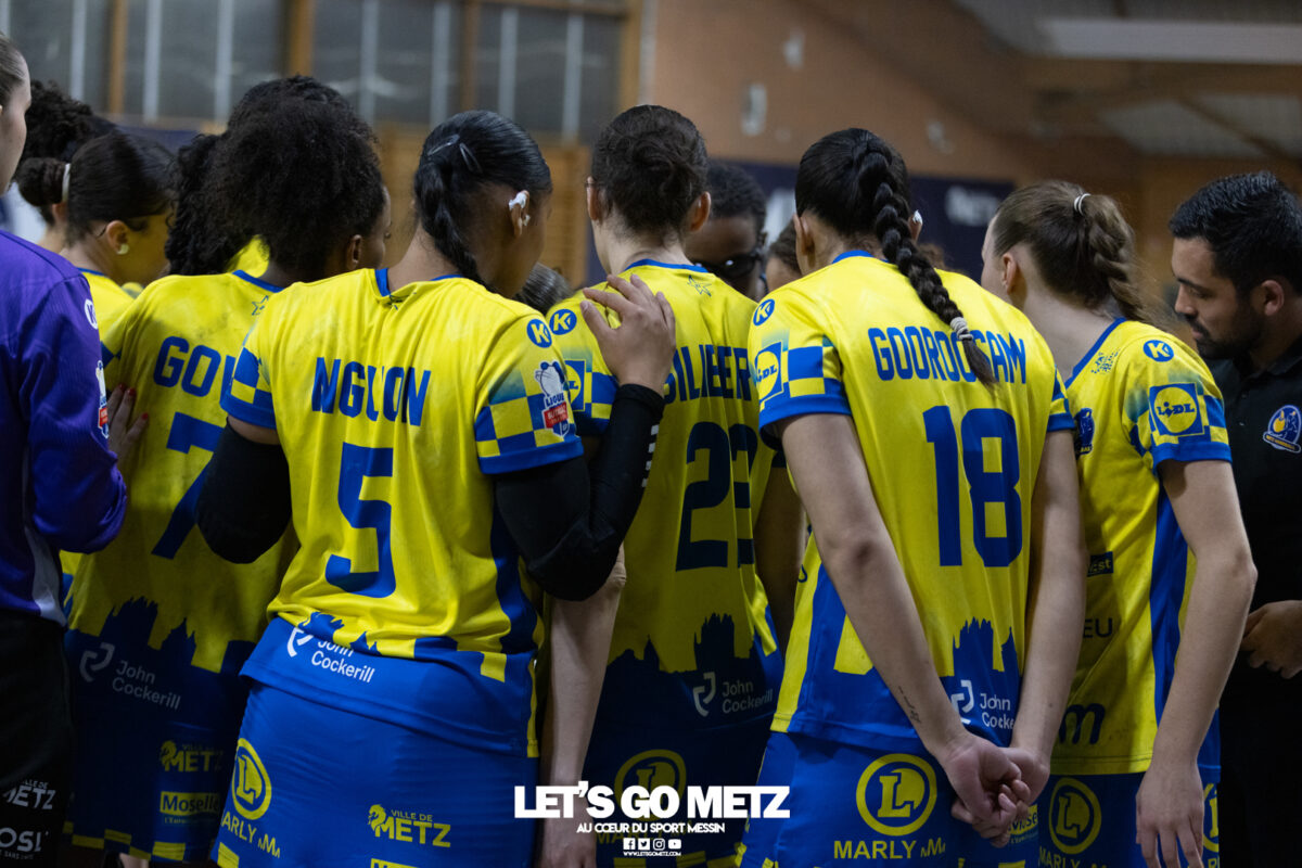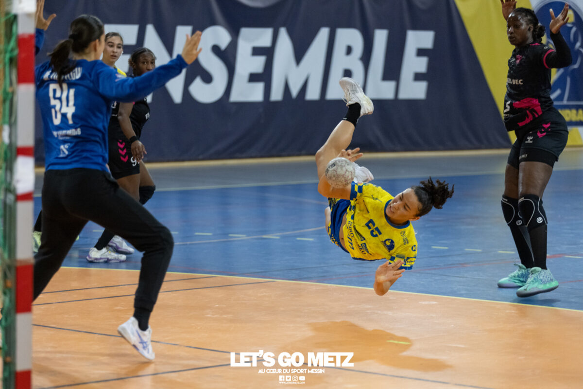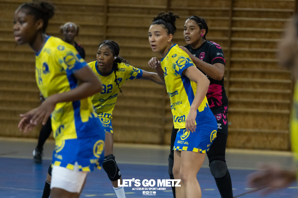 5,5K L’équipe de Nationale 1 Féminine (N1F) de Metz Handball recevait Noisy-le-Grand dans le cadre de la 16ème journée de compétition. Après une victoire contre Serris la semaine passée, c’est un défi de taille qui attendait l’équipe de Nationale 1 Féminine (N1F) de Metz Handball ce samedi dans le cadre de la réception de Noisy-le-Grand. Les jeunes Dragonnes, premières du classement accueillaient leurs dauphines, candidates à la montée en D2F, pour décider du sort de la compétition. Au match aller, les messines s’étaient imposées en terres franciliennes sur le score de 32 à 27 et le début de match retour donnait le sentiment d’un scénario similaire. Elea Ferdilus et Maily Etilopy trouvaient le chemin des buts tandis que Tatjana Cinku s’assurait de stopper les tentatives adverses (02-00, 3ème). Un mauvais coup reçu par Clémence Castets venait cependant casser quelque peu la dynamique. Les joueuses de Noisy-le-Grand en profitaient pour prendre le contrôle du match en profitant notamment des parades de Romane De Lopetegui (03-04, 12ème). La suite de la mi-temps voyait Metz Handball tenter de reprendre le dessus, avec peu de succès, considérant la difficulté rencontrée par les habituelles incontournables à performer à leur meilleur niveau par méforme ou tout simplement muselées. Dans cette dynamique, des profils généralement plus discrets comme Marie-Eve Holler et Anaïs Ababsa en profitaient pour se montrer à leur avantage mais cela ne suffisait pas à conclure la mi-temps avec un avantage, bien au contraire (10-12, mi-temps). De l’inconstance à plusieurs niveaux Pour espérer l’emporter, les jeunes Dragonnes devaient faire mieux lors du second acte, mais avec dans le camp adverse plusieurs anciennes professionnelles comme Astride Ngouan, Karichma Ekoh ou Adja Keita, la tâche s’avérait ardue. Une autre difficulté majeure reposait sur l’arbitrage globalement peu clair et peu régulier à l’encontre des deux équipes au fil de la soirée, occasionnant des échanges tendus à répétition.Après avoir vu l’écart grandir en leur défaveur, les protégées de Nina Kanto puisaient cependant dans leurs réserves pour revenir à un but via deux réalisations de Clémence Castets (14-15, 41ème). Cela ne faisait pas trembler les franciliennes pour autant, qui remettaient un coup de collier pour assurer à nouveau une avance de quatre buts et garantir une fin de rencontre tendue (15-19, 48ème). Les messines entamaient toutefois les dix dernières minutes avec un vrai sens de la rébellion. Une parade de Tajana Cinku se transformait en but d’Anaïs Ababsa avant que Fiona Gooroosamy ajoute un jet de sept mètres, que Ludyvine Kaakil Talaba inscrive son nom sur la feuille de match et que Marie-Eve Holler valide l’égalisation sous une belle ovation du public (20-20, 56ème). Mais cela ne suffisait pas. Jamais en position de prendre l’avantage après cela, les jeunes Dragonnes devaient s’en remettre à jouer le match nul mais un dernier cafouillage laissait les célébrations à Noisy-le-Grand, nan sans une petite dose de confusion en chemin. Score final de ce Metz Handball – Noisy-le-Grand en N1F : 21 – 22 Cette fin de série de victoires et la perte de la première place de la poule aux mains de Noisy-le-Grand ne marquent pas la fin de la saison. Les joueuses en jaune et bleu pourront se relancer lors du prochain match de N1F qui aura lieu à domicile alors que l’équipe de l’ASPTT Strasbourg se déplacera au gymnase du Technopole le 28 mars à 19h00. La galerie du match Les stats de la rencontre Metz HandballNavarro (2 parades), Cinku (11 parades)Ababsa (5 but sur 6 tir), Atangana (2/7, capitaine), Castets (3/6), Etilopy (1/5), Ferdilus (2/5), Giliberto, Gooroosamy (2/4), Goval (2/5), Holler (3/4), Kaakil Talaba (1/1), Nguon, Thevenot. Noisy-le-GrandDe Lopetegui (12 parades), Trifu (2 parades)Cossou (2 buts sur 5 tirs), Dorson (1/1), Ekoh (5/9), Keita (6/11), Mace (2/3), Mbala (1/2), Mosabau (1/1), Mpioso (1/3), N’Gouan (1/1), Yatera (2/3), Zediri (0/2). Crédit photo : Matthieu Henkinet / Let’s Go Metz