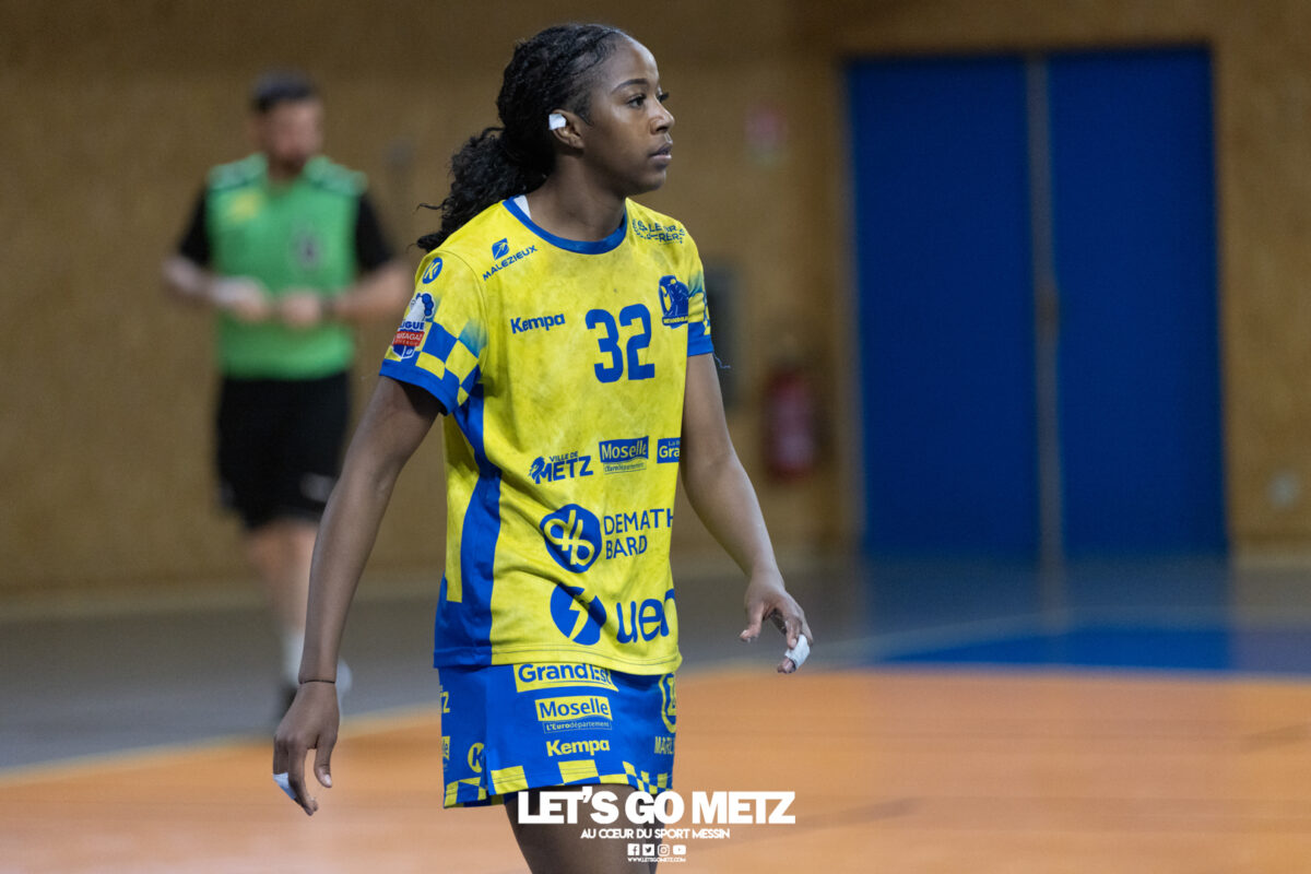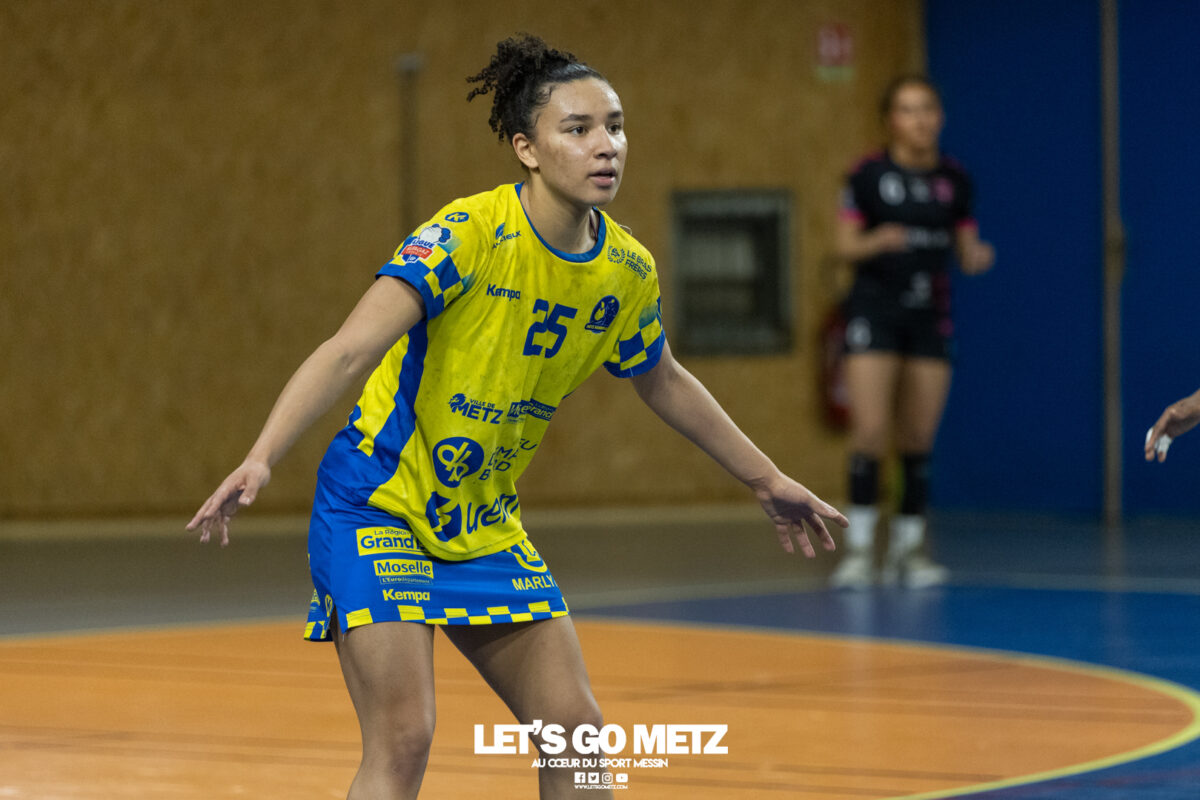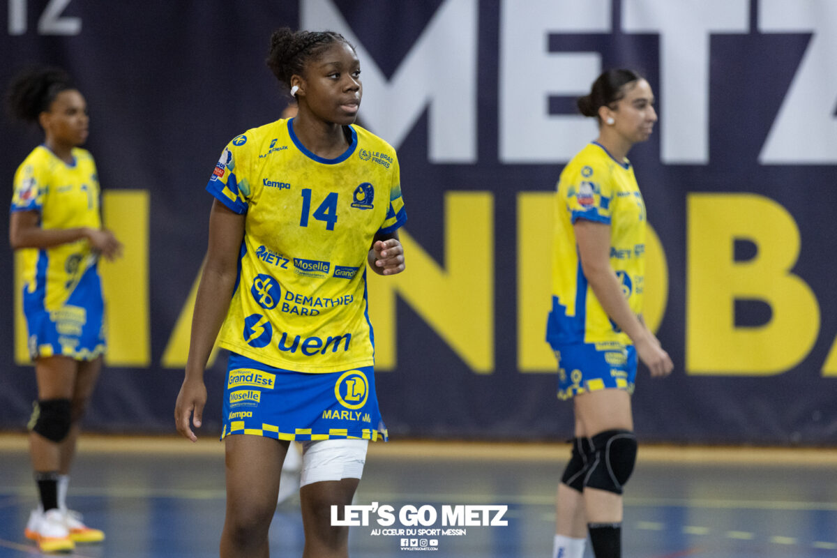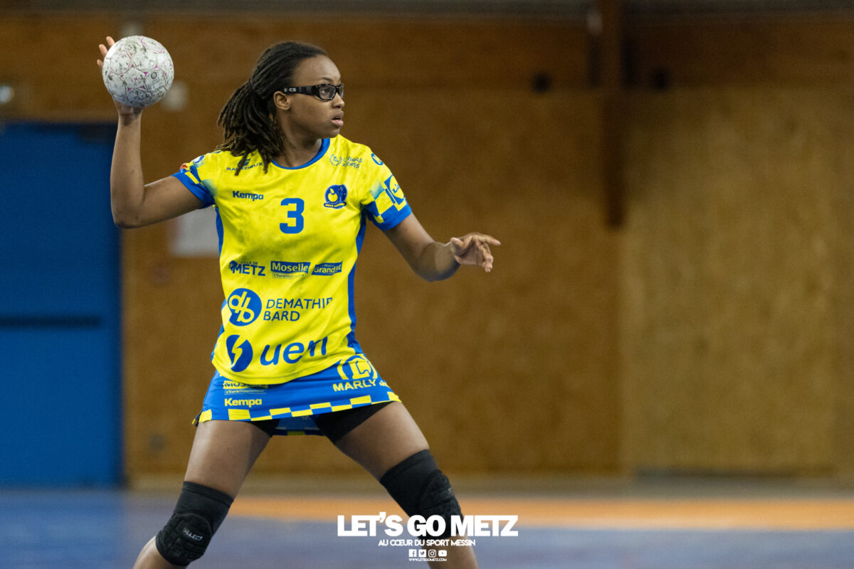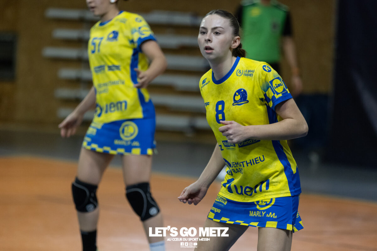 5,5K L’équipe de Nationale 1 Féminine (N1F) de Metz Handball recevait Noisy-le-Grand dans le cadre de la 16ème journée de compétition. Après une victoire contre Serris la semaine passée, c’est un défi de taille qui attendait l’équipe de Nationale 1 Féminine (N1F) de Metz Handball ce samedi dans le cadre de la réception de Noisy-le-Grand. Les jeunes Dragonnes, premières du classement accueillaient leurs dauphines, candidates à la montée en D2F, pour décider du sort de la compétition. Au match aller, les messines s’étaient imposées en terres franciliennes sur le score de 32 à 27 et le début de match retour donnait le sentiment d’un scénario similaire. Elea Ferdilus et Maily Etilopy trouvaient le chemin des buts tandis que Tatjana Cinku s’assurait de stopper les tentatives adverses (02-00, 3ème). Un mauvais coup reçu par Clémence Castets venait cependant casser quelque peu la dynamique. Les joueuses de Noisy-le-Grand en profitaient pour prendre le contrôle du match en profitant notamment des parades de Romane De Lopetegui (03-04, 12ème). La suite de la mi-temps voyait Metz Handball tenter de reprendre le dessus, avec peu de succès, considérant la difficulté rencontrée par les habituelles incontournables à performer à leur meilleur niveau par méforme ou tout simplement muselées. Dans cette dynamique, des profils généralement plus discrets comme Marie-Eve Holler et Anaïs Ababsa en profitaient pour se montrer à leur avantage mais cela ne suffisait pas à conclure la mi-temps avec un avantage, bien au contraire (10-12, mi-temps). De l’inconstance à plusieurs niveaux Pour espérer l’emporter, les jeunes Dragonnes devaient faire mieux lors du second acte, mais avec dans le camp adverse plusieurs anciennes professionnelles comme Astride Ngouan, Karichma Ekoh ou Adja Keita, la tâche s’avérait ardue. Une autre difficulté majeure reposait sur l’arbitrage globalement peu clair et peu régulier à l’encontre des deux équipes au fil de la soirée, occasionnant des échanges tendus à répétition.Après avoir vu l’écart grandir en leur défaveur, les protégées de Nina Kanto puisaient cependant dans leurs réserves pour revenir à un but via deux réalisations de Clémence Castets (14-15, 41ème). Cela ne faisait pas trembler les franciliennes pour autant, qui remettaient un coup de collier pour assurer à nouveau une avance de quatre buts et garantir une fin de rencontre tendue (15-19, 48ème). Les messines entamaient toutefois les dix dernières minutes avec un vrai sens de la rébellion. Une parade de Tajana Cinku se transformait en but d’Anaïs Ababsa avant que Fiona Gooroosamy ajoute un jet de sept mètres, que Ludyvine Kaakil Talaba inscrive son nom sur la feuille de match et que Marie-Eve Holler valide l’égalisation sous une belle ovation du public (20-20, 56ème). Mais cela ne suffisait pas. Jamais en position de prendre l’avantage après cela, les jeunes Dragonnes devaient s’en remettre à jouer le match nul mais un dernier cafouillage laissait les célébrations à Noisy-le-Grand, nan sans une petite dose de confusion en chemin. Score final de ce Metz Handball – Noisy-le-Grand en N1F : 21 – 22 Cette fin de série de victoires et la perte de la première place de la poule aux mains de Noisy-le-Grand ne marquent pas la fin de la saison. Les joueuses en jaune et bleu pourront se relancer lors du prochain match de N1F qui aura lieu à domicile alors que l’équipe de l’ASPTT Strasbourg se déplacera au gymnase du Technopole le 28 mars à 19h00. La galerie du match Les stats de la rencontre Metz HandballNavarro (2 parades), Cinku (11 parades)Ababsa (5 but sur 6 tir), Atangana (2/7, capitaine), Castets (3/6), Etilopy (1/5), Ferdilus (2/5), Giliberto, Gooroosamy (2/4), Goval (2/5), Holler (3/4), Kaakil Talaba (1/1), Nguon, Thevenot. Noisy-le-GrandDe Lopetegui (12 parades), Trifu (2 parades)Cossou (2 buts sur 5 tirs), Dorson (1/1), Ekoh (5/9), Keita (6/11), Mace (2/3), Mbala (1/2), Mosabau (1/1), Mpioso (1/3), N’Gouan (1/1), Yatera (2/3), Zediri (0/2). Crédit photo : Matthieu Henkinet / Let’s Go Metz