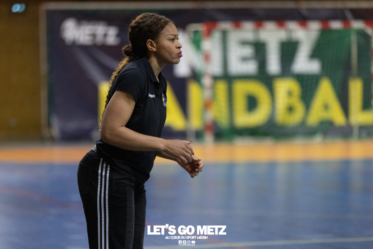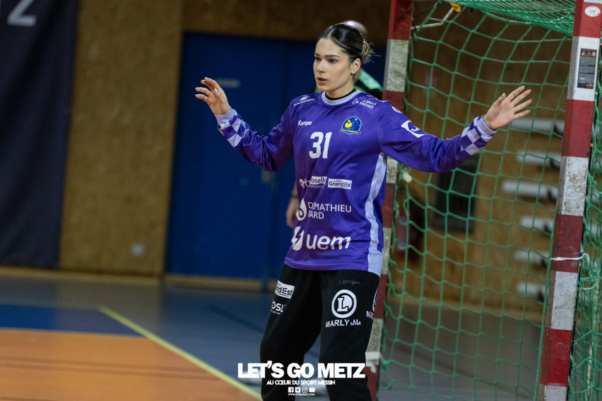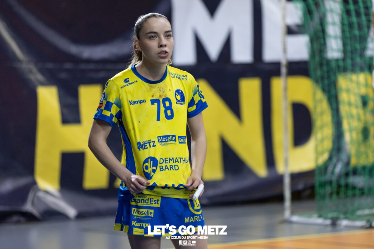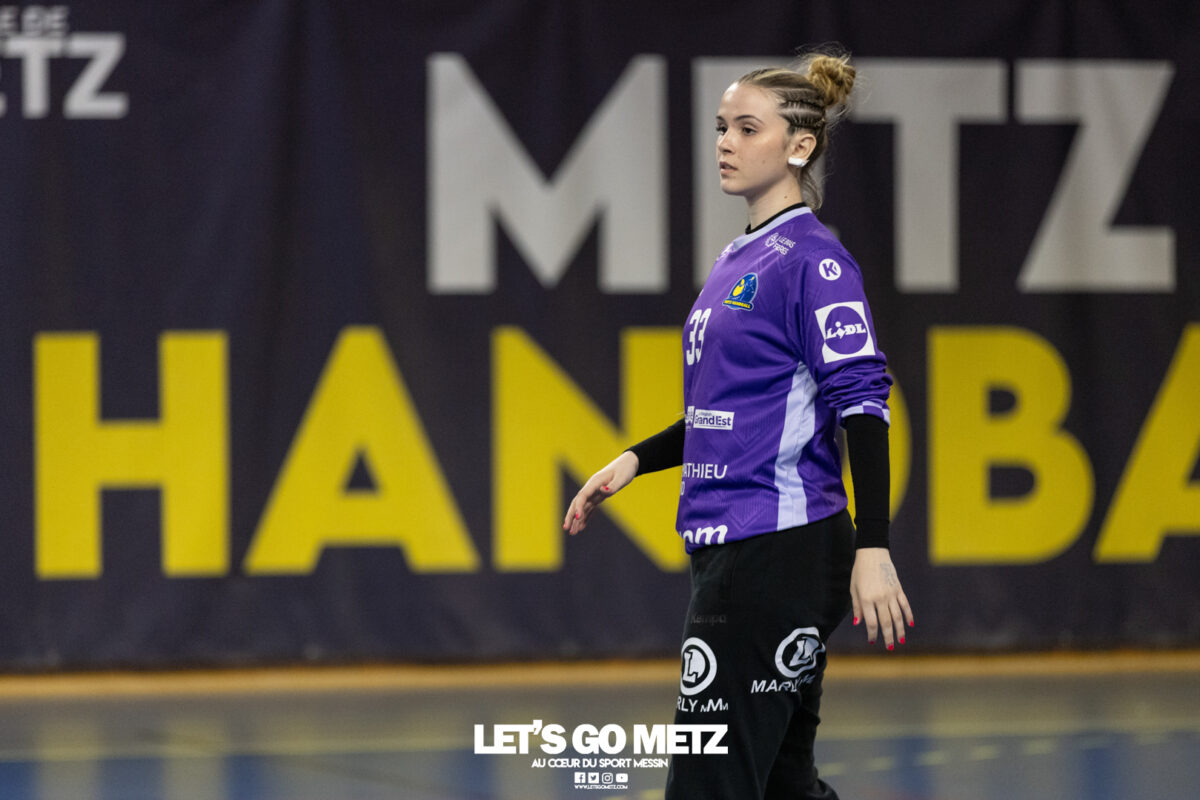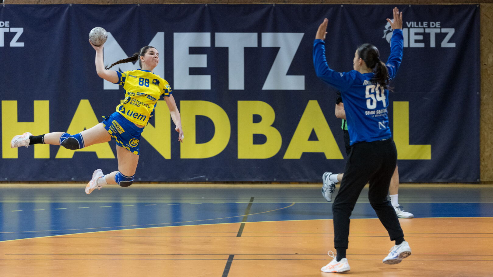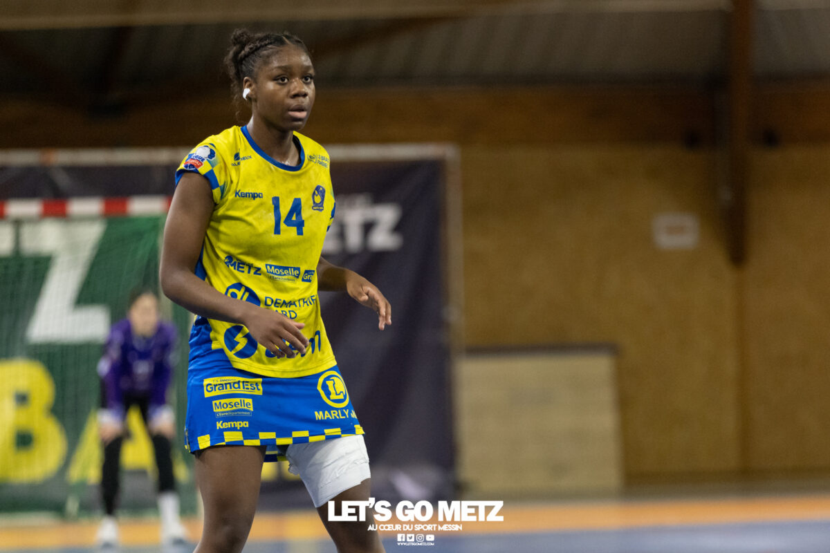 5,5K L’équipe de Nationale 1 Féminine (N1F) de Metz Handball recevait Noisy-le-Grand dans le cadre de la 16ème journée de compétition. Après une victoire contre Serris la semaine passée, c’est un défi de taille qui attendait l’équipe de Nationale 1 Féminine (N1F) de Metz Handball ce samedi dans le cadre de la réception de Noisy-le-Grand. Les jeunes Dragonnes, premières du classement accueillaient leurs dauphines, candidates à la montée en D2F, pour décider du sort de la compétition. Au match aller, les messines s’étaient imposées en terres franciliennes sur le score de 32 à 27 et le début de match retour donnait le sentiment d’un scénario similaire. Elea Ferdilus et Maily Etilopy trouvaient le chemin des buts tandis que Tatjana Cinku s’assurait de stopper les tentatives adverses (02-00, 3ème). Un mauvais coup reçu par Clémence Castets venait cependant casser quelque peu la dynamique. Les joueuses de Noisy-le-Grand en profitaient pour prendre le contrôle du match en profitant notamment des parades de Romane De Lopetegui (03-04, 12ème). La suite de la mi-temps voyait Metz Handball tenter de reprendre le dessus, avec peu de succès, considérant la difficulté rencontrée par les habituelles incontournables à performer à leur meilleur niveau par méforme ou tout simplement muselées. Dans cette dynamique, des profils généralement plus discrets comme Marie-Eve Holler et Anaïs Ababsa en profitaient pour se montrer à leur avantage mais cela ne suffisait pas à conclure la mi-temps avec un avantage, bien au contraire (10-12, mi-temps). De l’inconstance à plusieurs niveaux Pour espérer l’emporter, les jeunes Dragonnes devaient faire mieux lors du second acte, mais avec dans le camp adverse plusieurs anciennes professionnelles comme Astride Ngouan, Karichma Ekoh ou Adja Keita, la tâche s’avérait ardue. Une autre difficulté majeure reposait sur l’arbitrage globalement peu clair et peu régulier à l’encontre des deux équipes au fil de la soirée, occasionnant des échanges tendus à répétition.Après avoir vu l’écart grandir en leur défaveur, les protégées de Nina Kanto puisaient cependant dans leurs réserves pour revenir à un but via deux réalisations de Clémence Castets (14-15, 41ème). Cela ne faisait pas trembler les franciliennes pour autant, qui remettaient un coup de collier pour assurer à nouveau une avance de quatre buts et garantir une fin de rencontre tendue (15-19, 48ème). Les messines entamaient toutefois les dix dernières minutes avec un vrai sens de la rébellion. Une parade de Tajana Cinku se transformait en but d’Anaïs Ababsa avant que Fiona Gooroosamy ajoute un jet de sept mètres, que Ludyvine Kaakil Talaba inscrive son nom sur la feuille de match et que Marie-Eve Holler valide l’égalisation sous une belle ovation du public (20-20, 56ème). Mais cela ne suffisait pas. Jamais en position de prendre l’avantage après cela, les jeunes Dragonnes devaient s’en remettre à jouer le match nul mais un dernier cafouillage laissait les célébrations à Noisy-le-Grand, nan sans une petite dose de confusion en chemin. Score final de ce Metz Handball – Noisy-le-Grand en N1F : 21 – 22 Cette fin de série de victoires et la perte de la première place de la poule aux mains de Noisy-le-Grand ne marquent pas la fin de la saison. Les joueuses en jaune et bleu pourront se relancer lors du prochain match de N1F qui aura lieu à domicile alors que l’équipe de l’ASPTT Strasbourg se déplacera au gymnase du Technopole le 28 mars à 19h00. La galerie du match Les stats de la rencontre Metz HandballNavarro (2 parades), Cinku (11 parades)Ababsa (5 but sur 6 tir), Atangana (2/7, capitaine), Castets (3/6), Etilopy (1/5), Ferdilus (2/5), Giliberto, Gooroosamy (2/4), Goval (2/5), Holler (3/4), Kaakil Talaba (1/1), Nguon, Thevenot. Noisy-le-GrandDe Lopetegui (12 parades), Trifu (2 parades)Cossou (2 buts sur 5 tirs), Dorson (1/1), Ekoh (5/9), Keita (6/11), Mace (2/3), Mbala (1/2), Mosabau (1/1), Mpioso (1/3), N’Gouan (1/1), Yatera (2/3), Zediri (0/2). Crédit photo : Matthieu Henkinet / Let’s Go Metz
