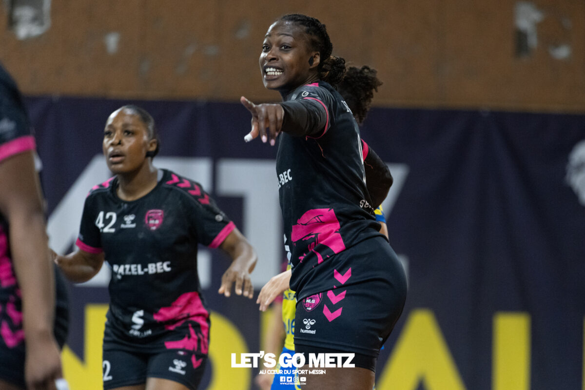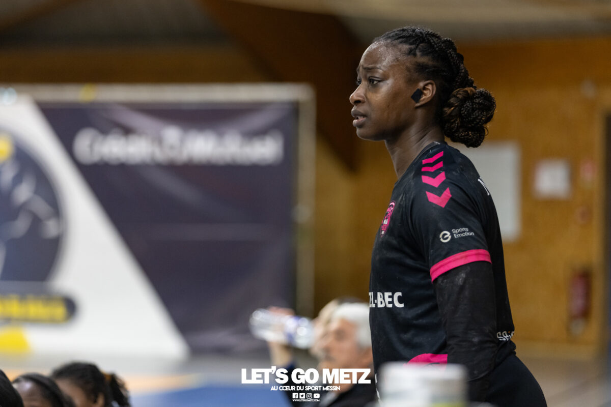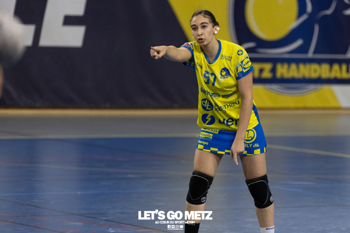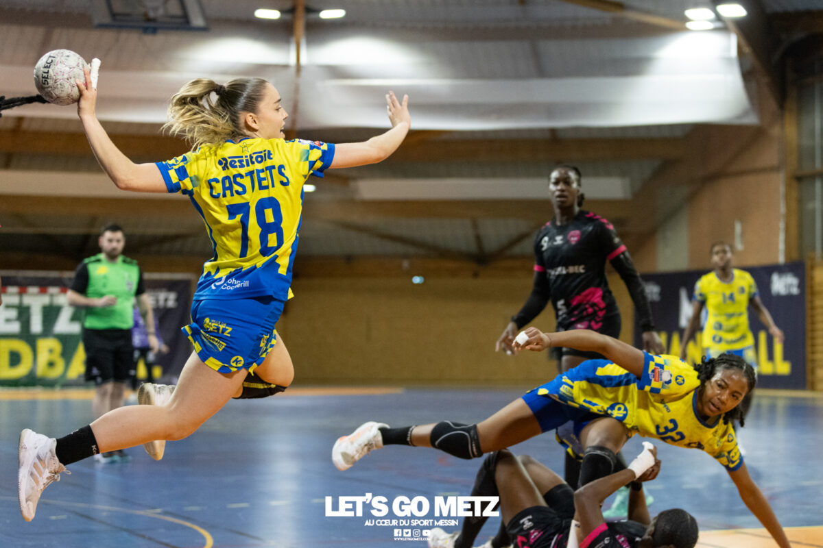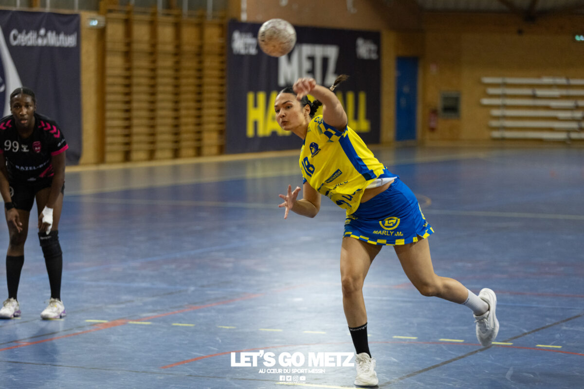 5,5K L’équipe de Nationale 1 Féminine (N1F) de Metz Handball recevait Noisy-le-Grand dans le cadre de la 16ème journée de compétition. Après une victoire contre Serris la semaine passée, c’est un défi de taille qui attendait l’équipe de Nationale 1 Féminine (N1F) de Metz Handball ce samedi dans le cadre de la réception de Noisy-le-Grand. Les jeunes Dragonnes, premières du classement accueillaient leurs dauphines, candidates à la montée en D2F, pour décider du sort de la compétition. Au match aller, les messines s’étaient imposées en terres franciliennes sur le score de 32 à 27 et le début de match retour donnait le sentiment d’un scénario similaire. Elea Ferdilus et Maily Etilopy trouvaient le chemin des buts tandis que Tatjana Cinku s’assurait de stopper les tentatives adverses (02-00, 3ème). Un mauvais coup reçu par Clémence Castets venait cependant casser quelque peu la dynamique. Les joueuses de Noisy-le-Grand en profitaient pour prendre le contrôle du match en profitant notamment des parades de Romane De Lopetegui (03-04, 12ème). La suite de la mi-temps voyait Metz Handball tenter de reprendre le dessus, avec peu de succès, considérant la difficulté rencontrée par les habituelles incontournables à performer à leur meilleur niveau par méforme ou tout simplement muselées. Dans cette dynamique, des profils généralement plus discrets comme Marie-Eve Holler et Anaïs Ababsa en profitaient pour se montrer à leur avantage mais cela ne suffisait pas à conclure la mi-temps avec un avantage, bien au contraire (10-12, mi-temps). De l’inconstance à plusieurs niveaux Pour espérer l’emporter, les jeunes Dragonnes devaient faire mieux lors du second acte, mais avec dans le camp adverse plusieurs anciennes professionnelles comme Astride Ngouan, Karichma Ekoh ou Adja Keita, la tâche s’avérait ardue. Une autre difficulté majeure reposait sur l’arbitrage globalement peu clair et peu régulier à l’encontre des deux équipes au fil de la soirée, occasionnant des échanges tendus à répétition.Après avoir vu l’écart grandir en leur défaveur, les protégées de Nina Kanto puisaient cependant dans leurs réserves pour revenir à un but via deux réalisations de Clémence Castets (14-15, 41ème). Cela ne faisait pas trembler les franciliennes pour autant, qui remettaient un coup de collier pour assurer à nouveau une avance de quatre buts et garantir une fin de rencontre tendue (15-19, 48ème). Les messines entamaient toutefois les dix dernières minutes avec un vrai sens de la rébellion. Une parade de Tajana Cinku se transformait en but d’Anaïs Ababsa avant que Fiona Gooroosamy ajoute un jet de sept mètres, que Ludyvine Kaakil Talaba inscrive son nom sur la feuille de match et que Marie-Eve Holler valide l’égalisation sous une belle ovation du public (20-20, 56ème). Mais cela ne suffisait pas. Jamais en position de prendre l’avantage après cela, les jeunes Dragonnes devaient s’en remettre à jouer le match nul mais un dernier cafouillage laissait les célébrations à Noisy-le-Grand, nan sans une petite dose de confusion en chemin. Score final de ce Metz Handball – Noisy-le-Grand en N1F : 21 – 22 Cette fin de série de victoires et la perte de la première place de la poule aux mains de Noisy-le-Grand ne marquent pas la fin de la saison. Les joueuses en jaune et bleu pourront se relancer lors du prochain match de N1F qui aura lieu à domicile alors que l’équipe de l’ASPTT Strasbourg se déplacera au gymnase du Technopole le 28 mars à 19h00. La galerie du match Les stats de la rencontre Metz HandballNavarro (2 parades), Cinku (11 parades)Ababsa (5 but sur 6 tir), Atangana (2/7, capitaine), Castets (3/6), Etilopy (1/5), Ferdilus (2/5), Giliberto, Gooroosamy (2/4), Goval (2/5), Holler (3/4), Kaakil Talaba (1/1), Nguon, Thevenot. Noisy-le-GrandDe Lopetegui (12 parades), Trifu (2 parades)Cossou (2 buts sur 5 tirs), Dorson (1/1), Ekoh (5/9), Keita (6/11), Mace (2/3), Mbala (1/2), Mosabau (1/1), Mpioso (1/3), N’Gouan (1/1), Yatera (2/3), Zediri (0/2). Crédit photo : Matthieu Henkinet / Let’s Go Metz