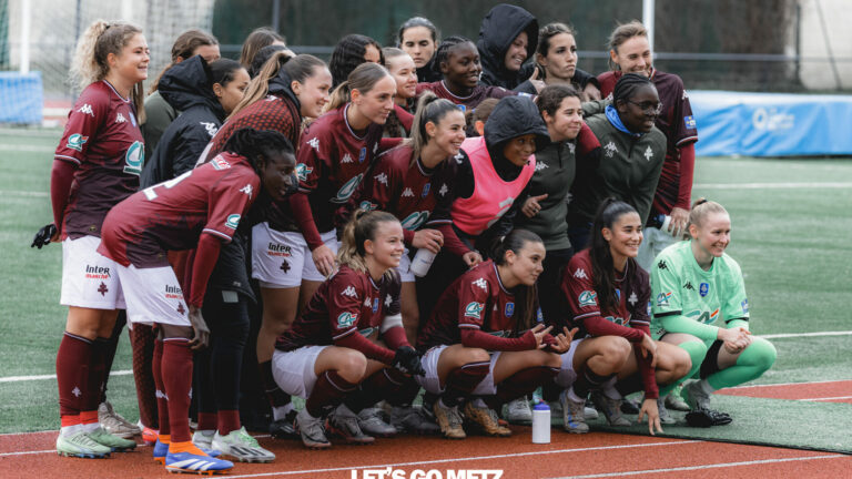 1,3K Le FC Metz s’est facilement imposé au stade Dezavelle face au Puy Foot 43 (4-0) et se qualifie pour les 16e de finale de la Coupe de France féminine. Une réussite offensive qu’il faudra confirmer en Seconde Ligue… En grande difficulté en Seconde Ligue, le FC Metz s’offre une nouvelle bouffée d’oxygène en Coupe de France féminine. Comme face à Molsheim (R1) il y a quelques semaines au tour précédent, les protégées de Marine Morel ont pu faire le plein de confiance face à un adversaire de calibre inférieur. Le club à la Croix de Lorraine s’est imposé sans trop de difficulté sur son terrain, 4 buts à 0, face au Puy Foot 43, pensionnaire de D3 Féminine.C’est Inès Boutaleb qui trouvait la faille la première, d’une frappe imparable (1-0). Peu de temps après, sur un bon service d’Amélie Joseph, Leina Feddaoui fusillait la gardienne auvergnate et mettait les siennes à l’abri, juste avant la pause (2-0). Melissa Bethi aggravait le score au retour des vestiaires (3-0). Sur pénalty, Seynabou Mbengue parachevait la belle victoire messine (4-0).Le FC Metz a tenu son rang et parfaitement fait le boulot face au Puy Foot 43 et se qualifie pour les 16e de finale de la Coupe de France Féminine. Place maintenant à de longues semaines de repos pour les Messines, avant un déplacement crucial (19 janvier) sur la pelouse d’Orléans, bon dernier de Seconde Ligue. FC Metz 4-0 Le Puy Foot 43 Mi-temps : 2-0. Buts pour le FC Metz : Boutaleb (43′), Feddaoui (45′), Bethi (74′), Mbengue (s.p. 78′) Compo FC Metz : Nottelet – Lambert (Jacob 46′), Antoine, Petitjean, Thivillon, Munier, Rougemont (cap) (Coulibaly 71′), Bethi, Feddaoui (Oliveira Bras 60′), Boutaleb, Joseph (Mbengue 60′) Crédit photo : Julien Buret / Let’s Go Metz