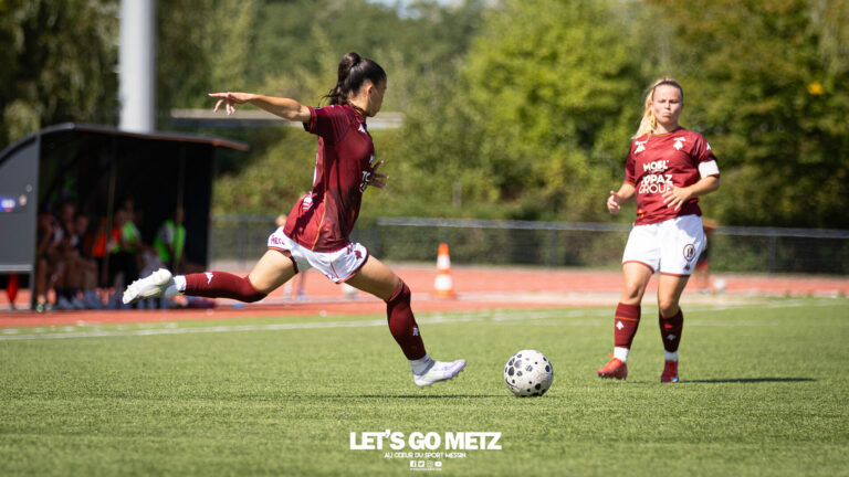 1,4K Les phases de groupes débutent ce weekend pour la première édition de la Coupe de la Ligue Féminine de Football Professionnel. Le FC Metz reçoit l’AJ Auxerre sur la pelouse d’Algrange et va vouloir se racheter après sa première défaite en Seconde Ligue. Après une entame de championnat difficile dimanche dernier au Stade Dezavelle face à l’OGC Nice, le FC Metz va pouvoir se racheter dès samedi 15h00 contre l’AJ Auxerre, pour l’inauguration de la première édition de la Coupe de la Ligue Féminine de Football Professionnel. Un premier match de phase de groupe délocalisé à Algrange, là où tout a commencé pour les Grenats, au Stade Municipal du Batzenthal. Tandis que Marine Morel a fustigé ses joueuses à la sortie de la première rencontre de Seconde Ligue, furieuse du résultat comme du contenu, l’occasion lui est donnée de faire tourner l’effectif et de donner sa chance à certaines Messines, laissées en tribune pour ce début de championnat : « J’ai dix joueuses en tribune aujourd’hui, les choix je les ferai », expliquait-elle dimanche. Le FC Metz face à l’AJ Auxerre d’Inès Boutaleb Pour débuter cette nouvelle compétition, les Grenats vont devoir se sortir du piège Auxerrois. Le club bourguignon, qui a inauguré sa section féminine en 2018, vient d’atteindre son objectif principal en accédant à la Seconde Ligue féminine. Une double montée en deux ans, couronnée par un titre en Régional 1 et un autre en Division 3 Féminine. L’ascension fulgurante de l’AJA n’est pas sans rappeler celui de la section féminine du RC Lens. Et pour réussir au second étage du football féminin, les dirigeants auxerrois ont recruté, entre autre, une ancienne messine, très expérimentée, en la personne d’Inès Boutaleb. Si l’ex Grenat n’a pas marqué lors de la première journée, elle a largement contribué au succès des siennes face l’En Avant Guingamp. Un début de championnat réussi donc, qui permet aux joueuses de l’AJA de nourrir bien des ambitions cette année. Les Messines sont prévenues. Crédit photos : Julien Buret/Let’s Go Metz (Image en Une) et AJA Féminine Officiel