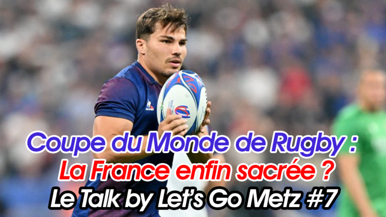 443 Retrouvez le dernier épisode de notre podcast « Le Talk by Let’s Go Metz », dédié à l’Equipe de France de Rugby et ses chances pour la Coupe du Monde 2023, sur notre compte Spotify et notre chaîne YouTube. Nouveau numéro de notre podcast « Le Talk by Let’s Go Metz ». Au programme une émission spéciale Coupe du Monde de Rugby 2023. L’Equipe de France a fait tomber les All Blacks (27-13), en ouverture du Mondial, vendredi dernier. Arthur Carmier et Valentin Lachaux reviennent sur cette rencontre inaugurale et sur les chances de titres des Bleus, favoris de la compétition. Un match que peut-être suivi sur le parvis de la Gare de Metz, place du Général de Gaulle. Le RC Metz Moselle, porté par la ville et le département, a monté une fanzone où nous sommes allés vendredi dernier. Un reportage que vous pourrez découvrir jeudi à 18h30 dans 100% Sport, le rendez-vous de Let’s Go Metz sur les ondes sur de France Bleu Lorraine.
