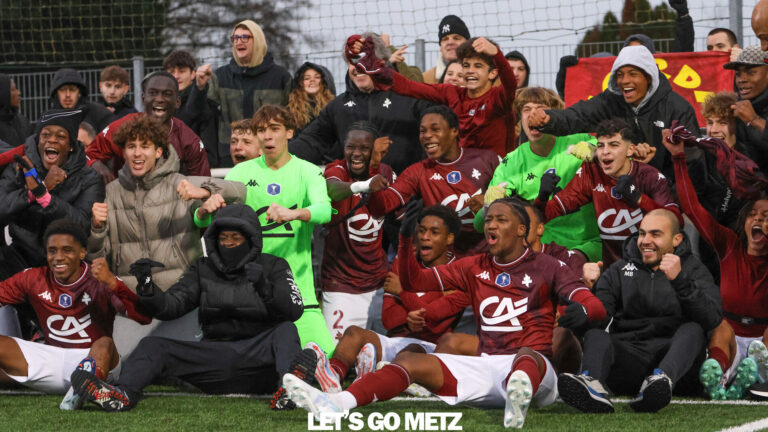 1,8K Ce dimanche 15 décembre, le FC Metz (U18) accueillait le RC Strasbourg (U18) dans le cadre du 1er tour fédéral de la Coupe Gambardella. Les Grenats se sont imposés de justesse devant leurs supporters à la plaine de jeux Saint-Symphorien. Le FC Metz et le RC Strasbourg signaient leur entrée en lice dans la coupe Gambardella par un derby. Cela aurait pu rappeler de mauvais souvenirs aux Messins qui avaient été éliminés par l’ASNL lors de l’édition précédente. Mais nous ne pouvions douter de la détermination des acteurs. L’enjeu sportif se mélangeait à celui de l’honneur, devant un public nombreux. Avant la rencontre, il était difficile de dégager un favori entre les deux formations. Chacune des équipes évolue dans le championnat national u19 dans lequel elles sont séparées seulement de trois points. Un FC Metz plus réaliste Sur l’ensemble de la rencontre, les Strasbourgeois ont plutôt dominé. Ils contrôlaient la possession de balle, entraient plus souvent dans la surface de réparation messine et tentaient davantage leur chance. Ils marquaient un but logique par l’intermédiaire de leur attaquant de pointe Massaoly Diarra (0-1, 21′). Après une première mi-temps maîtrisée, les Alsaciens retournaient au vestiaire avec un avantage au score (0-1). Mais les Messins ne baissaient pas les bras. Les Grenats se montraient notamment plus solides dans les duels, récupérant ainsi de nombreux ballons. Face à un pressing collectif appuyé, le gardien strasbourgeois commettait une erreur fatale. Il manquait complètement sa relance et offrait un ballon de but à l’attaquant messin Yaniss Mladjao. Ce dernier ne tergiversait pas et remportait son un-contre-un pour égaliser (1-1, 61′). Dans la foulée, les Messins marquaient un but de grande classe (2-1, 63′). Nathan Mbala reprenait un centre à ras-de-terre et trompait le portier strasbourgeois avec un joli coup du foulard. Le FC Metz faisait preuve d’un réalisme remarquable, avec deux buts en autant de tirs cadrés sur la deuxième mi-temps. En fin de match, les esprits s’échauffaient un petit peu. Les duels devenaient plus rugueux. Le combat devenait de plus en plus physique. A ce jeu là, les Messins se montraient supérieurs. Ils pouvaient notamment compter sur l’incroyable puissance de l’attaquant Brian Madjo, qui était constamment utilisé par ses partenaires en point d’appui. Il utilisait sa force et sa vitesse pour conserver le ballon et permettre au bloc messin de remonter. Après le coup de sifflet final, nous observions une altercation entre joueurs strasbourgeois et messins. Chambrage d’un côté, frustration de l’autre, cet incident reflétait bien la tension présente sur la pelouse pendant 90 minutes. L’équipe U18 du FC Metz disputera son deuxième tour (32e de finale) en Coupe Gambardella le dimanche 12 janvier 2025. FC Metz (U18) 2-1 RC Strasbourg (U18) Score à la mi-temps : 0-1FC Metz : Poillion – Nassoko, Strotz, Thomas, Kokoro (cap.) – Goncalves Nascimento, Song Bahanag, Soubeir – Gnemagnon, Mladjao, Mbala.RC Strasbourg : Kerchaert – Delecolle, Cisse, Mendy, Lung – Marechal, Messi Tanfouri, Sabaly – Diarra, Kodia, Vangwa.Buts pour le FC Metz : Yaniss Mladjao (61′), Nathan Mbala (63′) ; pour le RC Strasbourg : Massaoly Diarra (21′). Crédit photo : Stephan Weyrath / Let’s Go Metz