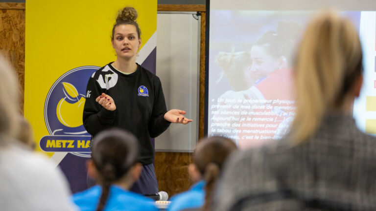 491 Le cycle menstruel ne doit plus être un tabou dans le sport féminin; Metz Handball, en lien avec la Ligue Féminine de Handball, proposait mardi un temps d’échange sur le sujet à ses jeunes joueuses. Le sport féminin continue de progresser en France mais certains tabous doivent encore être écartés, parmi eux : le cycle menstruel. À cet effet la Ligue Féminine de Handball a mis en place un plan national de sensibilisation aux problématiques que peuvent rencontrer les sportives. À Metz cela s’est traduit par un temps d’échanges entre Camille Depuiset, gardienne de Metz Handball, Vanessa Khalfa, représentante de la LFH et des jeunes joueuses U15 et U16 du club messin Vanessa Khalfa, Ligue Féminine de Handball Un moment bienvenu pour partager des informations clés, des anecdotes, mais surtout libérer la parole sur des sujets souvent négligés, parfois jusque dans le cadre familial. Dans le parcours d’une sportive les cycles menstruels peuvent s’avérer être aussi importants que le sommeil, la nutrition ou encore la préparation mentale. 84% des joueuses de haut niveau ressentent leurs règles comme une difficulté, pourtant seulement 23% d’entre elles ont déjà échangé sur le sujet avec le staff. A Metz Handball, les joueuses professionnelles disposent depuis plusieurs saisons d’une application permettant de faire intelligemment le suivi de leur santé avec le staff. Cet évènement auprès des jeunes joueuses, Camille Depuiset ne s’imaginait pas ne pas y prendre part. Je trouve que c’est une initiative très importante. Je veux m’investir d’avantage pour ces sujets dont on a encore du mal à parler. Pouvoir évoquer les cycles menstruels auprès de jeunes filles c’est important parceque je sais que l’impact peut aller au delà du terrain et des performances. J’aurais aimé il y a dix ans qu’on me dise ces choses là et qu’on m’explique leur lien avec mes performances sur le terrain. Camille Depuiset, gardienne de Metz Handball Camille Depuiset, gardienne de Metz Handball Olivier Ghisu, le coach de l’équipe U16 féminine de Metz Handball a lui aussi observé d’un œil positif ces échanges, avec un regard d’éducateur mais aussi de père. Ces échanges aident à désacraliser des sujets importants. Elles savent désormais qu’elles peuvent venir vers moi et m’en parler. C’est aussi mon rôle, je ne suis pas là uniquement pour leur enseigner le handball. Olivier Ghisu, entraîneur de l’équipe U16 élite La trentaine de jeunes participantes à cet échange ont pu repartir avec d’avantage de certitudes et de clés de compréhension sur le fonctionnement naturel de leur corps et le lien avec le sport. Metz Handball pourrait reconduire l’opération de sensibilisation à l’impact du cycle menstruel très prochainement avec d’autres sections du club.Une récolte de produits périodiques à destination des plus démunies sera également mise en place en marge de la réception de Saint-Amand mercredi soir. Crédit photo : Matthieu Henkinet