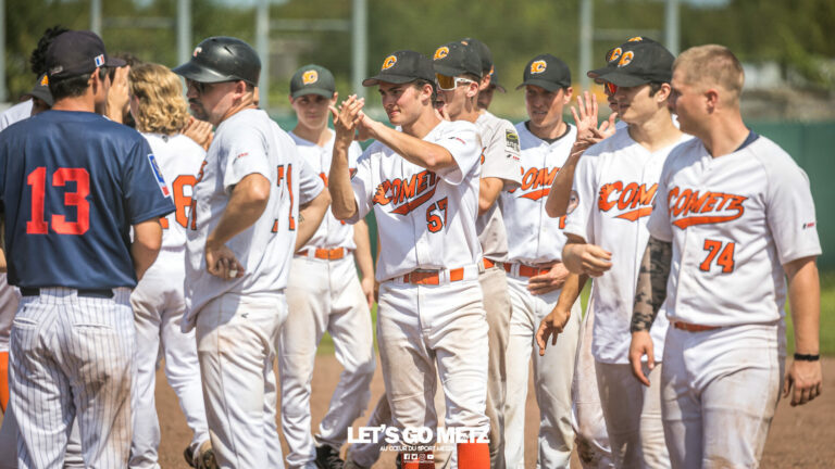 659 D1 Baseball – Dans leur série de play-down contre Rouen, les Cometz ont perdu leurs deux premiers matchs à Metz. A moins d’un exploit en Normandie, les joueurs de Pierre Cézard devront encore batailler pour assurer leur maintien dans l’élite. Le défi était de taille pour les Cometz, face à Rouen, au premier tour des play-down de D1 Baseball. Et pour cause ! Les Normands, septuples champions de France en titre, ont remporté 17 des 20 derniers titres nationaux mis en jeu en première division. Autant dire que remporter ne serait-ce qu’un match face à cet ogre relevait de l’exploit pour les hommes de Pierre Cézard. D’autant que les Cometz de Metz devaient faire sans Armani Henderson (fracture du poignet), out jusqu’en fin de saison. Le deuxième all star messin, Shane Priest, a lui été sorti en cours de match samedi, par précaution.Durant cette première rencontre du samedi, les Cometz ont tout de même mené 1-0 jusqu’en début de 6ème manche, avant de subir la déferlante rouennaise. Score final 13-3 pour les visiteurs. Le deuxième match de dimanche fut plus serré, mais nettement à l’avantage des visiteurs. Malgré un joli baroud d’honneur des Messins, qui ont marqué 4 points en dernière manche, Rouen s’impose 8-5 et mène donc 2-0 dans la série. « Samedi, on a fait une manche catastrophe. Dimanche, une manche qui nous coûte 4 points avec des petites erreurs. Mais globalement, on n’est pas si loin. C’est quand même intéressant avec beaucoup de jeunes sur le terrain, contre une structure plus avancée que la nôtre », rassure Pierre Cézard. Sauf exploit, à savoir remporter les matchs 3, 4 et 5 à Rouen, les Cometz de Metz devraient se battre avec Savigny-sur-Orge ou La Rochelle (1-1 dans la série), pour éviter un barrage de relégation contre le champion de D2. « On va travailler pour être prêts pour la deuxième série. Ce sera costaud pour rester, personne ne veut jouer les barrages en octobre, tard dans la saison », explique Pierre Cézard. Crédit photo : Julien Buret / Let’s Go Metz