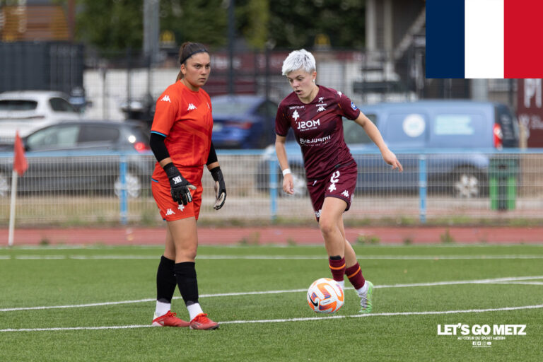 783 Les jeunes messines Emma Francart et Lucie Calba sont convoquées en Équipe de France. L’une avec les U19 pour disputer les tours préliminaires de l’euro en Pologne. L’autre avec les U18 pour participer à la Coupe du Monde en Inde. Tout va bien pour Emma Francart, revenue au FC Metz cet été en provenance du Stade de Reims. La gardienne aux 7 sélections est convoquée avec l’équipe de France féminine U19, avec laquelle elle participera au premier tour de qualification à l’Euro qui se déroule en Pologne. Les bleuettes joueront 3 matchs successifs contre l’Irlande du Nord le mardi 4 octobre, la Pologne le vendredi 7 octobre puis l’Irlande le lundi 10 octobre. A l’issue de ces 3 rencontres de phases de groupes, les joueuses de Sandrine Ringler pourront décrocher leur billet pour la phase finale du championnat. Cette phase finale 2023 se disputera du 18 au 30 juillet prochain en Belgique. Emma Francart lors d’un match amical d’avant-saison Lucie Calba retenue pour la Coupe du Monde U18 Sélectionnée en Bleu comme sa coéquipière Emma Francart, la jeune attaquante grenat Lucie Calba va quant à elle participer à sa première coupe du monde avec l’équipe de France féminine U18. Après une troisième place à l’euro en mai dernier décrochée grâce à la victoire 2-0 face au Pays-Bas (notamment avec une réalisation de Lucie Calba), les tricolores ont décroché leur billet pour jouer la coupe du monde. Malgré un début de saison marqué par une commotion en préparation, l’ailière messine s’est rétablie à temps pour disputer cette compétition durant laquelle elle va pouvoir s’illustrer. Cécile Locatelli et ses protégées vont s’envoler pour l’Inde le 6 octobre prochain avec pour objectif de ramener cette coupe du monde en France. Les bleuettes actuellement dans le groupe D défieront le Canada le mercredi 12 octobre, la Tanzanie le samedi 15 octobre avant d’être opposé au Japon le mardi 18 octobre. Lucie Calba au duel avec une malouine Le pain quotidien continue cependant pour le FC Metz, qui affronte La Roche/Yon ce dimanche en D2 Féminine. Les Messines ont quatre points après deux matchs de championnat. Crédit Photo : Julien Buret/LGM Léni Audin