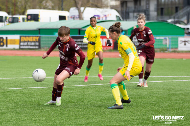 527 Face au leader Nantes, le FC Metz n’a pas démérité. Défaites 2-1 à domicile, les joueuses de Jessica Silva auraient pu espérer beaucoup mieux. Dominatrices, les Grenats ont manqué de réalisme contre des Canaris pragmatiques. Les semaines se suivent et la victoire fuit toujours les féminines du FC Metz. Clairement dans une période creuse, les filles de Jessica Silva ont cependant retrouvé de l’allant face au FC Nantes, solide leader du Groupe A de D2 Féminine. Le jeu chatoyant proposé par les Messines en première partie de saison était de retour ce dimanche après-midi à Dezavelle, en marge de la rencontre de Ligue 1 opposant le FC Metz à Monaco.Les Grenats se montraient en effet dangereuses par l’intermédiaire de Lucie Calba. La virevoltante ailière était titulaire à la pointe de l’attaque du FC Metz. Par deux fois, elle mettait en difficulté la gardienne nantaise alors qu’elle était en angle fermé, dans la surface de réparation (18′, 19′). Marjorie Boilesen imitait sa partenaire avec un joli numéro dans la défense bretonne, sans succès (22′). Contre le cours du jeu, les Messines étaient malheureusement punies. Khoury plaçait sa tête sur un coup franc venu de la droite (0-1, 27′). L’efficacité nantaise Quelques instants plus tard, Justine Lerond empêchait le pire, une nouvelle fois devant Khoury (29′). La gardienne messine était cependant trop juste sur le deuxième but nantais. Eloissaint profitait d’un centre mal repoussé pour doubler la mise (0-2, 36′). Cruel pour les joueuses de Jessica Silva qui continuaient néanmoins à jouer leur jeu. Allison Blais parvenait à combiner avec Marjorie Boilesen (47′), puis Lucie Calba (58′), mais elle butait par deux fois sur la gardienne.Les Messines manquaient de réalisme, de ce petit quelque chose qui facilite les transmissions dans les 30 derniers mètres. La meilleure défense de D2F ne voulait pas céder face aux assauts grenats. Justine Lerond allait une nouvelle fois sauver les siennes en face à face, devant Lelarge (74′). Le FC Metz allait enfin être récompensé de ses efforts grâce à Marjorie Boilesen, en renard, qui reprenait un ballon qui traînait dans la surface (1-2, 90’+2). Trop tard pour les Grenats qui ont été contraintes de s’incliner. FC Metz 1-2 FC Nantes Le XI messin : Lerond – Kouache, Rigaud, Petitjean (Picard 53′), Richard (Gherbi 46′) – Rougemont, Morel, Guay – Blais (Abdu 79′), Calba, Boilesen La réaction de Jessica Silva Déçue après la rencontre, Jessica Silva a regretté le manque d’efficacité de son équipe. Un problème qui parasite le FC Metz en 2022. Néanmoins, la coach messine s’est montrée satisfaite de la qualité de jeu proposée par ses protégées. Crédit photo : Julien Buret/LGM