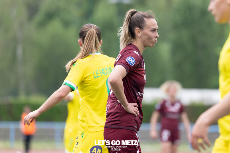 799 Les joueuses du FC Metz se sont inclinées ce dimanche face au FC Nantes. Une défaite 1 but à 0 au terme d’un match très difficile pour les Messines. Après un match nul frustrant à Orléans, les Grenats étaient dans l’obligation de rebondir. Le FC Metz recevait le FC Nantes pour le compte de la 20ème journée de D2 féminine. D’un côté, le sort des Messines était déjà scellé, mais l’objectif restait de terminer dauphines de ce groupe A. De l’autre côté, les jaunes et vertes arrivaient au stade Dezavelle avec la ferme intention de repartir en Loire-Atlantique avec les trois points. La situation était urgente pour les Nantaises, positionnées à la 7ème place synonyme de relégation. Une première mi-temps morose Dès le début de la rencontre, le FC Metz était bousculé par les multiples offensives nantaises. Heureusement, le poteau messin repoussait une tête nantaise à la 8ème minute. Pour le plus grand désarroi de Jessica Silva, les offensives jaunes et vertes allaient être récompensées. En effet, à la suite d’une belle action collective, Juliette Mossard venait punir les Mosellanes. Ce but inscrit dès la 9ème minute allait faire très mal aux pensionnaires du stade Dezavelle. « Au plus haut niveau, on ne peut pas se permettre de faire des faux départs comme aujourd’hui car cela nous coûte cher », regrette la coach du club à la Croix de Lorraine. Les minutes passaient et les Grenats ne réagissaient pas. « Nous avons énormément subi les offensives adverses« , explique Célia Rigaud. L’attaque nantaise donnait du fil à retordre à la défense messine à l’image des deux frappes de Pilar Khoury bien repoussées par Gillian Nottelet (13′ – 31′). Malmené, le FC Metz n’était pas du tout en place. Nantes profitait des moindres espaces pour perturber la défense mosellane. En fin de première période, les Grenats tentaient néanmoins d’inquiéter les visiteuses. « On a réussi à trouver plus de solutions en fin de première mi-temps et à jouer en une touche », révèle la latérale messine. En effet, à la suite d’une belle construction, Lucie Calba était tout proche de redonner espoir à son équipe avec une superbe reprise de volée (41′). La première période s’achevait sur le score de 1 but à 0 en faveur des Nantaises. « On a complétement raté notre première mi-temps en étant spectatrices de Nantes », nous livre Jessica Silva. Le FC Metz n’est pas parvenu à renverser la situation Au retour des vestiaires, les joueuses du FC Metz montraient plus d’envie d’aller renverser cette équipe du FC Nantes. Objectif, reprendre les commandes du match en attendant patiemment une brèche dans la défense adverse. La tactique s’avérait quasi payante puisque Amélie Delabre et Océane Picard se procuraient de belles situations (59′ – 63′). Elles manquaient de peu l’égalisation. « À la mi-temps, Jessica Silva a réussi à remotiver l’équipe en nous disant qu’on avait les qualités et que le match n’était pas encore fini. On a eu plus d’occasions, mais nous ne sommes pas parvenues à concrétiser devant le but« , raconte Célia Rigaud.Encouragées par le public, les féminines du FC Metz poussaient les Nantaises à reculer. Malheureusement, la frappe puis la tête de Léonie Richard (84′- 88′) ou encore la tentative de Kelly Koné (87′) ne parvenaient pas à tromper Mélodie Carré. Le match se terminait sur le score de 1 but à 0 pour les visiteuses. « L’état d’esprit était bien meilleur en deuxième mi-temps. On croyait pouvoir revenir au score. Mais, nous n’avons pas réussi à suffisamment inquiéter la gardienne adverse », explique Jessica Silva. La coach canadienne prépare déjà les prochaines échéances. « Pour les prochains matchs, nous allons essayer de tirer des leçons de cette défaite. Les blessures ne nous aident pas alors l’objectif sera de retrouver tout le monde pour la rencontre face à Strasbourg« . À l’issue de cette rencontre, le FC Metz se positionne à la 3ème place, à un petit point de Strasbourg, tenu en échec par le CA Paris 14. Il restera deux rencontres à disputer pour les Messines afin d’obtenir la deuxième place. Rendez-vous dimanche 21 mai, les Grenats recevront leur rival le RC Strasbourg. FC Metz 0-1 FC Nantes Composition du FC Metz : Nottelet – Laurier, Rigaud, Petitjean, Richard – Morel(c), Storti (Leroy 80′), Boilesen – Calba (Koné 80′), Delabre, PicardComposition du FC Nantes : Carré – Bonet, Avant, Lorgere (c), Moreira – Le Moguedec (Peneau 82′), Mossard (Bueno 90′), Koui – Khoury (Chapelle 71′), Mbengue (Banuta 71′), Eloissaint La galerie photo de la rencontre : Crédit photos : Julien Buret/LGM