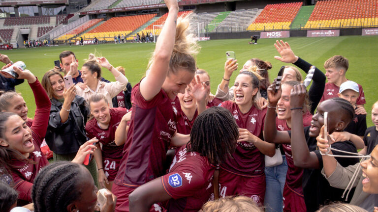 20,9K Lors de la dernière journée de D2F, le FC Metz a décroché son maintien en disposant de Montauban 3-2 sur sa pelouse. Objectif atteint pour les protégées de Jérôme Bonnet. Suspendues au score du match entre Le Mans et l’OGC Nice, les joueuses du FC Metz devaient absolument l’emporter pour assurer leur maintien en D2F. C’est chose faite après cette précieuse victoire 3-2 des Grenats devant leur public de Saint Symphorien. Un succès étriqué, dans la douleur, mais qui permet aux joueuses de Jérôme Bonnet de terminer à la neuvième place, devant Albi qui s’est incliné face à Nantes. Un match ouvert et des buts En début de rencontre, les Montalbanaises ont donné du fil à retordre aux Messines avec une grosse débauche d’énergie et un pressing haut. Mais à trop se découvrir, les visiteuses ont offert des espaces aux Grenats et fort logiquement, Luisa Oliveira Bras ouvrait la marque sur une magnifique combinaison dans la surface (1-0, 18′). Plus appliquées et meilleures techniquement, les joueuses du club à la Croix de Lorraine auraient pu doubler la mise moins de cinq minutes plus tard mais Solène Ninot loupait le cadre (2-0, 22′). Ce ne fût que partie remise pour la milieu de terrain du FC Metz qui assurait le break avant la mi-temps. Au retour des vestiaires, Metz se contentait dans un premier temps de gérer son avance, mais Montauban réduisait la marque par Charlotte Ouillon (2-1, 70′). Petit coup de froid sur Saint Symphorien mais de courte durée puisqu’Inès Boutaleb inscrivait le troisième but grenat quasiment dans la foulée (3-1, 78′). Les Montalbanaises, déjà reléguées, n’abdiquaient pas pour autant et en toute fin de match, Marie-Jo Girardot réduisait une dernière fois la marque sur un coup franc mal capté par Emmeline Mainguy (3-2, 90’) « La peur nous a un peu tétanisés jusqu’au bout ! » Perfectionniste, Jérôme Bonnet était soulagé mais conscient que le match de ses joueuses ne restera pas dans l’histoire. « Objectif atteint, même si ce match ne restera pas dans les annales. Ce qui restera c’est qu’on s’est maintenu à la dernière journée. Le technicien que je suis, ne peut pas se contenter de ce dernier match, mais c’est le football, il y a des matchs où il faut savoir ne pas perdre même si on n’est pas bon. La peur nous a un peu tétanisés jusqu’au bout. Je voulais faire une sortie pour Marine Morel car le score le permettait mais on se met le feu alors qu’il n’y a pas lieu. Mais pour finir on retiendra qu’on s’est maintenu. Ce fût une saison de D2F difficile pour le FC Metz. L’idée maintenant c’est de construire pour éviter ce genre de situation à l’avenir ». « Ce maintien en D2F est un gros soulagement pour le FC Metz… » À l’issue de la rencontre, la directrice du FC Metz, Hélène Schrub, ne cachait pas son soulagement : « Ce fût compliqué jusqu’au bout, mais voilà c’est fait. Elles n’ont rien lâché, même si le début de saison a été vraiment dur. Je pense qu’il y a plus d’une équipe qui aurait lâché en cours de saison, mais pour les filles ça n’a jamais été le cas. Elles se sont battues et aujourd’hui encore jusqu’à la dernière minute. Ça s’est joué jusqu’au bout du bout de la saison, alors bravo aux filles et à tout le staff. Ce maintien en D2F est un gros soulagement pour le FC Metz. Le foot féminin doit être un moteur pour le football français aujourd’hui. C’est important que les clubs professionnels donnent le La et soient les moteurs du football féminin auprès de la Fédération Française. » De la joie et beaucoup d’émotions À la joie, se sont mêlées des larmes d’émotion en fin de rencontre. Ce fût le cas par exemple pour la jeune milieu de terrain du FC Metz, Luisa Oliveira Bras, qui a non seulement montré tout son talent lors de la rencontre mais qui a marqué son premier but à Saint Symphorien devant sa famille et ses coéquipières en U19, le tout dans une ambiance très festive : « Je suis vraiment très satisfaite, très contente. J’ai carrément pleuré de joie. Marquer mon premier but à Saint Symphorien c’était incroyable avec cette ambiance. Je remercie d’ailleurs toutes les U19, toutes les filles qui sont venues nous soutenir, nos parents, les bénévoles, tout le monde ». Autre moment d’émotion, et pas des moindres, les adieux de Candice Gherbi et de la capitaine des Grenats, Marine Morel. Deux joueuses hors normes qui laisseront un souvenir impérissable au FC Metz. Composition du FC Metz : Mainguy, Laurier, Moreira, Morel, Petitjean, Banuta (Battouri 79′), Rougemont (Fourré 79′), Ninot (Sagna 62′), Oliveira Bras, Calba, Boutaleb Crédit photos : Julien Buret – Let’s Go Metz