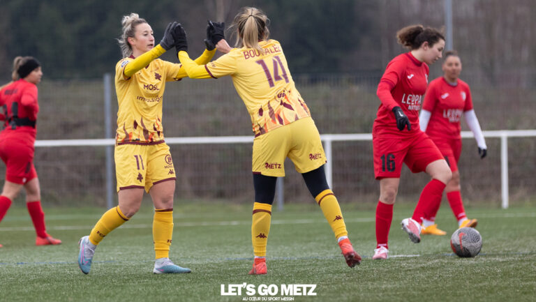 1,9K Le FC Metz a tenu tête à l’OCG Nice ce dimanche dans son déplacement sur la Côte d’Azur (0-0). Malgré ce point pris, les joueuses de José Pinot sont relégables après la victoire d’Évian. Le FC Metz a pris le point du match nul après son déplacement à Nice ce dimanche (0-0). Après leur retour en amical contre Hesperange en 2024, les Messines ont retrouvé le championnat sur la pelouse du quatrième de deuxième division féminine. « Nous sommes arrivés avec beaucoup de détermination. Pendant quatre-vingt-dix minutes, nous avons fait preuve de caractère et de courage« , a réagi José Pinot après la rencontre. L’entraîneur du club mosellan a surtout vu une défense disciplinée face aux partenaires de Fatoumata Baldé. « Nous avons encaissé très peu d’occasions face à cette balle attaque niçoise. Depuis quelques matchs, c’est un gros point positif, mais ce n’est pas suffisant dans la position actuelle« . Le FC Metz l’a compris. Malgré ce point pris, les joueuses de José Pinot deviennent relégables. Une première période terne Au coup d’envoi, les nuages ont recouvert le soleil et par la même occasion la rencontre. La première mi-temps manquait cruellement de rythme de la part des deux équipes. À ce jeu, l’OGC Nice se procurait la première situation par une percée sur le côté droit (2’). Les Niçoises restaient tout de même timides avec des frappes facilement captées par Emmeline Mainguy (9’ et 10’). Le FC Metz tentait de rares incursions dans la surface adverse. Seuls les corners apportaient du danger dans la défense bien formée de Nice. Titulaire au milieu de terrain, Luisa Oliveira Bras réussissait sa première en championnat face à l’ancienne messine Yakaré Niakaté. Les joueuses de José Pinot finissaient les quarante-cinq premières minutes sur un énième contre manqué. La meilleure occasion pour le FC Metz Après la pause, l’OGC Nice mettait la pression sur son adversaire. Les joueuses de Matthieu Esposito contrôlaient le ballon sans se créer de situations franches (55’ et 65’). Le FC Metz retrouvait des sensations à la suite de l’entrée d’Adélie Fourré à la place d’Inès Boutaleb. Les Messines se procuraient même la meilleure occasion de la partie. L’attaquante Lucie Calba perçait les lignes adverses par son dribble avant de la passer à sa coéquipière. Après un premier tir détourné par la gardienne, la jeune internationale française voyait le torse d’une des défenseurs niçoises arrêter sa balle (70’). Ce sauvetage annihilait les espoirs de marquer pour les Mosellanes. L’OGC Nice poussait sur les dernières minutes (78’, 85’ et 88’). Avec une intervention salvatrice de Clara Petitjean, le FC Metz résistait jusqu’au coup de sifflet final. Prochain match contre Rodez La série de six matchs sans victoire se poursuit pour les Messines. Même si le nul semble encourageant, la réalité rattrape les Mosellanes. Désormais relégable, le FC Metz se prépare à une rencontre déterminante le 4 février prochain. « Pour bonifier ce bon résultat, il faudra faire une bonne prestation face à Rodez« , a annoncé José Pinot. La réception du sixième du championnat va être un révélateur de la capacité des Grenats à sauver leur place en deuxième division. OGC Nice 0 – 0 FC Metz Composition OGC Nice : Saint Leger (G), Marichaud, Galli, Boudy, Von Potobsky, Niakaté, De Seixas, Robert, Prault, Baldé et Hlushchenko. Entrées en jeu : Boudaud, Naili (54′) et Bouziani (70′). Composition FC Metz : Mainguy (G), Babou, Laurier, Petitjean, Moreira, Belkacemi, Ninot, Oliveira Bras, Calba, Banuta, et Boutaleb. Entrées en jeu : Fourré (62′) et Bouktit (79′). Crédit photo : Julien Buret (archive).