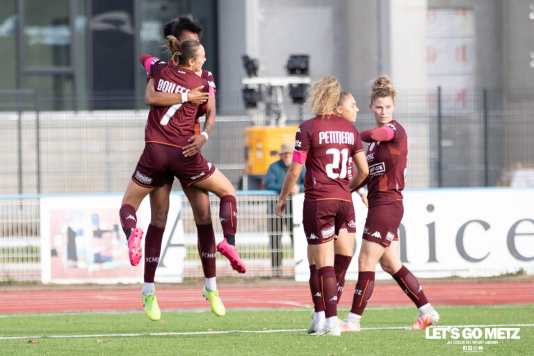 591 Dans la lutte en tête du classement de D2F, les féminines du FC Metz sont allées battre le FC Nantes sur sa pelouse 2-1. Elles pointent désormais à la quatrième place à égalité avec le LOSC et à un point des canaries et des Havraises. C’est la bonne opération du weekend pour le FC Metz en D2F. Les féminines sont allées s’offrir le scalp du FC Nantes. Les protégées de Jessica Silva ont dominé le leader incontesté du groupe A, jusqu’à présent invaincu en championnat. Une victoire 2-1 méritée avec des buts de Kelly Koné (22′) et Amélie Delabre (51′). Et grâce à cette jolie performance, les Messines pointent désormais à la quatrième place à égalité avec le LOSC et à une longueur du FC Nantes et du HAC. Le onze grenat 1 Justine Lerond6 Candice Gherbi7 Marjorie Castro Boilesen8 Marine Morel *10 Océane Picard11 Kelly Kone14 Eva Kouache (Capitaine)17 Amélie Delabre18 Célia Rigaud20 Justine Rougemont21 Clara Petitjean * * Interview grand format à retrouver sur letsgometz.com Une victoire qui fait du bien Après la défaite à domicile face à Saint-Malo, les joueuses du club à la Croix de Lorraine s’étaient fixées comme objectif de faire un résultat à Nantes. Mais plus encore, de prouver que le FC Metz a des arguments pour la montée. Face à la meilleure attaque et la meilleure défense du championnat, les Messines ont offert une prestation digne d’un prétendant au titre. Trois points qui font le plus grand bonheur de la coach des grenats. Jessica Silva à l’entraînement, à la veille de la victoire à Nantes. On est vraiment contentes… Nantes est une très belle équipe mais on a su rester disciplinées et très patientes dans le jeu. Dès qu’on a eu le ballon, on s’est créées des opportunités qu’on a conclues efficacement. On a suivi le plan de match qu’on voulait mettre en place. On a proposé un très bon football et les filles ont tout laissé sur le terrain. Embouteillage en haut du classement Le havre et Nantes à 17 points, le LOSC (un match en moins) et le FC Metz à 16 et le RC Lens à 13. Cinq équipes pour un seul ticket vers l’élite. La lutte pour la montée tient toutes ses promesses dans ce premier tiers du championnat. La réception du LOSC dimanche prochain à Dezavelle s’annonce déjà capitale dans la course au titre. A partir de maintenant, le moindre faux pas risque d’être déterminant. Mais pour Jessica Silva, le plus important c’est déjà de savourer cette victoire avant de se remettre au travail. La saison est encore longue. Elle sera compliquée jusqu’au bout. Tous les matchs vont être compliqués jusqu’à la dernière journée du championnat. Tout le monde peut battre tout le monde. Il faut rester humble dans tout ce qu’on fait. Cette victoire est très importante. Elle nous mène dans la bonne direction. On va la savourer et la célébrer pendant 24h. Mais dès mardi on reprend le travail avec le prochain match comme objectif. Prochain RDV, dimanche 14 novembre au Stade Dezavelle pour la réception du LOSC. Propos recueillis par Gérald RusselloCrédit photos : Julien Buret/LGM