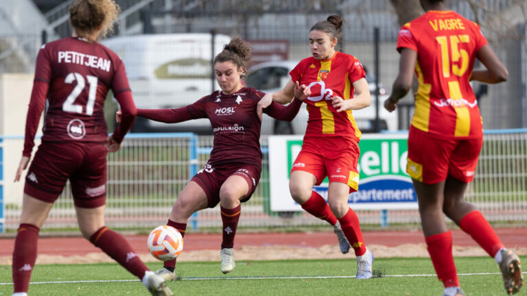 689 Les Messines n’ont pas su se défaire du piège manceau cet après-midi au stade Dezavelle. Le FC Metz concède le match nul face à une belle équipe du Mans. Le FC Metz a souffert cet après-midi face au Mans. Devant un public du stade Dezavelle fidèle (et frigorifié), les Messines ont concédé le match nul. Score final 2-2. Les joueuses de Jessica Silva laissent ainsi filer de précieux points dans la course à la montée. Bousculées par un bloc sarthois compact et solidaire, les Grenats ont eu toutes les peines du monde à développer leur jeu. Privée de Yakare Niakaté, la défense messine a concédé des buts évitables. Cueillies à froid dès l’entame de match (4′), les joueuses du club à la Croix de Lorraine n’ont clairement pas été au rendez-vous dans le premier acte. Tactiquement et physiquement, les Mancelles ont rapidement pris l’ascendant psychologique. Seule Salma Amani semblait en mesure de remettre les Grenats sur les bons rails. L’internationale marocaine égalisait à la demi-heure de jeu. Mais l’apathie défensive messine se payait cash juste avant la mi-temps (45′ + 2). En seconde période, les Messines ont accéléré et mis le pied sur le ballon. Mieux en place et plus agressives, les Grenats ont fait preuve de plus d’autorité dans les duels et de plus de créativité. Le repositionnement de Marine Morel en défense centrale n’y est sans doute pas étranger. Océane Picard trouvait enfin le chemin des filets (70′), bien lancée par Marjorie Boilesen. Mais malgré quelques beaux mouvements en fin de rencontre, le score n’allait plus évoluer. Mauvaise opération pour le FC Metz qui espérait retrouver le goût de la victoire à domicile. « Une grosse remise en question à faire… » En fin de rencontre, la coach canadienne du FC Metz ne décolérait pas. Le visage montré par ses joueuses lors du premier acte n’est pas digne des prétentions du club à la Croix de Lorraine. « Ce qui a fait la différence, c’est notre inexistence en première mi-temps. On doit montrer beaucoup plus de respect et d’honneur à notre club. On est montées d’un cran en seconde période. Mais on ne peut pas se permettre de faire des demi-matchs. Et tant qu’on ne comprendra pas ça, on ne retrouvera pas le chemin de la victoire. On prend deux buts bêtement sur deux ballons dans le dos. Il a manqué de la créativité, de l’agressivité. Il y a une grosse remise en question à faire sur notre première mi-temps, car on n’a pas le droit de jouer comme ça, avec cet état d’esprit.« Se remettre au travail rapidement… Entrée à l’heure de jeu, la milieu de terrain Lalia Storti reste positive et volontaire malgré tout. « Avec la physionomie du match, le point pris reste appréciable. On prend un but juste avant la pause, et c’est compliqué de rentrer aux vestiaires comme ça. Aujourd’hui, on sait que le travail n’a pas été suffisant. On sait aussi que ça fait trois voire quatre matchs qu’on est en dedans. Maintenant, il va falloir vraiment se mettre au travail parce que les points de perdus, on ne pourra plus les reprendre ensuite. » Se remettre au travail dès à présent pour retrouver la bonne attitude, telle est la voie. « Dorénavant, dans tous les matchs, on va faire face à des blocs bas, des équipes qui vont vouloir prendre le moindre point. Il va falloir contourner ces blocs et aujourd’hui, on n’a pas su s’adapter, jouer sur les côtés, les user. Il faut qu’on apprenne à prendre notre temps, même si on doit marquer dans le dernier quart d’heure. L’important, ça sera les trois points.« Après cette douzième journée et ce match nul concédé à domicile, le FC Metz pointe désormais à la quatrième place. Les Messines accusent maintenant six points de retard face au leader Lillois. Une victoire sur la pelouse de La Roche-sur-Yon serait la bienvenue avant la réception du LOSC dans quinze jours. La compo grenat : Emmeline Mainguy, Léonie Richard, Estelle Laurier (Lalia Storti 60′), Clara Petitjean, Célia Rigaud, Salma Amani, Marjorie Boilesen, Marine Morel, Inès Boutaleb (Lucie Calba 45′), Océane Picard, Amélie Delabre. Crédit photos : Julien Buret/LGM