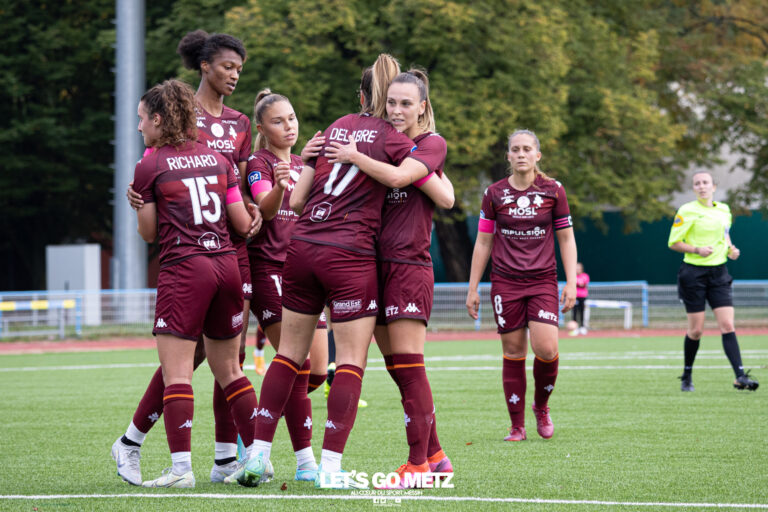 697 Dans un match ouvert et spectaculaire, les Messines ont remporté leur bras de fer. Une victoire 3-2 du FC Metz face à une valeureuse équipe du CA Paris 14 qui propulse les Grenats à la seconde place du classement, à égalité de points avec Lens. Le stade Dezavelle célébrait Octobre rose ce dimanche après-midi en marge de la cinquième journée de D2F. Et si le soleil s’est fait attendre, le spectacle des vingt-deux actrices n’a pas manqué à l’appel. Dans un match spectaculaire et agréable, le FC Metz s’est imposé 3-2 face à une belle équipe du CA Paris 14. En l’absence de plusieurs titulaires, les joueuses de Jessica Silva ont dû sortir le grand jeu pour se sortir du piège parisien. Tout n’a pas été parfait, mais l’essentiel est là. Avec cette belle victoire, les Grenats rejoignent le RC Lens en tête du groupe A. Pour pallier les absences d’Otti Grassetti, Candice Gherbi et Lucie Calba, Jessica Silva alignait un onze inédit avec notamment le replacement de Marine Morel en sentinelle devant la défense. Le onze de départ1 Emmeline Mainguy3 Estelle Laurier7 Marjorie Boilesen8 Marine Morel10 Océane Picard11 Kelly Koné15 Léonie Richard17 Amélie Delabre21 Clara Petitjean27 Yakare Niakate28 Salma Amani Un match agréable et équilibré En première période, les Messines ont largement dominé les débats. Malgré une belle opposition des Parisiennes, l’attaque grenat s’est illustrée et a multiplié les situations dangereuses, notamment par l’intermédiaire de Kelly Koné (8′, 16′, 17′). Mais Paris n’était pas venu faire de la figuration. Les visiteuses inquiétaient d’abord la défense du FC Metz à deux reprises (4′, 15′). Et contre toute attente, les Lionnes du CA obtenaient un penalty suite à un beau travail de Jade Descamps, très remuante sur son côté droit (23′). Coup de froid de courte durée sur Dezavelle puisque Emmeline Mainguy remportait son duel et détournait magnifiquement le penalty. Plus de peur que de mal pour les Grenats qui moins de dix minutes plus tard ouvraient le score par l’intermédiaire d’Amélie Delabre (32′). Un but qui allait booster les protégées de Jessica Siva. Salma Amani, autrice d’une nouvelle prestation de haut vol, doublait la mise juste avant la pause. Un scénario à suspense Au retour des vestiaires, les deux équipes allaient continuer leur bras de fer. Paris n’abdiquait pas et prenait même le jeu à son compte. Après deux tentatives avortées par la gardienne messine (55′, 57′) les joueuses de Alexandre Pereira réduisaient la marque par Sarah Galera. Un but mérité tant cette équipe du CA offrait un football généreux et spectaculaire. Mais il n’en fallait pas beaucoup plus pour redonner vie à l’attaque des Grenats. Ines Boutaleb, entrée en jeu à la place de Kelly Koné à la mi-temps, offrait aux siennes le but du 3-1 (67′). Pourtant, les Parisiennes continuaient à pousser et réduisaient à nouveau la marque par Leila Kadri (72′). De quoi faire trembler le public grenat jusqu’au coup de sifflet final. Car si Ines Boutaleb se voyait refuser le but du doublé (86′) qui aurait mis le FC Metz à l’abri, c’est bien le CA Paris 14 qui finissait la rencontre par vagues offensives. Metz a plié mais Metz a tenu bon et repart avec les trois points. Soulagement. Les réactions Jessica Silva semblait mitigée sur la prestation de ses protégées malgré la victoire : « On est content d’avoir trois points. Mais je ne suis pas très satisfaite du contenu. On va travailler la vidéo cette semaine. Les filles sont allées chercher les trois points, on en avait besoin. Le CA Paris n’a rien lâché de tout le match mais on a su garder le contrôle dans les dernières minutes. » Privée de plusieurs joueuses, la coach canadienne en a profité pour avoir une pensée envers Lucie Calba. La jeune attaquante du FC Metz joue actuellement la coupe du Monde U18 en Inde : « On suit bien sûr notre petite Lucie. Elle a marqué deux buts dans les deux premiers matchs. On est de tout cœur avec elle. » La joueuse du match s’appelle Emmeline Mainguy. La néo-Messine a sorti le grand jeu et a largement contribué à la victoire du FC Metz face au CA Paris 14. « On n’a pas fait le meilleur match de l’année. Mais quand on n’arrive pas à bien jouer, il faut savoir ne pas perdre. Et c’est ce qu’on a fait aujourd’hui en conservant les trois points. » Le tournant du match fût bien entendu le penalty repoussé par la gardienne grenat en première mi-temps : « Je sais que mon poste va être important cette année. Il y a des matchs où on va être un peu plus en difficulté et il faudra faire les arrêts qu’il faut. C’est ce qui s’est passé aujourd’hui. » Une prestation XXL sous les yeux attendris de sa mère qui avait fait un long déplacement pour voir Emmeline : « C’est ma première supportrice, je lui dédicace cet arrêt et les trois points. » Crédit photos : Julien Buret – Propos recueillis par Gérald Russello