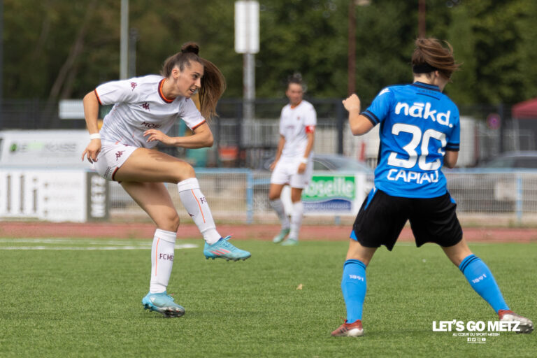 572 Les Messines lançaient hier leur campagne de préparation et retrouvaient le stade Dezavelle. Un première prestation sérieuse face aux Belges de Club Brugge. Score final 0-0 mais déjà des enseignements à tirer. Les Messines ont entamé leur préparation ! A peine deux semaines après la reprise des entraînements, les joueuses du FC Metz retrouvaient le Stade Dezavelle pour un premier match amical. Une rencontre à huis-clos face à la prestigieuse équipe belge de Club Brugge qui s’est soldée par un score vierge 0-0. Sous une chaleur étouffante, les protégées de Jessica Silva ont fait mieux que tenir face à une référence du foot féminin européen. L’occasion de faire un premier état des lieux de l’effectif. Et en particulier faire connaissance avec quelques recrues déjà retenues dans le groupe. Déjà de belles promesses Si elles ont parfois pêché dans la finition, les joueuses du FC Metz ont malmené les Belges de Club Brugge. Bien en place et physiquement solides, les Messines ont d’entrée imposé un pressing haut. Sans succès. Un manque compréhensible d’automatismes et de liant au milieu de terrain qui a obligé les grenats à abuser de longs ballons. Mais la tactique aurait pu fonctionner si Océane Picard avait transformé le penalty sifflé après une faute sur Marjorie Boilesen. L’attaquante brésilienne avait pris le meilleur sur la gardienne belge avant d’être fauchée par cette dernière (35’). Quelques minutes plus tard, Amélie Delabre loupait l’immanquable après avoir hérité d’un ballon renvoyé par la portière de Brugge sur une frappe à bout portant de Lucie Calba. En seconde période, les Messines ont multiplié les assauts, sans succès. Mais en face, les visiteuses n’ont guère été dangereuses. Les deux équipes se séparaient sur un score vierge après un match agréable et rythmé. « La finition fera partie des priorités cette année » Jessica Silva semblait plutôt satisfaite de ses protégées à l’issue de la rencontre. « On a fait une bonne entame de match. Athlétiquement c’était pas mal. On a tenu 90mn face à un bon adversaire. Il reste des choses à travailler mais c’est plutôt positif. On a eu quatre actions franches qui auraient mérité d’aller au bout. La finition fera partie des axes de priorité cette année. » Le retour de blessure imminent de Kelly Koné devrait aider. Parmi les satisfactions, la jeune Lucie Calba a livré une nouvelle prestation pleine sur son côté droit. « On est très contentes de retrouver le terrain, de rejouer ensemble pour cette nouvelle saison. C’était un match où on savait qu’on allait être sollicitées physiquement. Cela s’est plutôt bien passé. La préparation se déroule bien, de jour en jour on apprend de nouvelles choses et on travaille sur de nouveaux thèmes. » Par exemple, une journée au 3ème régiment de Hussard pour un entraînement commando très physique. Les grenats ont en effet gouté cette semaine à la rigueur militaire. « Physiquement c’était dur. On a vu ce que vivent certains militaires au quotidien. C’est un métier très difficile. Et ça nous a ouvert les yeux sur certaines choses de la vie ! » Les Messines entament bien leur préparation. Elles disputeront leur prochain match face au Racing Luxembourg le 04 août prochain à 19h30 au stade Dezavelle. Crédit photos : Julien Buret/LGM