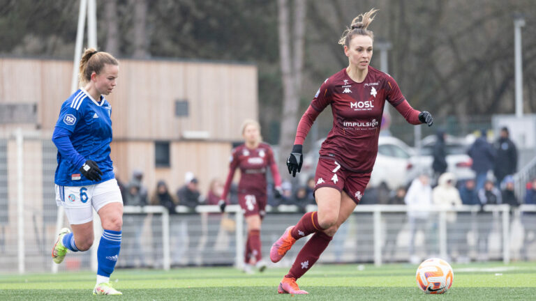 583 Pour son dernier match à domicile de la saison en D2F, le FC Metz accueillera dimanche le RC Strasbourg pour un derby très attendu du côté de Dezavelle. Si l’enjeu n’est désormais plus la montée, ce match n’aura rien d’amical pour les deux équipes. La saison de D2 Féminine touche à sa fin et les Grenats n’ont plus d’autre défi que de subtiliser la place de dauphin de Lille au rival alsacien. Actuellement troisième (36 pts), le FC Metz reçoit le RC Strasbourg (37 pts), dimanche, pour le derby du Grand Est. Un rendez-vous très attendu par les deux formations qui ne se font en général aucun cadeau lors de leurs confrontations. À l’aller, les Messines s’étaient inclinées en Alsace sur le score de 3-2. L’ex-attaquante grenat, Latifah Abdu, s’était particulièrement illustrée lors de la rencontre. Nul doute qu’un sentiment de revanche animera les protégées de Jessica Silva. La coach canadienne qui devra composer sans Lucie Calba et Emma Francart, retenues en sélection. Bien finir et offrir une victoire au public grenat Si la montée n’est plus qu’un rêve lointain, le FC Metz se doit d’offrir à son public une victoire dans le derby face à Strasbourg. Terminer en beauté et avec les honneurs, telle est désormais la voie pour Marine Morel et ses coéquipières. Un dernier match à domicile avant un ultime déplacement à Saint-Malo la semaine suivante. Et l’occasion de réaffirmer la suprématie messine dans le Grand Est, face au rival Strasbourgeois. Car si le maintien dans cette nouvelle version de la D2F est assuré, l’avenir se construit dès maintenant. La popularité de la section féminine auprès des spectateurs se joue sur ce genre de rencontres. Il faudra mouiller le maillot jusqu’au bout et battre Strasbourg. Les Messines pourraient ainsi reprendre la seconde place avant la dernière journée et finir leur saison en beauté. Crédit photo : Julien Buret – Let’s Go Metz FC Metz – Racing Club de Strasbourg Alsace, coup d’envoi à 15h00 au stade Dezavelle, dimanche 21 mai 2023. L’entrée sera libre et le public pourra profiter de nombreuses animations.