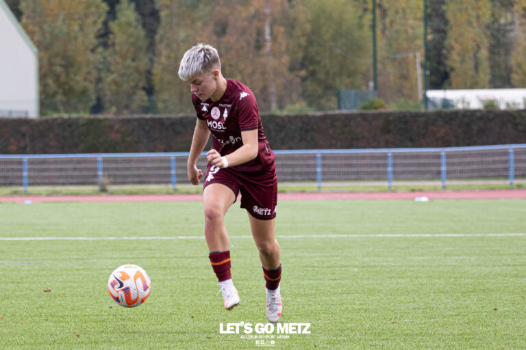 576 Dans un match spectaculaire et disputé, le FC Metz et le Stade Brestois 29 ont fait match nul 1-1. Toujours invaincues en D2F, les Messines ramènent un bon point de Bretagne. Il pleuvait fort sur le stade De Pen Helen 2 ce samedi à Brest. Mais le spectacle fût malgré tout de haute qualité entre deux formations qui aiment jouer au ballon. Dans des conditions certes difficiles, le FC Metz et le Stade Brestois se sont livrés bataille jusqu’au bout du suspense. Bien décidées à confirmer leur victoire une semaine plus tôt, les Bretonnes ont donné du fil à retordre aux Grenats. Toujours invaincues, les protégées de Jessica Silva enchaînent donc un deuxième résultat nul d’affilée. Un bon point de pris face à une équipe de Brest qui tente tout pour recoller aux six premières places du classement. Deux équipes qui aiment jouer au football En première mi-temps les deux équipes proposaient un football spectaculaire et engagé. Se rendant coup pour coup, Brestoises et Messines se procuraient de nombreuses occasions. Les Grenats multipliaient les assauts sur le but de Solène Froger. Mais la gardienne du Stade Brestois 29 ne craquait pas. Les joueuses de Samuel Riscagli répondaient même en inscrivant un but, refusé pour hors-jeu. Un avertissement sans frais pour les joueuses du Club à la Croix de Lorraine, et une première mi-temps agréable pour le public brestois. Malgré des conditions difficiles, le football était bien au rendez-vous au stade De Pen Helen 2. L’art de réagir En seconde période, les Bretonnes ne relâchaient pas la pression. Les Finistériennes se montraient très vite dangereuses par l’intermédiaire d’Alexandra Atamaniuk, l’expérimentée milieu de terrain qui aurait dû signer à Metz à l’intersaison. Quelques minutes plus tard, l’internationale algérienne Nihed Naïli ouvrait finalement le score pour Brest (54′). Mais piquées dans leur orgueil, les joueuses du Jessica Silva réagissaient rapidement. Lucie Calba, fraîchement revenue de sa coupe du monde en Inde, remettait les deux équipes à égalité (62′). La jeune internationale des bleuettes, titularisée pour l’occasion à la place d’Océane Picard, rabattait les cartes sous une pluie battante. Les débats s’animaient alors et les deux formations se rendaient coup pour coup jusqu’à la fin du match. Les Messines étaient bien décidées à revenir victorieuses de Bretagne. Mais malgré un dernier festival de Salma Amani dans les arrêt de jeu, les deux équipes se séparaient sur une égalité parfaite. Le verre à moitié vide Au micro de Let’s Go Metz, Jessica Silva ne cachait pas sa déception à la fin de la rencontre : « Cela reste un bon point de pris face à une équipe de Brest qui était très bien préparée. Très agressive au milieu de terrain. Il y a eu des occasions des deux côtés. Mais on n’a pas été assez bonnes en première mi-temps. » Mécontente de la prestation globale de ses protégées sur les deux dernières rencontres, la coach canadienne attend clairement plus lors des prochaines échéances : « Il faut qu’on arrête d’attendre que l’adversaire marque pour se réveiller. Sur ces deux derniers matchs, on est plus dans la réaction que dans l’action et c’est dommage. On doit être plus dominantes dans le jeu. On a les capacités pour et on ne le fait pas. » Après ce périple en Bretagne, le staff et les joueuses non sélectionnées en équipes nationales vont pouvoir souffler pendant quinze jours : « La trêve internationale va faire du bien, surtout après un grand déplacement. Un peu de repos va faire du bien à tout le monde. » Toujours invaincues, les filles du FC Metz n’avancent plus depuis maintenant deux matchs. La trêve internationale va permettre aux Messines de souffler un peu avant la réception du CA Paris dans quinze jours en coupe de France et celle d’Orléans à la fin du mois. La victoire sera impérative pour rester aux avant-postes du groupe A de D2F. Le onze grenat : Emmeline Mainguy, Estelle Laurier, Célia Rigaud, Yakaré Niakaté, Léonie Richard (Inès Boutaleb 78′), Marine Morel, Salma Amani, Marjorie Boilesen, Amélie Delabre, Lucie Calba, et Otti Grassetti (Océane Picard 54′). Propos recueillis par Gérald RusselloCrédit photo : Julien Buret/LGM