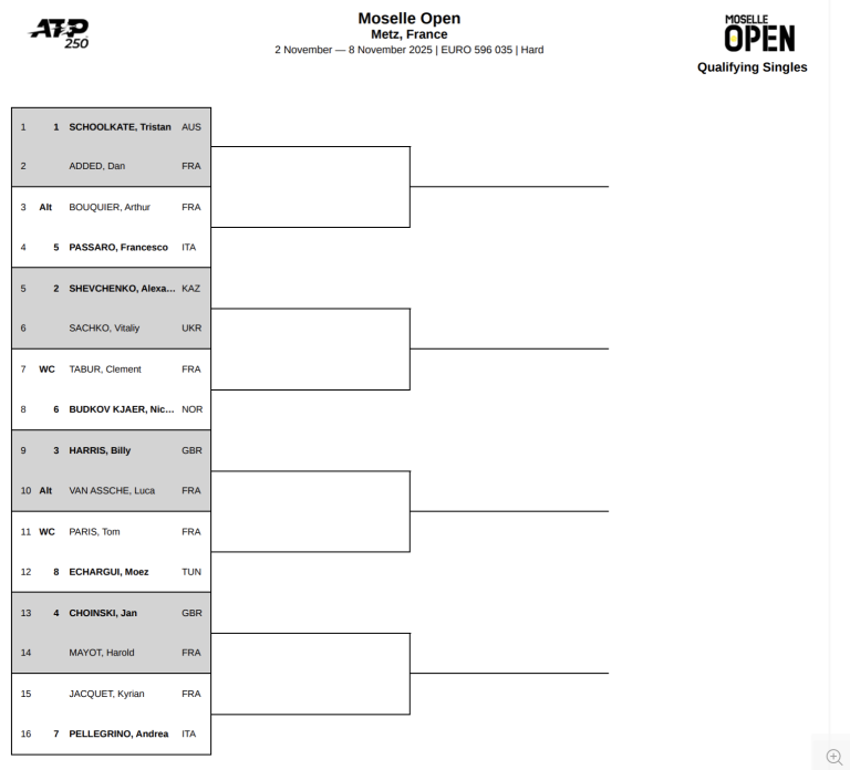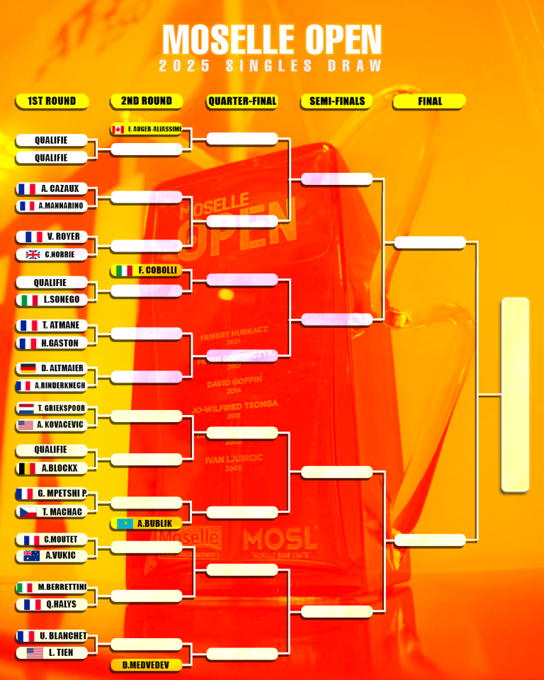 266 Ce vendredi, les Arènes de Metz accueillaient le tirage au sort de la 22ème édition du Moselle Open. Avec quelques absences remarquées, le tournoi est donc plus ouvert que jamais. C’était le grand soir à Metz : le tirage au sort du Moselle Open 2025 a été réalisé. Les organisateurs ont ainsi vu les choses en grand avec, en clôture de la soirée, le Ballet Corpus de l’Opéra-Théâtre de l’Eurométropole de Metz. Après le tirage au sort, avait lieu le Ballet Corpus de l’Opéra-Théâtre. Crédit Photo : Paola Riggi/Let’s Go Metz Un tableau de haut niveau pour la course au titre Pour sa dernière édition, le Moselle Open a surpris tout le monde avec l’invitation de Daniil Medvedev. C’est sa deuxième participation après 2022, année où il a été éliminé d’entrée par le Suisse Stanislas Wawrinka. L’entry list était très alléchante mais a malheureusement été amputée des absences d’Ugo Humbert et de Benjamin Bonzi. Le public mosellan va retrouver le vainqueur 2022 Lorenzo Sonego et son finaliste Alexander Bublik ou encore le finaliste 2024 Cameron Norrie. Tableau principal 1er tourQualifié – QualifiéArthur Cazaux (France) – Adrien Mannarino (France)Valentin Royer (France) – Cameron Norrie (France)Qualifié – Lorenzo Sonego (Italie)Térence Atmane (France) – Hugo Gaston (France)Daniel Altamaier (Allemagne) – Arthur Rinderknech (France)Tallon Griekspoor (Pays-Bas) – Aleksandar Kovacevic (Etats-Unis)Qualifié – Alexander Blockx (Belgique)Giovanni Mpetshi Perricard (France) – Tomáš Macháč (République Tchèque)Corentin Moutet (France) – Aleksandar Vukic (Australie)Matteo Berrettini (Italie) – Quentin Halys (France)Ugo Blanchet (France) – Learner Tien (Etats-Unis) 2ème tourVainqueur du match Qualifié – Qualifié – Félix Auger-Aliassime (Canada)Flavio Cobolli (Italie) – Vainqueur du match Qualifié – Lorenzo SonegoVainqueur du match Mpetshi Perricard – Macháč – Alexander Bublik (Kazakhstan)Vainqueur du match Blanchet – Tien – Daniil Medvedev (Russie) Julien Boutter « Il y a une fin de saison intéressante » Crédit Photo : Paola Riggi/Let’s Go Metz Le directeur du Moselle Open Julien Boutter a également rappelé l’importance du tournoi pour cette fin de saison. « Il y a encore quatre joueurs qui sont en lice pour le Masters de fin de saison pour une seule place. Les résultats du Rolex Paris Masters auront très peu de conséquences. Musetti et Auger-Aliassime vont, au pire, se battre pour la dernière place. Il y aura maximum 100 points d’écart entre les deux. Il y a 250 points en jeu et Musetti joue à Athènes. De fait, cela va rendre la course intéressante jusqu’à la fin de la semaine. Bublik et Medvedev ont encore la possibilité d’aller au Masters à Turin s’ils arrivent à aller en finale ou à gagner le Rolex Paris Masters. Il y a une fin de saison intéressante avec beaucoup d’enjeux pour ces 4 joueurs là. » Photo à la une : Julien Buret / Let’s Go Metz