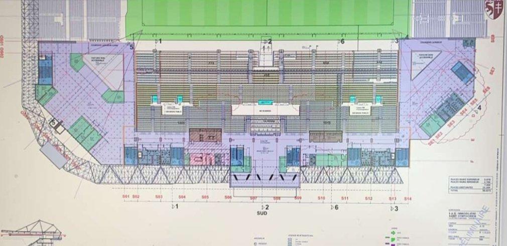474 A un mois du début de la démolition de notre chère tribune Sud, le futur visage de Saint Symphorien tarde à se faire « officiellement » connaître… Bien sûr des images 3D ont déjà été diffusées par certaines sources bien informées, tout le monde les connaît: On sait également que la capacité du stade atteindra 30 000 places assises et que la nouvelle tribune, dixit le Républicain Lorrain, devrait abriter VIP, vestiaires et accueil aux personnes à mobilité réduite ainsi que les familles. La vraie bonne nouvelle, celle que tous les supporters attendaient, c’est que cette tribune devrait fermer entièrement le côté Sud du stade avec deux angles, Sud Est et Sud Ouest. Deux angles, c’est une résonance accrue pour les virages ultras, c’est également le passage du stade Saint Symphorien dans la cours des grands. Aujourd’hui sur Twitter, des images des plans ont fuité et nous ont été transmises par le compte LORRAINE DATA F.C METZ. Sont-elles authentiques? Il semblerait que oui… On peut y voir clairement les deux angles qui, à priori, ne devraient pas comporter de places assises mais seraient utilisés pour la diffusion publicitaire et l’exposition des partenaires du club. Dans tous les cas, le FC Metz devrait très bientôt communiquer officiellement sur le sujet et nous présenter cette nouvelle tribune tant attendue. Alors encore un peu de patience…