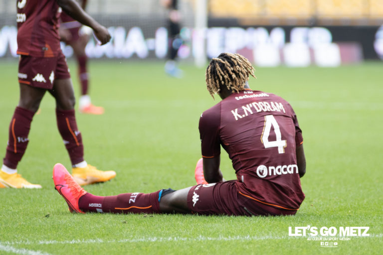 501 Sorti sur blessure lors du match contre Nantes, le milieu de terrain sera opéré dès lundi d’une fracture de la clavicule droite. Et c’est reparti pour deux mois d’absence pour Kevin N’Doram. Il était l’un des rares grenats au niveau sur le terrain dimanche, Kévin N’Doram est reparti pour de longues semaines en infirmerie. Sorti à la demi-heure de jeu, le milieu de terrain souffre d’une fracture de la clavicule droite. Il devrait être absent pendant au moins deux mois des terrains. Deux mois d’absence pour Kevin N’Doram Quand ça veut pas, ça veut pas… Tout à la joie de retrouver la compétition après une vraie préparation, Kévin N’Doram est de nouveau out. Depuis son arrivée le jeune milieu de terrain enchaîne les tuiles. Après le tendon d’Achille, le cinquième métatarse, c’est désormais la clavicule. On passera sur le drame de l’accident de voiture. Celui qui devait être l’une des meilleures recrues pour ce nouvel exercice, va donc louper le début de saison. Coup dur pour les messins qui démarrent plutôt mal, avec un point sur six, un suspendu dès le premier match (Kiki Kouyaté) et un blessé sérieux lors du second. Espérons que les malheurs de Frédéric Antonetti, furieux après la défaite des messins à La Beaujoire, prennent fin très rapidement. Il n’y a pas encore le feu mais les indicateurs sont déjà oranges. Crédit photos : Julien Buret