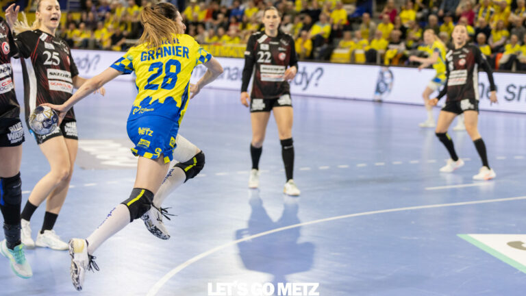 653 On note plusieurs absentes sur la feuille de match entre Metz Handball et le Havre. Volonté de faire tourner ou vague d’indisponibilités ? Ce mercredi soir, Metz Handball se déplace au Havre pour disputer une nouvelle journée de Ligue Butagaz Energie. Un match contre un prétendant au maintien coincé entre une rencontre relevée de Champions League face à Esbjerg et un choc face à Brest en Coupe de France. Est-ce une soudaine épidémie, une vague de blessures ou la qualité de l’opposition du jour qui ont poussé Emmanuel Mayonnade et son staff à laisser une partie de l’effectif en Moselle ? Cela a quoi qu’il en soit pour effet la promotion temporaire de plusieurs joueuses du centre de formation. En effet, sur la composition d’équipe dévoilée sur les réseaux sociaux du club à la mirabelle, on compte l’absence de Sarah Bouktit, Anna Albek et Lucie Granier. Trois joueuses importantes puisque la première est pivot titulaire et vice capitaine, la deuxième la seule arrière droite de métier de l’effectif et la troisième est l’indéboulonnable ailière droite de l’équipe première. Pour compenser cela, plusieurs jeunes visages font leur apparition dans le groupe. Blandine Gros, déjà aperçue en début de saison fait son retour avec l’équipe aux côtés de celle qu’elle remplaçait alors : Manon Errard. Le choix aurait pu se porter sur Clémence Castets qui avait elle aussi joué le jeu de l’interim mais cette dernière est actuellement blessée.Yvana Atangana, capitaine de l’équipe du centre de formation fait elle aussi son retour avec le groupe après quelques apparitions la saison passée en compétition officielle. L’arrière pourra peut être bénéficier de temps de jeu après avoir passé beaucoup de temps avec les Dragonnes ces dernières semaines.Elea Ferdilus était apparue dans le groupe professionnel il y a quelques semaines, elle tentera d’apporter un complément au travail effectué par Anne-Emmanuelle Augustine au poste de pivot.Enfin on retrouve également Nelya Goval, promue depuis déjà plusieurs matchs pour compenser l’absence de Suzanne Wajoka, blessée au genou. Dans ces conditions, plusieurs joueuses vont pouvoir bénéficier d’un temps de jeu renforcé et pourront tenter de marquer des points dans la hiérarchie tout en consolidant des automatismes collectifs en vue des prochaines échéances. Crédit photo : Matthieu Henkinet / Let’s Go Metz