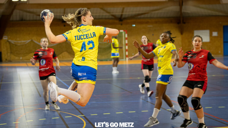 1,K Emma Tuccella, l’ailière de l’équipe N1F de Metz Handball a été promue cette saison au poste de capitaine, après la réception de Chevigny-saint-Sauveur, elle a livré ses impressions. Quelles sont les impressions après cette large victoire face à Chevigny ?C’était un très bon match. Nina (Kanto, ndlr) nous avait donné des consignes claires : bien courir, bien défendre, bien attaquer. On a pu passer nos petits spéciaux et ça nous a fait plaisir. Avant le match on avait un peu d’appréhension parce qu’il y avait eu 10 jours sans se voir en raison des sélections internationales et qu’il n’y avait qu’un groupe de trois à l’entraînement : Claire Koestner, Lily Balassi et Nelya Goval, ce qui a compliqué le travail mais elles ont su bosser et ça s’est vu aujourd’hui. On a l’impression que le match aurait pu être tué en première période, mais Chevigny a eu un sursaut qui vous a perturbé. Finalement en deuxième mi-temps, les choses ont été plus claires.On les a fait souffrir sur grand espace. Même en première mi-temps d’ailleurs avec beaucoup de montées de balles dès le début de match mais on a eu un petit moment de faiblesse, c’est vrai. On savait très bien qu’en deuxième mi-temps il n’y aurait plus de place pour ça. Globalement le début de saison vous réussit, hormis une défaite qui aura peut être été, avec le recul, plus bénéfique qu’autre chose pour le groupe.Le match contre Villemomble était une erreur, collectivement nous n’avons pas été à la hauteur. On aura pas le droit à d’autres erreurs dans la saison quoi qu’il en soit. On sera très attentives pour la revanche à l’extérieur. Comment fonctionne cette doublette entre aile et arrière que vous formez avec Manon Errard. Vous êtes toutes les deux ailières… et pourtant !Parfois avec Manon on se pose des questions sur notre rôle en tant qu’arrières, sur le papier on a pas le profil pour mais on voit qu’on fait du bon travail avec beaucoup de buts entre elle et moi. On sait aussi très bien que les demandes de Nina sont réalistes quand l’une de nous doit jouer à l’arrière droit et on est heureuses de pouvoir bénéficier du temps de jeu. Cette saison, il y a également un rôle supplémentaire : celui de capitaine de l’équipe.J’en suis très contente. Ca se voit aussi sur le terrain je pense. Quand je suis arrivée à Metz j’étais la plus petite, j’ai évolué avec Audrey et Laureen Dembele, Léa Ballureau, Meissa Maurice… Aujourd’hui, je ne suis toujours pas la plus grande mais pour ce qui est de l’âge je suis devenue la plus vieille et Nina a choisi de me donner ce rôle et j’essaie de faire mon maximum. Je ne suis pas quelqu’un qui aime prendre la parole en public mais ça me tient à cœur, c’est important donc je le fais pour l’équipe. Revenons sur le stage avec l’équipe de France U20 qui vient de se dérouler, comment ça s’est passé avec tes trois coéquipières messines ?Je suis partie avec Délia Golvet, Fatima Camara et Manon Errard. Délia n’a malheureusement pas été prise pour les déplacements à Bilbao, Bera Bera et Villava. On a joué trois matchs et on a remporté trois victoires, on s’est éclatées et c’est vraiment un bilan positif. Crédit photo : Julien Buret