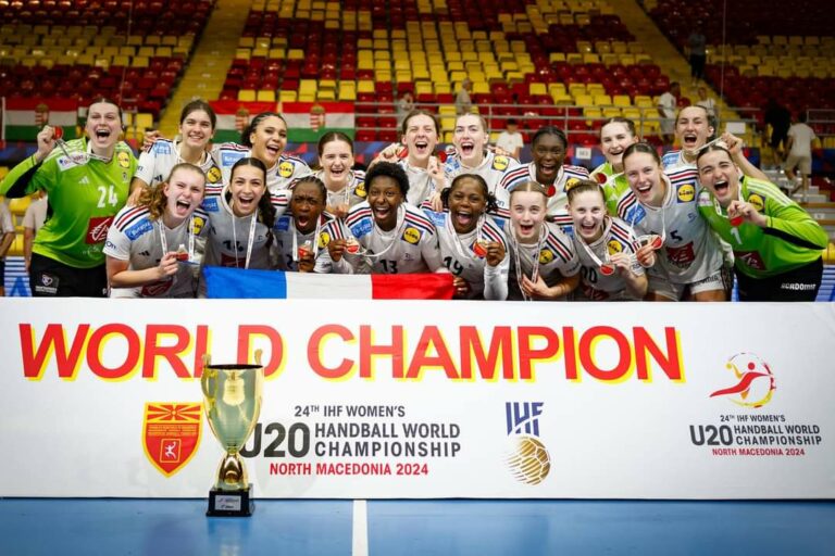 2,7K Avec un parcours sans faute, l’équipe de France de Handball u20 termine ce championnat du monde de la plus belle des manières face à la Hongrie. Six mois après l’Équipe de France A, Metz Handball peut célébrer deux nouvelles championnes du Monde avec Manon Errard et Emma Tuccela (26-29). La génération u20 2004-2005 a marqué l’Histoire du Handball français. Jamais une équipe junior n’avait été championne du monde jusqu’à présent. On avait pu croire en la précédente avec Sarah Bouktit et Léna Grandveau mais elle n’avait pu disputer que la 13e place en 2022. Aussi, en 2012, les jeunes Grâce Zaadi et Laura Glauser n’étaient pas parvenues à surpasser les Suédoises, collectif fort de l’époque. Cette fois-ci, l’équipe d’Eric Baradat ramène le titre, 12 ans après la dernière médaille dans cette même catégorie d’âge contre de favorites hongroises, championnes d’Europe u17, troisièmes du championnat du Monde u18 et championnes d’Europe u19. Une bonne gestion du money-time Mais dans ce championnat du Monde de Handball, rien ne semblait effrayer cette équipe de France u20, pas même les Danoises qui restaient également sur trois médailles. Mais cette finale n’a pas été une mince affaire pour Manon Errard (8/11 dans cette finale) et ses coéquipières. En effet, les deux collectifs se sont rendus coup sur coup durant les soixante minutes de la partie. Pourtant, la Hongrie était partie sur les chapeaux de roue empêchant la France d’inscrire un but avant qu’Enola Borg n’ouvre la marque pour son camps au bout de la huitième minute. Dès lors les Bleues parvenaient à monter en puissance pour mener pendant la majeure partie du match malgré une moyenne efficacité offensive causée par une redoutable Klára Zaj (20 parades et 43% d’efficacité). À la pause, les jeunes françaises menaient d’une courte tête (13-14). À la reprise, les Tricolores poursuivaient leur dynamique pour mener jusqu’à quatre unités. Mais la Hongrie avait déjà géré la pression d’une rencontre mal embarquée. Portées par Lea Faragó en attaque, les championnes d’Europe en titre grignotaient petit à petit leur retard pour recoller au score et repasser devant. Mais la France ne s’avouait pas vaincue avec une défense qui leur permettait de créer des situations faciles sur contre-attaque. Voyant ceci, le sélectionneur hongrois était même contraint d’user d’une attaque à sept contre six. Du côté des Bleuettes, pour résister aux Hongroises, Éric Baradat n’hésitait pas à faire rentrer la gardienne brestoise Romane Lehuault-Parc en lieu et place d’Alix Tignon. Pari réussi tant la portière de 19 ans a su se montrer très efficace dans un money-time haletant entre les deux formations. À deux minutes de la fin, elle laissait de nouveau la place à sa coéquipière qui arrêtait un jet de sept mètre important. Ce qui permettait à son équipe d’avoir une avance de trois buts grâce à Lylou Borg. Emília Varga réduisait la marque pour la Hongrie mais l’équipe de France pouvait déjà célébrer ce titre historique de championne du monde de Handball u20 avec une dernière réalisation de Manon Errard. Trois Françaises dans l’équipe-type Même si ce titre est le résultat d’un travail collectif, certaines françaises ont su se démarquer tout le long de la compétition. Nina Kanto et Metz Handball pourront d’ailleurs être fiers puisque Manon Errard repart avec un titre de meilleure ailière droit et 21 buts inscrits en 25 tentatives soit une efficacité de 84%. Elle accompagne Lilou Pintat (Pivot) et Lylou Borg (Meilleure joueuse).C’est la première fois qu’une Française remporte cette distinction. Crédit photo : IHF