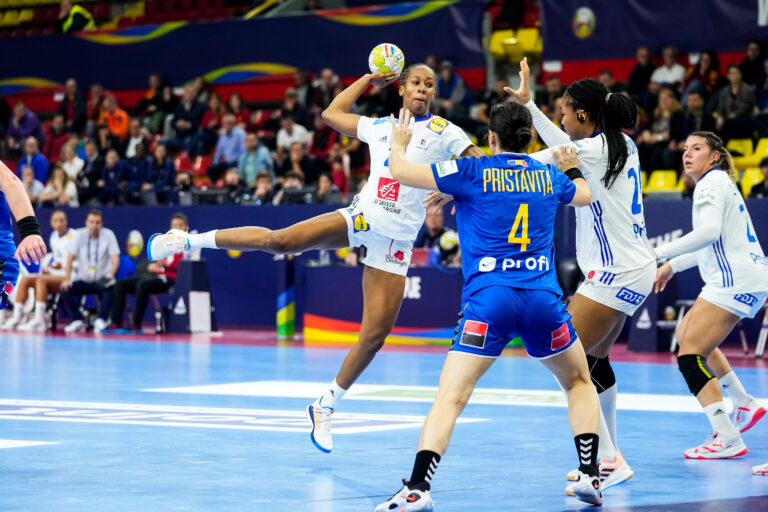 340 Après une entrée en lice étriquée face à la Macédoine, l’équipe de France poursuit son aventure à Skojpe en disposant largement de la Roumanie, dans ce deuxième match de l’Euro 2022 (35-21). Les Françaises se qualifient pour le Tour Principal. Il y a deux jours, les Bleues d’Olivier Krumbholz entamaient leur compétition par une victoire face à la Macédoine de Ritovska. Ce lundi, une Roumanie coriace se dressait sur le chemin de la France pour la suite de l’Euro 2022. Cette équipe roumaine se présentait avec Cristina Neagu et Crina Pintea qu’on ne présente plus et quelques autres profils dangereux tels que Sorina Grozav, Eliza Buceschi et ses trois gardiennes, souvent performantes entre leur deux poteaux. Sans vraiment convaincre en attaque, les Françaises n’étaient pas tombées dans le piège du pays hôte, qualifié pour la première fois depuis 2012. Cependant, pour ce deuxième match, il était important de hausser le ton afin d’impulser une nouvelle dynamique en affrontant un tel adversaire. Ainsi, le sélectionneur tricolore réintégrait Orlane Kanor dans le but de densifier les armes offensives de son groupe. Une entame poussive L’entame de la France repartait sur les mêmes bases que la précédente confrontation. En place, défensivement, l’équipe de France restait hésitante et rendait très souvent les ballons à la Roumanie. Cette dernière en profitait d’ailleurs pour se montrer très dangereuse depuis la ligne des 9m et trouver des failles pour punir les Bleues avec l’obtention de jets de 7m. Dans la foulée, l’équipe d’Olivier Krumbholz avait plusieurs fois l’occasion de faire le break mais pêchait par précipitation. Les adversaires en profitaient pour rester au contact des tricolores. Les deux équipes se livraient un veritable mano à mano (7-7, 15′25). Le sélectionneur français décidaient alors de faire des ajustements tactiques. C’est ainsi que les Bleues commençaient à concrétiser leurs occasions, aidées par la nouvelle performance solide de Cléopâtre Darleux et une défense agressive. En attaque, l’entrée d’Orlane Kanor apportait un vent de fraicheur et le jeu devenait de plus en plus fluide. Si la France semblait prendre du plaisir dans ses intentions, la Roumanie, elle, s’enfonçait en devenant trop lisible devant les actions défensives des Championnes Olympiques. Les pertes de balles régalaient les coéquipières de Grâce Zaadi qui creusèrent l’écart avant de rejoindre le vestiaire (11-17, 30′). Un véritable rouleau compresseur Au retour de la pause, Olivier Krumbholz opérait un changement au niveau des gardiennes. Comme pour la Macédoine, il décidait de faire confiance à Floriane André, au relai de Cléopâtre Darleux. De leur côté, les joueuses de champs préservaient la dynamique de la première période. La France ne laissait aucun espoir à la Roumanie. Pourtant, Florentin Pera tentait de réagir en proposant un jeu sans gardienne (Sept joueuses de champs sur le terrain) pour apporter de la variété dans la circulation de balle des siennes. Mais le technicien français contrecarrait les plans avec une défense avancée. Plusieurs ballons interceptés et les Bleues prenaient le large, laissant, derrière elles, des Roumaines bien désarmées (16-26, 45′). Très impliquées dans tous les secteurs de jeu, les Françaises ne baissaient jamais en intensité, même si Olivier Krumbholz se permettait de faire tourner son effectif. Devant son filet, Floriane André poursuivait le travail de son ainé en aidant son équipe à maintenir une avance assez importante. Appliquée, la France soignait son goal-average avant d’affronter les Pays-Bas, en étouffant complètement son adversaire du soir. Au coup de sifflet final, l’équipe de France pouvait être satisfaite de cette performance collective face à la Roumanie qui avait accroché les Bataves, en débutant l’Euro 2022. Une confrontation qui s’annonce déjà comme fondatrice pour la suite de la compétition (21-35, 60′). Statistiques de la rencontre Roumanie : Ciuca (4 arrêts/14 tirs) – Dumanska (5/22) – Hosu (0/6). Pristavita (0 but/1 tir) – Buceschi (1/3) – Neagu (5/6 dont 0/1 pén) – Tanasie (0/2) – Bazaliu (1/8) – Dindiligan – Badea (1/3) – Tirle – Ostase – Lixandroiu (4/7 dont 2/2 pén) – Seraficeanu (1/2) – Pintea (3/3 dont 1/1 pén), Grozav (5/11 dont 2/2 pén). France : André (8 arrêts / 18 tirs dont 0/2 pén) – Darleux (6 arrêts / 17 tirs dont 1/4 pén). Toublanc (1/2) – Coatanea (4/5) – Valentini (1/2) – C. Lassource (2/3) – Zaadi (3/5) – Darleux (0/1) – Dembélé – Sercien Ugolin (0/1) – Flippes (4/4) – Kanor (4/6) – Horacek (0/1) – D. Lassource (1/1) – Edwige (4/4) – Foppa (5/8) – Nze Minko (6/6) Crédit photo : Hugo Pfeiffer/Icon Sport