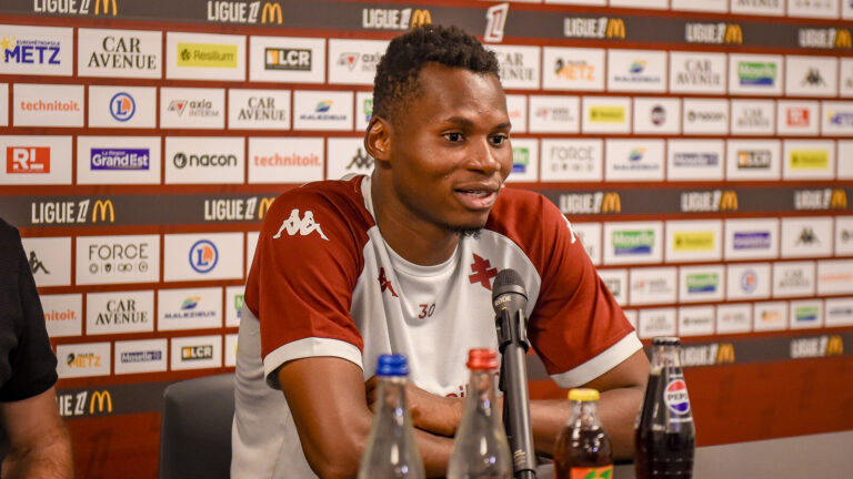 2,6K L’avant-centre sénégalais du FC Metz, Habib Diallo, était présenté ce mardi à la presse pour la première fois depuis son retour en Lorraine. Madeleine de Proust des supporters du FC Metz, Habib Diallo a fait son grand retour en Lorraine pour aider son club formateur à se maintenir en Ligue 1. L’attaquant sénégalais qui a récemment fêté ses 30 ans, prenait la parole pour la première fois devant la presse locale depuis sa signature le 31 août dernier : « Cela fait plaisir de revenir là où j’ai débuté ma carrière. J’ai ma fille et toute ma famille ici. J’ai eu d’autres propositions mais j’ai préféré revenir à Metz ». Un plaisir que Frédéric Arpinon, le directeur sportif du club à la Croix de Lorraine, ne boude pas : « Avoir Habib c’est une aubaine pour le FC Metz. La saison passée, il était souvent là. Mais jamais je n’aurais pensé qu’il puisse nous rejoindre. Si on m’avait dit y a quelques semaines qu’Habib reviendrait, je ne l’aurais pas cru. Je serais même allé le chercher moi-même sur mon dos pour qu’il vienne nous aider ». Frédéric Arpinon : « C’est Habib qui a fait le premier pas » Le directeur sportif du FC Metz a salué le retour de l’ancien chouchou de Saint Symphorien et a rappelé que la décision émanait avant tout d’Habib Diallo : « C’était sa volonté de revenir à Metz. C’est important pour moi de voir des joueurs comme Habib, Boubacar Traoré, Gauthier Hein, vouloir revenir jouer à Metz, ça prouve que le club, son histoire, les gens qui y travaillent, les supporters ne laissent pas indifférent. C’est Habib qui a fait le premier pas et quand on a vu que c’était possible, on s’est engouffré dans la brèche et on a tout fait pour le faire venir ». L’attaquant sénégalais va pouvoir apporter son expérience au groupe et entourer notamment ses jeunes coéquipiers de l’attaque. Lorsqu’il a quitté Metz en 2020, Habib Diallo portait le brassard de capitaine. Depuis, le rôle est tenu par un autre ancien de la maison, Gauthier Hein. « Être un leader ne dépend pas seulement du brassard. Tu n’as pas besoin d’être capitaine pour être un leader dans une équipe. Les anciens, par exemple Gauthier, Benjamin et moi, sommes là pour guider les jeunes » Habib Diallo : « Je ne vais pas maintenir le club tout seul » Après trois défaites en trois matchs, le FC Metz est déjà bon dernier du championnat. Mais pour autant, pas question de céder à la panique. Pour Habib Diallo, le challenge commence maintenant : « Il n’y a eu que trois matchs, c’est difficile de juger cette équipe. On va tout faire pour gagner des points maintenant, surtout ce weekend face à Angers. Je suis impatient de retrouver le public de Saint Symphorien. Je ne me suis pas fixé d’objectif de nombre de buts, dans ma tête je me dis que je veux marquer tout le temps » Conscient de l’attente qu’il suscite, l’avant-centre grenat a tenu, malgré tout, à rappeler qu’il n’arrive pas comme le seul sauveur de l’équipe. Son apport ne peut être qu’un complément à une dynamique de groupe des hommes de Stéphane Le Mignan : « Je suis là pour que le club reste en Ligue 1. Mais une personne ne peut rien faire seule. On est onze sur le terrain, et on doit compter sur tout le monde. Je ne vais pas maintenir le club tout seul, si Metz se maintient, ce sera grâce à tout le monde, même les remplaçants ». Crédit photos et propos recueillis par Mikael Frank – Let’s Go Metz