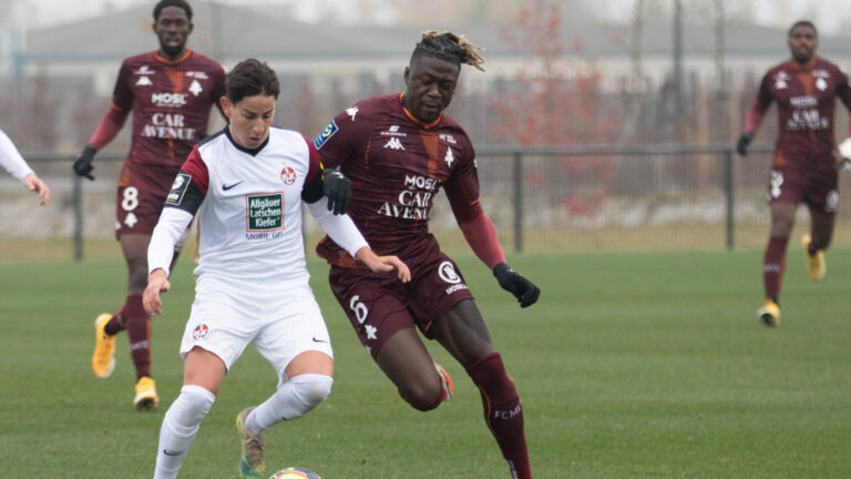 548 En l’absence de ses internationaux africains et en procédant à une large revue d’effectif, le FC Metz a remporté 2-1 son match amical contre Kaiserslautern. Des ondes positives qui ne feront pas de mal aux Grenats. Les trêves internationales sont propices à des matchs amicaux permettant aux entraîneurs d’effectuer différents essais. C’est ce qu’a pu faire Frédéric Antonetti cet après-midi en alignant deux équipes différentes contre Kaiserslautern, pensionnaire de troisième division allemande. La seconde mi-temps a vu évoluer une équipe juvénile ; la première mi-temps, une équipe plus classique. Au coup d’envoi, on notait toutefois une surprise, la présence de Jean-Armel Kana-Biyik, défenseur central mis à l’essai par le club depuis une semaine. Dans les premières minutes, où les Allemands se montraient les plus entreprenants, le Camerounais se comportait d’ailleurs en patron et orchestrait intelligemment la défense messine. Aucune alerte véritable n’était à relever, sauf une sortie peu académique de Marc-Aurèle Caillard. Sur une balle en profondeur, le remplaçant d’Alexandre Oukidja vrillait son dégagement au pied et devait finalement repousser le ballon de la tête. FC Metz – Kaiserslautern : Boubacar Traoré fait de nouveau admirer sa frappe La joie de Boubacar Traoré après son but. L’animation offensive laissait clairement à désirer. On trouvait très peu Niane et De Préville ; Nguette peinait à créer du danger ; et les quelques actions offensives des Grenats venaient systématiquement du flanc gauche, avec une succession de centres de Delaine, qui ne trouvaient pas preneur hormis sur une tête piquée trop molle de Centonze. La construction du jeu étant laborieuse, les Messins tentaient leur chance de loin et, à ce jeu, c’est Boubacar Traoré le plus habile : des vingt-cinq mètres, le jeune milieu malien décochait une frappe qui s’orientait vers la lucarne du but allemand, heurtait le poteau et finissait au fond des filets (1-0, 32e). Les Roten Teufel réagissaient immédiatement après ce but magnifique. Une action rapidement menée prenait Centonze de vitesse et, sur le centre en retrait, Amadou Mbengue, pourtant très bon dans les duels pendant toute la mi-temps, manquait de vivacité et laissait l’attaquant tromper Caillard d’un extérieur du pied bien placé (1-1, 36e). En seconde mi-temps, une équipe expérimentale qui s’en sort bien Buteur lors de sa dernière sortie avec la réserve, Lenny Joseph a encore fait parler la poudre face à Kaiserslautern. Les dix joueurs de champ étaient remplacés à la pause et, pendant quelques minutes, le jeu était bien plus inspiré. Sabaly et Yade animaient leurs couloirs, et Bassi pouvait chercher Lamine Gueye et Lenny Joseph qui proposaient des solutions dans la profondeur. C’est ce schéma qui permettait aux Grenats de reprendre l’avantage : Bassi lançait Joseph plein axe, et l’ancien attaquant du Puy parvenait à conserver ses appuis malgré la charge d’un défenseur allemand et à tromper le gardien (2-1, 57e). Passé ce bon quart d’heure, les offensives messines étaient plus rares. Une tête de Gueye et un tir de Bassi étaient facilement captés, un pied déviait une tentative de Sabaly en corner, et c’est à peu près tout. La jeune charnière centrale Albenas-Lacroix-Zilliox, aidée par l’activité de Danley Jean-Jacques et de Tchimbembé, parvenait à contenir les velléités allemandes, et, la seule fois où elle était prise en défaut, Caillard sortait un très bel arrêt sur une frappe à bout portant, permettant aux siens de conserver l’avantage et de retrouver le goût de la victoire, un plaisir à ne pas bouder dans une saison pour le moment difficile. Les compositions des Grenats face à Kaiserslautern Première mi-temps : Caillard, Centonze, Jemerson, Kana-Biyik, Mbengue, Delaine, N’Doram, Traoré, Nguette, De Préville, Niane. Seconde mi-temps : Caillard, Sabaly, Albenas, Lacroix, Zilliox, Yade, Jean-Jacques, Tchimbembé, Bassi, Gueye, Joseph. La galerie de FC Metz – Kaiserslautern Crédit Photo : Julien Buret/LGM