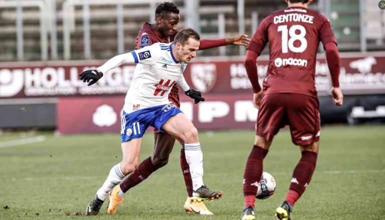 345 Le FC Metz recevait ce dimanche et pour le compte de la 25ème journée de Ligue 1, son éternel rival Alsacien dans un derby du Grand Est très attendu des supporters et dans un stade Saint Symphorien malheureusement vide pour ce classique du foot français. Avant le coup d’envoi, dix points séparaient l’actuel 16ème du championnat, le Racing Club de Strasbourg Alsace, et le FC Metz qui pointait à la 7ème position avec 35 pions au compteur. Il n’était pourtant pas question de prendre ce match à la légère pour les Messins face à des voisins Alsaciens privés de victoire depuis 5 matchs et qui avaient à cœur de briller dans un derby qui pour certains n’en a plus que le nom. Les hommes de Frédéric Antonetti qui restaient sur une défaite à Saint-Etienne et une qualification laborieuse en coupe de France, se devaient d’assoir encore un peu plus la supériorité du FC Metz dans le bras de fer historique qui oppose les deux clubs. De leur côté, les ultras messins privés de stade avaient bien pris la mesure de l’évènement et accueillaient leurs guerriers comme il se doit deux heures avant le coup d’envoi. #FCMRCSA [ 𝕀𝕟𝕤𝕚𝕕𝕖 ]📍La plus belle des escortes pour emmener nos Grenats jusqu’à Saint-Symphorien. Merci 🔥 pic.twitter.com/hxNXBwQ2y2— FC Metz ☨ (@FCMetz) February 14, 2021 Les hostilités pouvaient donc commencer sous le soleil radieux d’une Saint Valentin entre les deux formations phares du Grand Est. Pas de surprises au niveau des compositions, le tacticien Corse reconduisait son 3-4-3 habituel. A noter du côté strasbourgeois, les titularisations de d’Eiji Kawashima et d’Habib Diallo, de retour en Terre Sainte le temps d’un après-midi. Contre toute attente, les messins allaient d’entrée de jeu poser le pied sur le ballon et imposer une grosse pression sur le camp Alsacien. Trois corners en cinq minutes et le monopole du jeu pour les grenats avant que les débats ne s’équilibrent un peu. Il s’en fallait de peu pour qu‘Habib Diallo ne reprenne une balle dans la surface (15′) mais John Boye veillait fort heureusement au grain. Quelques instants plus tard, bien servi par Papa N’Diaga Yade, Thomas Delaine crucifiait le portier Strasbourgeois (17′) et récompensait l’excellent début de match des hommes de Frédéric Antonetti. Le derby était lancé. Acculés dans les premières minutes de jeu, les visiteurs allaient pourtant retrouver leur allant et égaliser par l’inévitable Adrien Thomasson (32′) sur un cafouillage de la défense grenat. Les deux équipes proposaient alors un football complet, se rendant coup pour coup jusqu’à la pause.Au retour des vestiaires, les Lorrains reprenaient comme ils avaient démarré le match, avec une première opportunité de la tête par Papa N’Diaga Yade (47′). Habib Diallo répondait de même sur un coup franc de Dimitri Liénard (48′). Depuis la sortie sur blessure du jeune Pape Matar Sarr en fin de première mi-temps, les grenats semblaient plus en difficulté jusqu’à cette nouvelle chevauchée de Thomas Delaine (59′) qui butait cette fois sur l’international japonais. Peu d’occasions hormis cela dans cette seconde période où les messins ont multiplié les approximations et concédé le jeu à des Strasbourgeois plus en vue. Alexandre Oukidja était tout content de voir le tir de Jean-Eudes Aholou passer à côté de sa cage (80′) mais le couperet allait quand même tomber quelques instants plus tard par Adrien Thomasson (84′), encore lui, qui permettait aux Strasbourgeois de prendre l’avantage. Avantage que les blancs et bleus allaient garder jusqu’au bout. Score final 1-2.Malgré un début de match prometteur, les messins sont passés à côté de leur derby et même s’il n’y a pas encore de conséquences graves au classement, il faudra se reprendre après deux revers consécutifs et ce, dès dimanche prochain avec un périlleux déplacement à Nice. Crédits photos : RCSA Officiel (image à la une et composition RCSA); FC Metz Officiel (Composition FCM) et Julien Buret (Supporters messins)