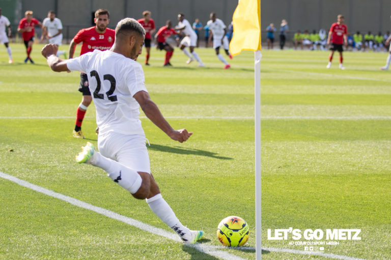 265 Après 132 jours sans le moindre match, le FC Metz a retrouvé le chemin des terrains ce vendredi, face à son club satellite de Seraing, entamant ainsi une salve de 6 matchs de préparation. Le moins que l’on puisse dire c’est que les Grenats ont fait le job, puisqu’ils se sont imposés sur le score fleuve de 4-1. Résumé de la rencontre ainsi que les premiers enseignements qu’il faut en tirer. Après une si longue attente, nul doute que les Grenats avaient à coeur de bien faire lors de cette première rencontre de préparation face au RFC Seraing. Pour l’occasion, Vincent Hognon a dérogé à son traditionnel 4-3-3 pour mettre en place un 4-2-3-1 résolument plus offensif, avec les hommes suivants :Oukidja – Centonze, Lacroix, Boye (cap.), Udol – Pajot, Angban – Gueye, Boulaya, Yade – NianeA noter l’absence significative d’Habib Diallo, présent en civil sur le bord du terrain mais absent de la feuille de match. Vincent Hognon révélera plus tard que l’attaquant a été préservé mais que malgré son bon de sortie, nous le reverons bel et bien avec le maillot du FC Metz lors d’un futur match de préparation. De son côté, Vagner, en pleine rééducation, a observé le match avec intérêt.Côté Seraing, les prêtés Dietsch, Lahssaini et Mikautadze étaient titulaires, tandis que Yann Godart et Amadou Dia N’Diaye figuraient sur le banc. Abou Lô n’était pas sur la feuille de match. L’attaquant Vagner Dias et le gardien Yassine Gourari-Tebaa, attentifs à la rencontre Première mi-temps Malgré une frayeur en tout début de rencontre suite à un dégagement d’Oukidja contré par Mikautadze, qui a bien failli finir au fond des filets (3′), le FC Metz a rapidement pris les devants grâce à un but d’Ibrahima Niane (6′) qui a parfaitement suivi une frappe de Lamine Gueye s’écrasant sur le poteau de Guillaume Dietsch. (6′, 1-0)Le nouveau président d’honneur du FC Niane a même bien failli obtenir un penalty quelques minutes plus tard à la suite d’un rush déterminé de Pape Ndiaga Yade sur le côté gauche mais l’arbitre n’a pas bronché.La récompense viendra plus tard pour Pape Ndiaga Yade qui profite d’un Guillaume Dietsch bien trop avancé pour marquer d’une superbe frappe enroulée des 30 mètres, bien servi par une longue ouverture de Farid Boulaya, positionné dans un nouveau rôle de numéro 10, ornant ce symbolique numéro dans le dos. (27′, 2-0)Ce nouveau positionnement semble en tout cas convenir à Boulaya qui s’est rendu très disponible dans le cœur du jeu, de bonne augure pour la suite.Très actif, le premier buteur de la rencontre Ibrahima Niane poussera une nouvelle fois son adversaire à l’erreur et volera un ballon décisif aux abords de la surface de Seraing, avant de servir sur un plateau Vincent Pajot, qui n’a plus qu’à conclure du plat du pied. (40′, 3-0)Les hommes de Vincent Hognon auraient même pu quadrupler la mise si Guillaume Dietsch ne s’était pas employé en sortant un coup franc excentré très malicieux de Farid Boulaya d’une claquette. Cette première mi-temps s’est achevée sur un score net et sans bavure de 3-0 pour le FC Metz. Deuxième mi-temps Pour ce retour aux affaires, Vincent Hognon procède à 10 changements. La composition messine en seconde période fut la suivante :Delecroix – Lacroix, Bronn, Fofana, Delaine – Traoré, Maiga (cap.), Maziz – Sabaly, Ambrose, NguetteAlors que l’on pouvait penser que le 4-2-3-1 vu en première période allait perdurer, Hognon est revenu à son classique 4-3-3, voulant ainsi essayer Habib Maïga en sentinelle devant la défense ainsi que Youssef Maziz dans une position de milieu relayeur gauche, lui qu’on a plus l’habitude de voir sur une aile.La prestation du jeune milieu qui a tout récemment prolongé son contrat avec le FC Metz fut néanmoins très intéressante ! Aidant Maïga et Traoré à la récupération, il s’est également montré précieux dans sa projection vers l’avant et sa relation avec Thomas Delaine. Une piste intéressante pour l’avenir. Thierry Ambrose certes incisif à la pointe de l’attaque, présent dans les duels mais peu inspiré dans la finition, ne trouve pas le chemin des filets. Et Geroges Mikautadze en profitera pour réduire la marque d’un coup franc sublime, imparable pour Paul Delecroix. (65′, 3-1)Les rouges et noirs feront entrer en jeu Yann Godart pendant que côté messin, Lamine Gueye fera son retour dans le match au poste d’arrière droit, pour remplacer Lenny Lacroix, fortement secoué dans un duel. Le jeune défenseur aura réalisé une prestation aboutie avec notamment un gros retour défensif (43′) par l’intermédiaire d’un tacle dans la surface, mais doit encore muscler son jeu avant de devenir le très bon défenseur que l’on attend.Suite à cela, Thomas Delaine et Opa Nguette se joueront de la défense belge d’une combinaison sur le côté gauche pour aggraver le score. Nguette n’a plus qu’à conclure suite au centre en retrait millimétré de son compère de la gauche. (75′, 4-1)La rencontre s’achève sur ce large score de 4-1 en faveur du FC Metz. Les hommes de Vincent Hognon n’ont pas vraiment tremblé face au RFC Seraing, malgré quelques parades aisées d’Alexandre Oukidja et plusieurs situations chaudes des belges, souvent initiées par Georges Mikautadze. Les tops S’il est bien trop tôt pour tirer des conclusions sur le niveau de jeu global de l’équipe, certains joueurs ont tout de même retenu notre attention lors cette première rencontre amicale. Farid Boulaya Dans un nouveau rôle de numéro 10 en soutien d’Ibrahima Niane, Farid Boulaya s’est beaucoup fait remarquer dans la construction du jeu. Auteur d’une passe décisive pour Pape Ndiaga Yade (27′), le milieu de terrain aura été à l’origine de beaucoup d’actions chaudes en première mi-temps. Ce repositionnement lui permet de toucher un maximum de bal