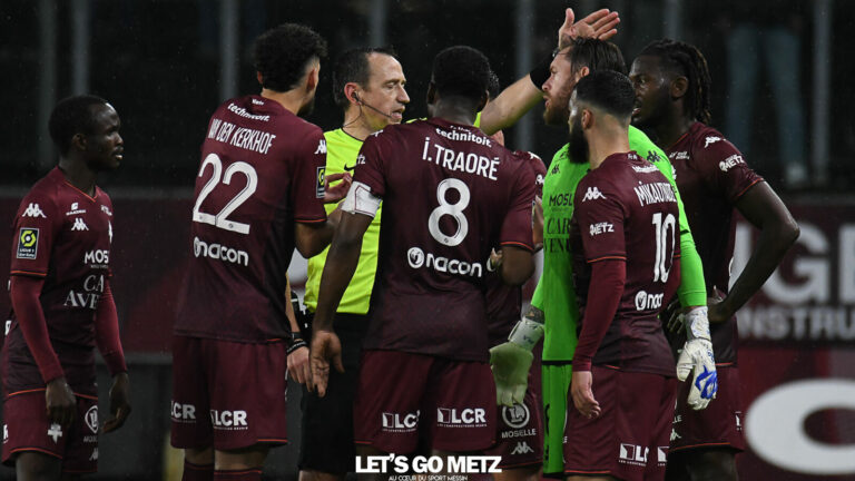 2,8K Le FC Metz s‘est cruellement incliné face au Stade Rennais ce samedi soir à Saint-Symphorien. Une défaite 3-2, très difficile à encaisser pour les Grenats qui pourraient être privés de leur buteur fétiche, à minima, lors du derby dimanche prochain à Strasbourg, si l’appel de la décision déposé par les dirigeants messins n’est pas retenu. La fête aurait pu être belle malgré la pluie ce samedi au stade Saint-Symphorien. Des buts, du spectacle, du public, de l’ambiance et une occasion en or de conforter une précieuse place de barragiste au détriment de Lorient, défait à Lens la veille. Mais les dieux du football sont décidément cruels lorsqu’il s’agit de récompenser les Grenats. Malgré une solidarité exemplaire, le FC Metz n’a pu se défaire du Stade Rennais et s’est incliné 3 buts à 2 dans les arrêts de jeu. Pire encore, les hommes de Laszlo Bölöni ont perdu Georges Mikautadze, exclu sévèrement dans les tous derniers instants du match. Alors qu’il s’était montré une nouvelle fois magique en inscrivant un but d’anthologie et en délivrant une merveille de passe décisive à Papa Amadou Diallo, l’international géorgien pourrait manquer, à minima, le déplacement au stade de la Meinau le weekend prochain. Un but, une passe décisive pour le roi Georges Après quelques minutes d’observation, le premier beau mouvement de la rencontre était à l’initiative de Papa Amadou Diallo, dont le centre ne trouvait malheureusement personne (5’). Le jeune Sénégalais, toujours préféré à Cheikh Sabaly et Didier Lamkel Zé, se montrait très à l’aise dès les premiers instants de la rencontre. Rennes, de son côté, réagissait rapidement mais la défense messine composée de Maxime Colin, Ismaël Traoré, Christophe Hérelle et surtout Fali Candé en lieu et place de Matthieu Udol (blessure), tenait bon. Alexandre Oukidja se montrait quant à lui rapidement rassurant dans ses prises de balles. Puis vînt la dix-septième minute de jeu. Malgré une nette domination bretonne, les joueurs du club à la Croix de Lorraine parvenaient à ouvrir la marque sur un coup de génie du roi Georges Mikautadze. Sur une ouverture millimétrée de Ablie Jallow, l’international géorgien lobait Steve Mandanda des vingt mètres en position excentrée. Un nouvel exploit personnel du numéro 10 grenat qui ne manquait pas d’enflammer Saint-Symphorien. Mais cinq minutes plus tard, première douche froide de la soirée. Christophe Hérelle détournait involontairement le ballon dans ses propres filets sur une frappe d’Amine Gouiri et, comme à son habitude, le FC Metz ne parvenait pas à garder l’avantage au tableau d’affichage face à un Stade Rennais particulièrement offensif. Largement dominateurs, les Bretons multipliaient par la suite les assauts sur la cage messine. Mais le portier grenat s’employait et maintenait héroïquement un score de parité. Si la différence de qualité technique entre les deux équipes semblait criante dans ce premier acte, le toucher de balle d’Arthur Atta, combiné à celui d’Ablie Jallow et du roi Georges, offrait au public messin quelques beaux frissons. Et alors que l’on se dirigeait tout droit vers la mi-temps, Georges Mikautadze débordait côté droit et offrait un caviar à Papa Amadou Diallo qui ne se privait pas pour crucifier l’ancien international de l’équipe de France (44’). Juste récompense pour le jeune transfuge de Génération Foot qui montait en puissance depuis quelques matchs. Contre le cours du jeu, avec du cœur et un brin de réussite, le FC Metz reprenait l’avantage sur le Stade Rennais juste avant la pause. Faits de jeu et cruel scénario Au retour des vestiaires, les Rennais accentuaient leur domination. Mais c’est bien Fali Candé, sur une belle contre-attaque, qui lançait les hostilités avec une frappe de trente mètres détournée par Steve Mandanda (47′). Acculés dans leur camp, les hommes de Laszlo Bölöni se montraient en revanche très incisifs et dangereux dans leur transitions. Le rythme baissait clairement en intensité jusqu’à la soixantième minute de jeu, lorsque les Rennais butaient une nouvelle fois sur Alexandre Oukidja. Sentant que son équipe commençait à plier, le public de Saint-Symphorien donnait alors de la voix. Sur une contre-attaque éclair de Georges Mikautadze, Papa Amadou Diallo était à deux doigts d’inscrire un doublé mais sa frappe était détournée de justesse par Arthur Theate. Dans le football, tout va très vite et le jeune attaquant grenat aurait été bien inspiré de transformer l’offrande puisque quelques instants plus tard, l’arbitre de la rencontre, Ruddy Buquet, commençait sa discutable partition et sanctionnait une prétendue faute d’Ismaël Traoré dans la surface (72’). Benjamin Bourigeaud ne se faisait pas prier et ramenait les deux équipes à égalité sous les sifflets du stade. Les esprits s’échauffaient quelque peu et Christophe Hérelle écopait même d’un carton jaune. D’un but à l’autre, la partie s’emballait et Alexandre Oukidja devait à nouveau sortir le grand jeu (80’). Les Grenats donnaient tout jusqu’à la fin et prenaient un maximum de risques pour reprendre l’avantage. Mais le football est décidément cruel. Au cours d’interminables arrêts de jeu (8mn), Arnaud Kalimuendo offrait la victoire aux Bretons sur une contre-attaque rapide. Quelle ironie… le FC Metz pris à son propre jeu par le Stade Rennais. Quelques instants plus tard, Georges Mikautadze, sans doute excédé par les gestes d’antijeu répétés et non sanctionnés des Rennais, bombait le torse devant Kalimuendo. Le joueur rennais percutait le Géorgien et s’écroulait de manière grossière. Sans hésiter, l’arbitre sortait le carton rouge à l’encontre de l’attaquant grenat. Déjugé quelques instants plus tard par le VAR, Ruddy Buquet ne revenait finalement pas sur sa décision, sa