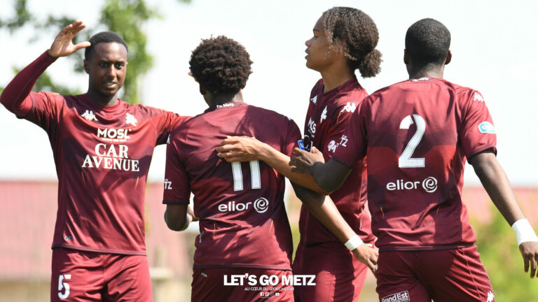 1,2K Une victoire (U17), un nul (U19) et une défaite (équipe réserve) pour la formation du FC Metz ce week-end. Les U19 et les U17 ont disputé leur dernier match de la saison tandis que l’équipe réserve tentera de sauver sa peau en National 3 le week-end prochain. Dans la course au maintien, le FC Metz affrontait l’ASM Belfort ce samedi. Face à ce concurrent direct, les Messins avaient l’occasion d’assurer leur place en National 3 avec une victoire à l’extérieur. Il n’en fut rien.Après une première période assez équilibrée, sans le moindre but de part et d’autre, le match prenait rapidement une tournure cauchemardesque pour les Messins. Ils encaissaient deux buts coup sur coup : un premier d’Adrien Delphis (54′), puis un second de Dione Da Silva (60′). En quête de réaction de la part de son groupe, Sylvain Marchal décidait de réaliser quelques ajustements tactiques pour tenter de revenir au score. Des changements fructueux puisque Théo Ahile, entré à la 60ème minute de jeu, permettait aux siens de réduire l’écart quelques minutes plus tard sur un joli corner (79′). Malgré ce sursaut d’orgueil en fin match et la présence de Malick Mbaye, seul renfort professionnel, le FC Metz n’est pas parvenu à accrocher le point du match nul. Une défaite décevante 2 buts à 1 pour les Grenats qui devront fournir encore un dernier effort. Crédit photo : Mikaël Franck/LGM Pour valider leur ticket pour la saison 2024-2025 en National 3, le FC Metz (10e) devra remporter son dernier match, le week-end prochain face à Reims Sainte-Anne. L’objectif étant de gagner afin que son sort ne se retrouve pas entre les mains des concurrents directs au maintien, dans une 26e journée de championnat qui promet d’être intense. Pour rappel, les trois derniers de chaque poule de N3 seront relégués, tout comme les quatre plus mauvais 11e toutes poules confondues. Pour s’épargner tout calcul d’apothicaire, autant l’emporter. U19 : Lyonnais et Messins se neutralisent Après une défaite frustrante face à Troyes le week-end dernier, le FC Metz devait réagir pour éviter de rejoindre les profondeurs du classement. Pour le dernier match de la saison, l’adversaire du jour laissait imaginer une défaite pour la formation messine. La rencontre débutait très mal pour eux puisque l’Olympique Lyonnais ouvrait le score très tôt (0-1, 5′). En réaction, les Messins devaient rapidement revenir au score pour éviter de voir les Gones prendre le large. C’était chose faite grâce à Léo Montout qui faisait trembler le filet adverse et permettait aux siens de recoller au score (1-1, 32′). Cette égalisation installait le doute dans les têtes lyonnaises puisqu’ils ne parvenaient plus à trouver de failles dans la défense messine. Finalement, le match s’achevait sur le score d’un but partout. Pour les U19 du FC Metz, ce match nul peut être une satisfaction, parce qu’ils sont parvenus à déjouer les pronostics en accrochant un point face à une belle formation lyonnaise. Les Messins terminent donc le championnat dans le ventre mou et se classent à la 7ème place avec 33 points. Crédit photo : Mikaël Franck/LGM U17 : le FC Metz clôture le championnat en beauté Ce dimanche, les U17 du FC Metz se déplaçaient à Andrézieux pour disputer leur dernier match de championnat. Au terme d’une rencontre à sens unique, les Grenats se sont imposés 6 à 0 et n’ont fait qu’une bouchée de leur adversaire du jour. Nathan Mbala lançait les hostilités dès la 12ème minute (0-1), ses partenaires suivaient la danse et enchaînaient les buts. Jahyann Pandore (0-2, 30′), Bryan Madjo (0-3, 47′) et le malheureux Ibrahim Fitouri (contre son camp, 0-4, 65′) permettaient au FC Metz de prendre le large au score. Pour terminer cette belle rencontre, Marco Amah Tchoutchoui, entré en jeu à la 60ème minute, s’offrait un doublé en quelques instants (0-5, 70′ – 0-6, 75′). Les Messins reviennent en terre mosellane avec une victoire nette et sans bavure qui leur permet de clôturer le championnat à la 4ème place avec 45 points. Crédit photo : Mikaël Franck/LGM Crédit photo : Image à la une : Mikaël Franck/LGM