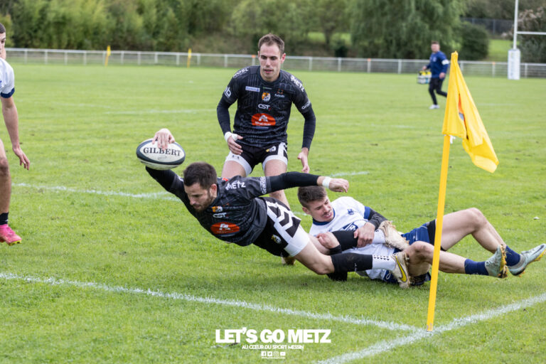 932 A domicile, le RC Metz n’a pas su contrer la puissance de frappe d’Haguenau. En-dessous dans presque toutes les phases de jeu, les Messins ont logiquement concédé leur première défaite de la saison (24-33). La semaine dernière, le XV du RC Metz concédait le nul en fin de match face à Epernay. De retour à la Grange-aux-Bois, l’équipe d’honneur du RC Metz recevait Haguenau, une des grosses écuries de ce championnat de Fédérale 3. Dans leur nouveau maillot, les Noirs ont subi la loi des Haguenoviens, qui ont largement dominé la rencontre. Un gros écart de niveau Dès le coup d’envoi, le RC Metz profitait d’une faute de leur adversaire pour ouvrir le score (3-0, 1′). La copie parfaite d’Alexandre Fabre en buteur serait un des points positifs de la journée. Mais la réaction haguenovienne n’a pas tardé. Une pénalité marquée (5′) puis deux essais sur des débordements du côté gauche (7′, 16′) leur permettaient de faire le break (3-15). La faiblesse messine se manifestait par un cumul de fautes en défense, et le troisième ligne Kimmel écopait un carton jaune (23′) qu’Haguenau venait agrémenter d’une nouvelle pénalité marquée (3-18). Paradoxalement, c’est en infériorité numérique que le XV du RC Metz a montré son meilleur visage, avec un gros temps fort dans les dix dernières minutes de la première mi-temps. Les avants prenaient le jeu à leur compte avec du ‘pick and go’ et des lancements simples à une passe. Recroquevillés dans leur moitié de terrain, les Haguenoviens concédaient un essai transformé (32′, 10-18) avant de profiter d’une perte de balle messine pour marquer en contre (34′, 10-23). L’action du match prenait place juste avant la mi-temps. Une touche messine, à plus de 20 mètres de l’en-but haguenovien. Un ballon porté parfaitement mené, où toute l’équipe messine ne faisait qu’un et écrasait le pack adverse pour réduire la marque. Mi-temps (17-23). La deuxième mi-temps était beaucoup moins disputée. Les Messins sont restés maladroits dans le jeu de main, et ont perdu leur mordant dans les duels. Haguenau envoyait constamment le jeu dans le camp messin, notamment avec des jeux au pied plus précis que leur adversaire. Deux essais (48′, 64′) mettaient fin aux espoirs des hommes de Hans Grobler (17-33). Finalement, les hommes en noir sauvaient l’honneur en inscrivant un bel essai sur une longue passe au pied vers l’aile, aplati avec rage par Léo Houplon. Le RC Metz aura l’occasion de se reprendre à domicile dimanche 13 octobre, face au Gretz Tournan Ozoir. RC Metz 24-33 Haguenau Résulats J3Classement Fédérale 3 Crédit Photo : Matthieu Henkinet / Let’s Go Metz