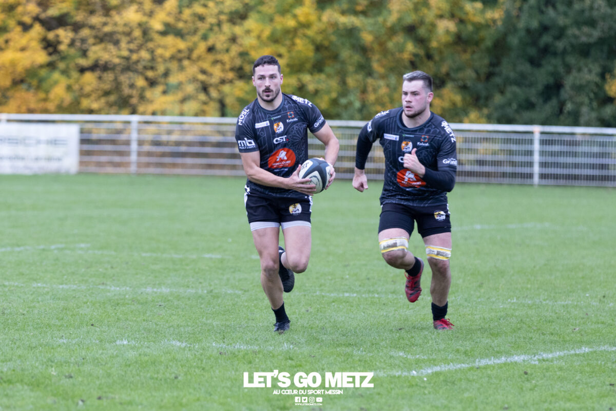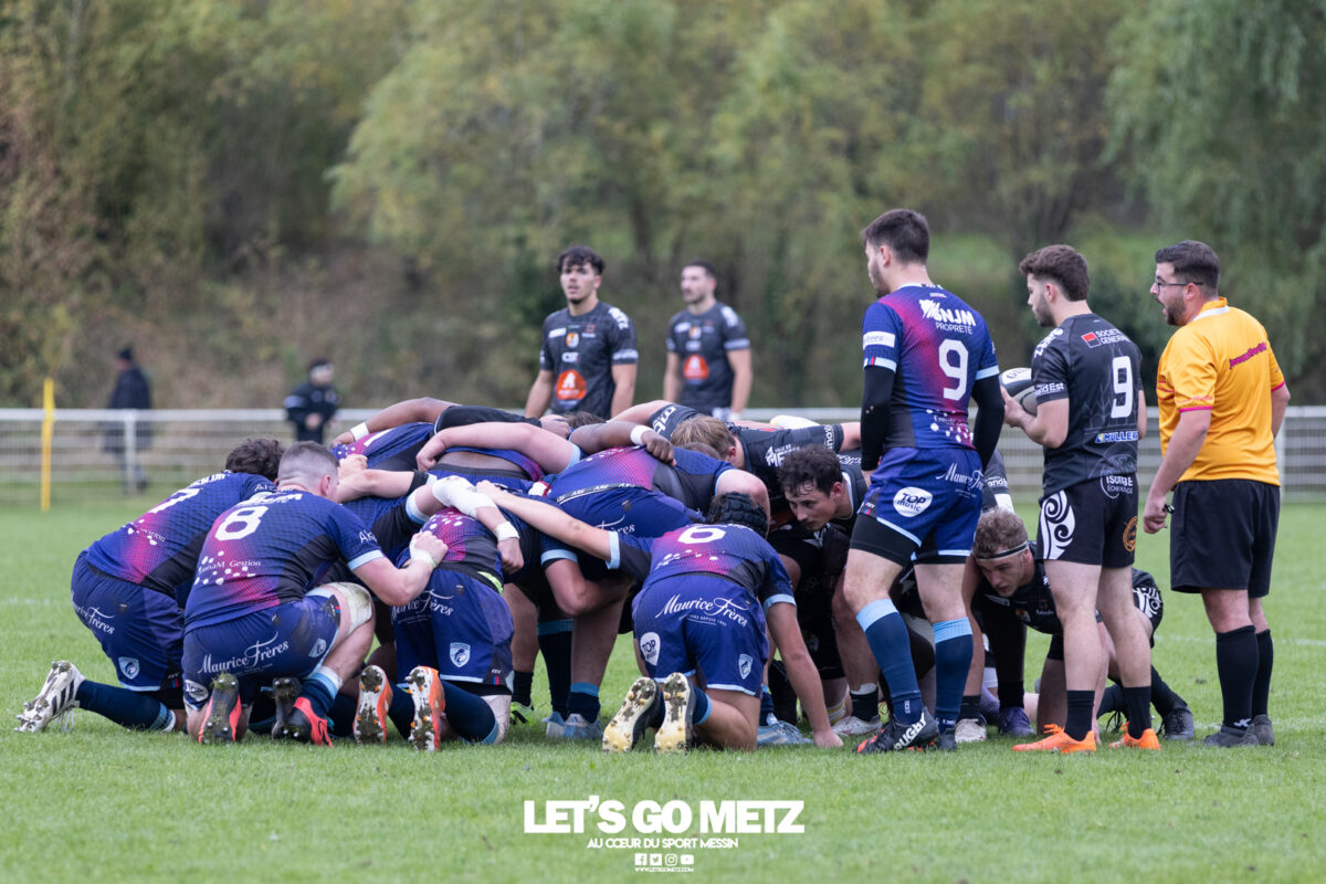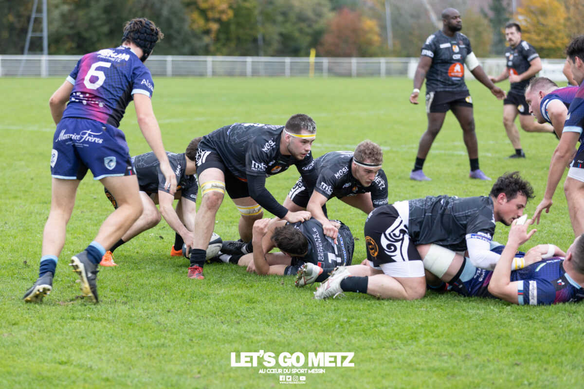 234 À l’occasion de la cinquième journée de Fédérale 3, le RC Metz Moselle recevait le Strasbourg Alsace Rugby. Malgré une bonne première mi-temps, les Messins s’inclinent 12 à 34. Une semaine après son match nul à Haguenau (31-31), le RC Metz Moselle avait l’opportunité de s’imposer à domicile face à un autre rival alsacien, Strasbourg. Les Strasbourgeois de Ludovic Mercier n’avaient pas encore remporté un seul match cette saison (3 matchs, 3 défaites). Une première mi-temps prometteuse pour Metz Crédit Photo : Matthieu Henkinet/Let’s Go Metz Après un début de match intense physiquement, le RC Metz ouvrait le score grâce à une pénalité de Gérard Sanchez (3-0, 11e). Quelques minutes plus tard, suite à un carton jaune côté strasbourgeois, Sanchez doublait la mise sur pénalité (6-0, 20e). Toutefois, les visiteurs ne disaient pas leur dernier mot puisqu’un essai transformé permettait aux Alsaciens de passer devant (6-7, 27e). Le joueur messin Sanchez inscrivait ensuite un triplé sur pénalité (9-7, 32e) mais le Strasbourgeois Flavier répondait en marquant également une pénalité (9-10, 36e). Malgré de bonnes intentions, les joueurs de Hans Grobler étaient menés à la pause. L’efficacité offensive strasbourgeoise met fin aux espoirs messins Crédit Photo : Matthieu Henkinet/Let’s Go Metz Moins de dix minutes après le début de la première période, Sanchez était l’auteur de la quatrième pénalité pour les Noirs (12-10, 49e). Cependant, la rencontre basculait en l’espace de six minutes. Avec trois essais inscrits, dont un transformé (57e, 60e, 63e), Strasbourg prouvait sa redoutable efficacité offensive et prenait quinze points d’avance sur les locaux (12-27). Sonnés par ce festival offensif, les rugbymen messins ne réussissaient pas à revenir à la hauteur du SAR et encaissaient même un dernier essai transformé en fin de match (12-34, 80e). Après cette quatrième défaite de la saison, le RC Metz devra réagir lors de la réception de Nancy-Seichamps Rugby, dimanche 2 novembre au Stade de la Grange aux Bois. RC Metz Moselle 12-34 Strasbourg Alsace Rugby RC Metz MosellePénalités : Sanchez (11e, 20e, 32e, 49e) Strasbourg Alsace RugbyEssais : Mariani (27e), Manse (57e), Merckel (63e), Bertrand (80e)Pénalités : Flavier (36e)Transformations : Flavier (27e, 63e, 80e) Classement Fédérale 3 Galerie photos de la rencontre Crédit Photo : Matthieu Henkinet/Let’s Go MetzCrédit Photo : Matthieu Henkinet/Let’s Go MetzCrédit Photo : Matthieu Henkinet/Let’s Go Metz Crédit photos: Matthieu Henkinet / Let’s Go Metz