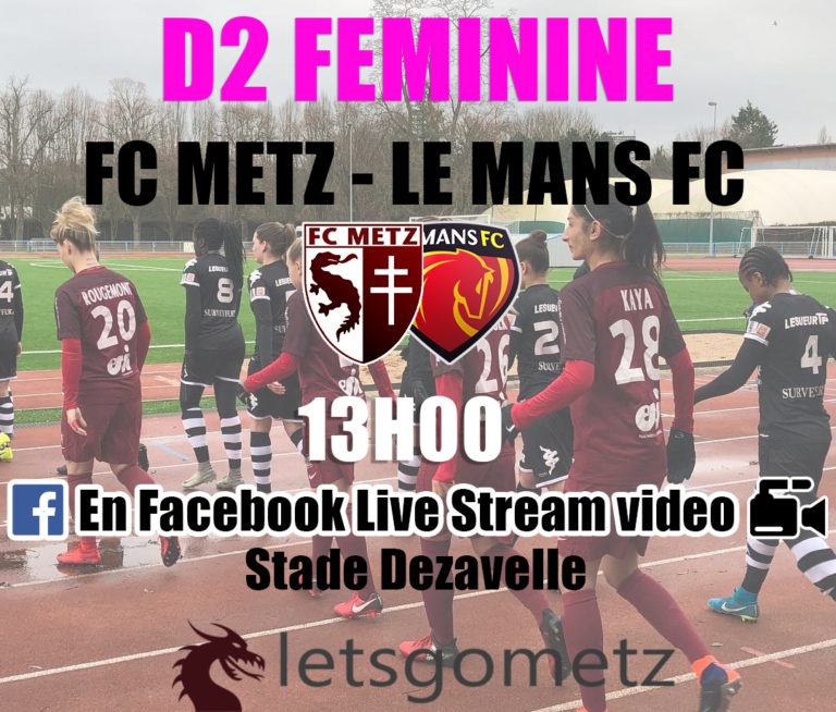 256 Nous retransmettrons le live streaming de la rencontre de D2 Féminine opposant le FC Metz au Mans FC sur notre page Facebook. Rendez-vous le dimanche 01 Avril à 13H00.