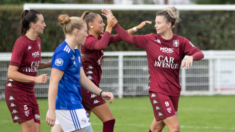 809 Dans le cadre de leur dernier match de préparation, les féminines du FC Metz se sont imposées 2-1 face au RC Strasbourg Alsace, grâce à un doublé de Kelly Koné. De quoi aborder de la meilleure des manières l’ouverture de la D2 Féminine la semaine prochaine. Au terme d’une préparation marquée par des victoires face au RFCU Luxembourg (3-2) et aux U15 de l’APM Metz (4-0), un nul face à Anderlecht (1-1) et une défaite à la Gantoise (0-1), les féminines du FC Metz se déplaçaient à Duppigheim en Alsace. Au programme, un « derby amical » face au RC Strasbourg Alsace et des retrouvailles avec deux anciennes grenats, Pauline Dechilly et Léa Munier. Le RCSA que les messines retrouveront dans leur groupe de D2F cette saison. Un vrai test donc pour les protégées de Jessica Silva. La compo messine Lerond – Kouache, Said (Rigaud 59′), Petitjean, Delabre (Calba 76′) – Picard, Gherbi, Morel, Rougemont– Connesson (Koné 66′), Boilesen Une première période timorée Le début de partie se traduisait par une domination messine en terme de possession. La première à se signaler fut Adèle Connesson (16′) mais la frappe des 25 mètres de l’attaquante grenat était repoussée par la gardienne. Le FC Metz allait néanmoins se faire surprendre par deux contres strasbourgeois. Justine Lerond s’interposa par deux fois, avec notamment un arrêt de grande classe sur la deuxième tentative alsacienne. (24′) Les lorraines se rebellaient par l’intermédiaire de Justine Rougemont, mais la frappe lointaine de la milieu de terrain fut sans danger (28′). De l’autre côté Aliya Saïd contrait une frappe strasbourgeoise après un corner mal repoussé (32′). Ces alertes traduisaient un FC Metz plus en difficulté depuis la demi-heure de jeu avec davantage de déchet technique dans le jeu des messines. A noter que le FC Metz aurait pu bénéficier d’un penalty à la 37ème. Marjorie Boilesen se faisait sécher dans la surface après un contact rugueux mais l’arbitre ne bronchait pas. Les deux équipes rentraient finalement aux vestiaires sur un score nul et vierge : 0-0. Une première période un peu terne, loin des standards des Grenats. Le réveil de la force messine De retour des vestiaires, les messines affichaient un tout autre visage. Plus conquérantes, les joueuses de Jessica Silva imprimaient le tempo. Néanmoins le FC Metz allait se faire surprendre en contre. Si Justine Lerond parvenait à sauver les siennes en face à face, elle ne pouvait rien sur un penalty des alsaciennes. Un coup de pied de réparation amplement justifié suite à un tacle non maîtrisé de Marine Morel sur Madeline Roth. (1-0, 58′)Ce fait de match n’entamait pourtant pas le moral des messines, toujours aussi joueuses. Marjorie Boilesen trouvait ainsi les gants de la gardienne suite à une frappe pleine d’instinct qui semblait partir dans la lucarne (64′). A force de pousser, le club à la Croix de Lorraine allait finir par faire plier le RCSA. Double buteuse, Kelly Koné a survolé la deuxième période après son entrée en jeu. Entrée en cours de jeu, Kelly Koné fit basculer la rencontre. Bien servie par Eva Kouache à la suite du superbe mouvement collectif, l’attaquante messine propulsait le ballon au fond des filets d’un coup de tête imparable ! (1-1, 76′)Quelques minutes plus tard, Kelly Koné s’offrait un doublé en profitant d’un ballon qui traînait à l’entrée de surface, l’avant-centre trouvait le petit filet de la gardienne strasbourgeoise, faisant donc basculer les siennes en tête. (2-1, 80′)Le FC Metz passait près de s’offrir un troisième but dans les dernières minutes, mais Justine Rougemont se heurtait à la portière adverse.Une victoire 2-1, où tout n’a pas été parfait, mais avec une seconde période fondatrice ! En effet, le FC Metz n’avait jusqu’alors rencontré que des équipes étrangères et une équipe U15 masculine. Le test face au RCSA, qu’elles retrouveront en D2F, a été passé avec brio par les messines ! « On se sent prêtes, on a hâte que le championnat démarre ! » A l’issue de la rencontre, Jessica Silva est revenue sur la prestation de son équipe. La tacticienne québécoise soulignait la belle deuxième période de ses joueuses, malgré les erreurs qui ont pu être commises : La première mi-temps a été compliquée mais en deuxième mi-temps j’ai retrouvé l’équipe grenat que je souhaitais voir ! Le but que l’on encaisse, c’est de notre faute. C’est une erreur qui remonte bien avant le penalty, on perd un ballon en milieu de terrain. On fera des erreurs cette année, il faudra juste mieux les gérer.Jessica Silva La coach messine, qui a insisté sur la deuxième période de cette rencontre face à Strasbourg, nous a également confié toute sa hâte de reprendre le championnat : On se sent prêtes, on a hâte que le championnat démarre ! Nous avons su être créatives sur cette deuxième mi-temps. On va surtout retenir cette deuxième mi-temps et le résultat positif.Jessica Silva Les féminines du FC Metz démarreront leur saison de D2F le 5 septembre prochain avec la réception de la Roche-sur-Yon à Dezavelle. Crédit photo : Julien Buret